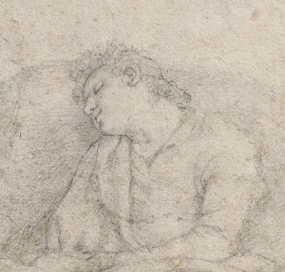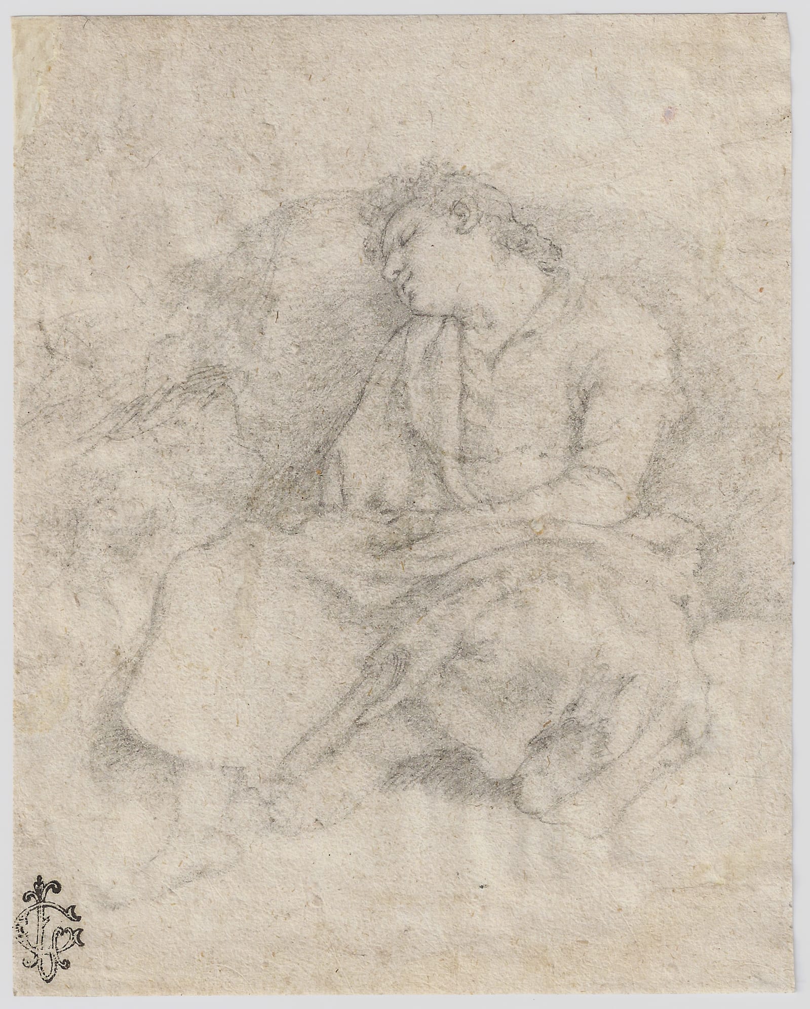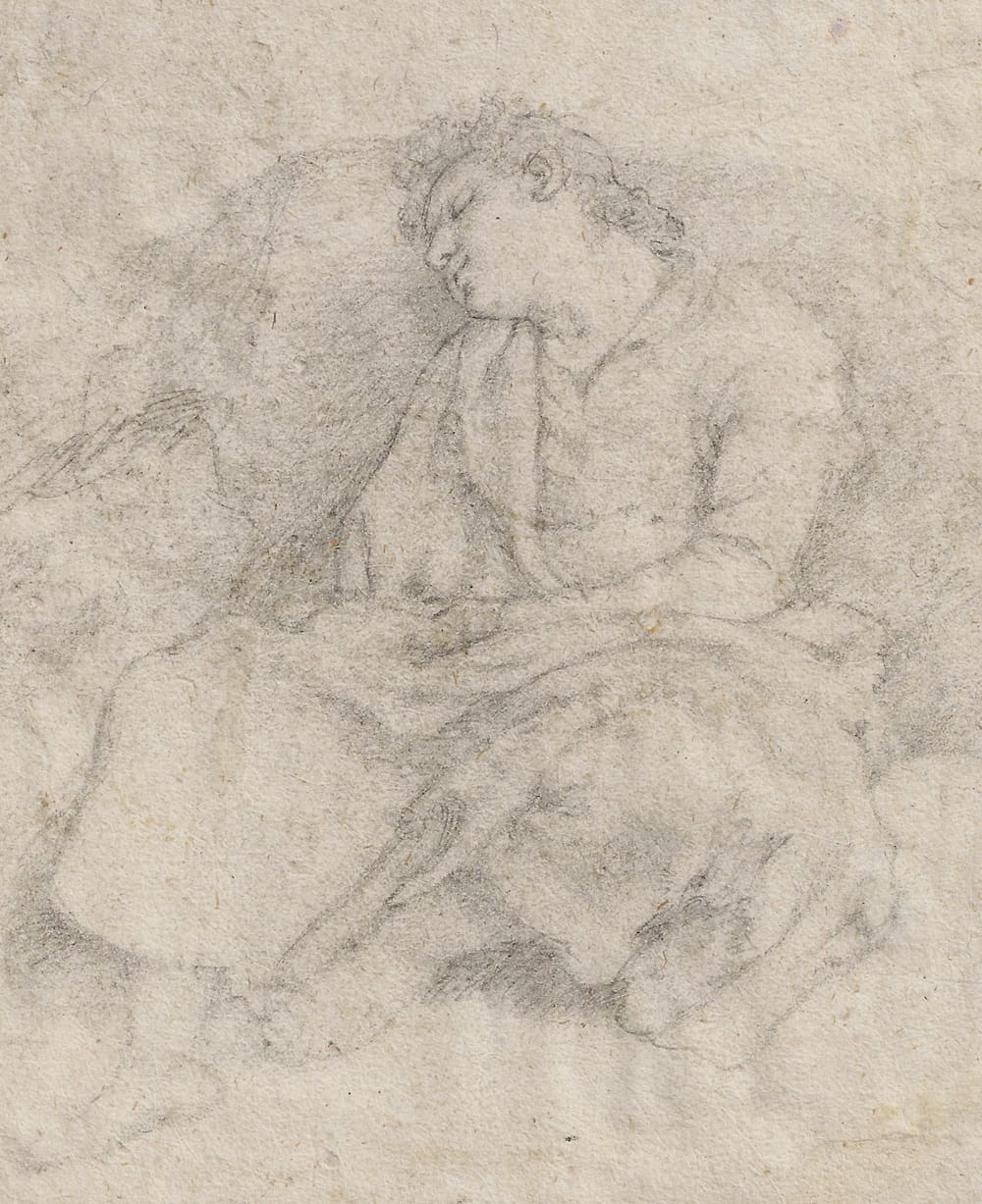 The art historian Stephen Ostrow has described Baglione’s drawings to ‘reveal a force and lyricism rarely found in his paintings’, and these words could have been spoken with the present drawing in mind.2 The chalk has been applied very lightly and there are areas where the darker shading creates a sfumato effect. This delicate use of the medium with soft tones is very evocative and touching, and appropriate to the intimate character of the subject of the drawing. The soft parallel hatching is reminiscent of the drawings of the Cavaliere d’Arpino, who was influential in Baglione’s artistic development.