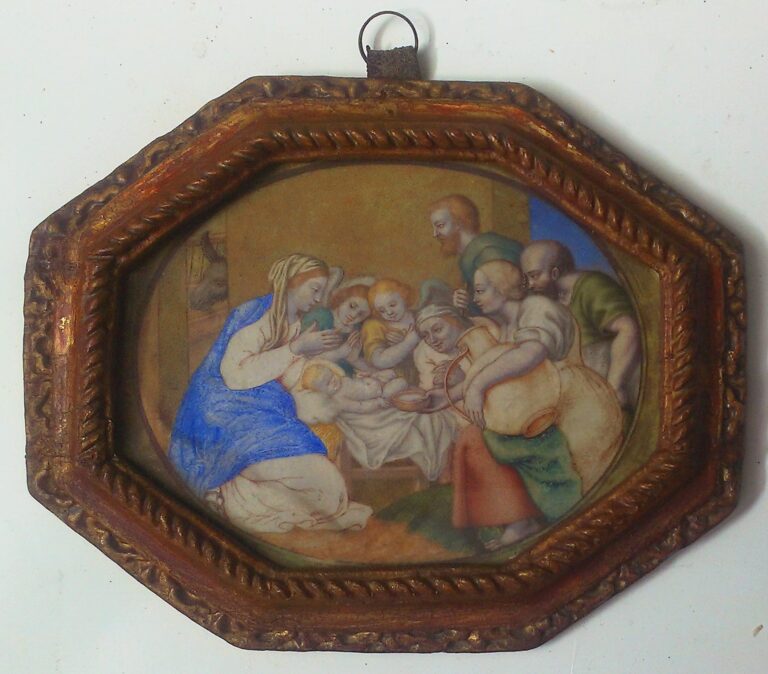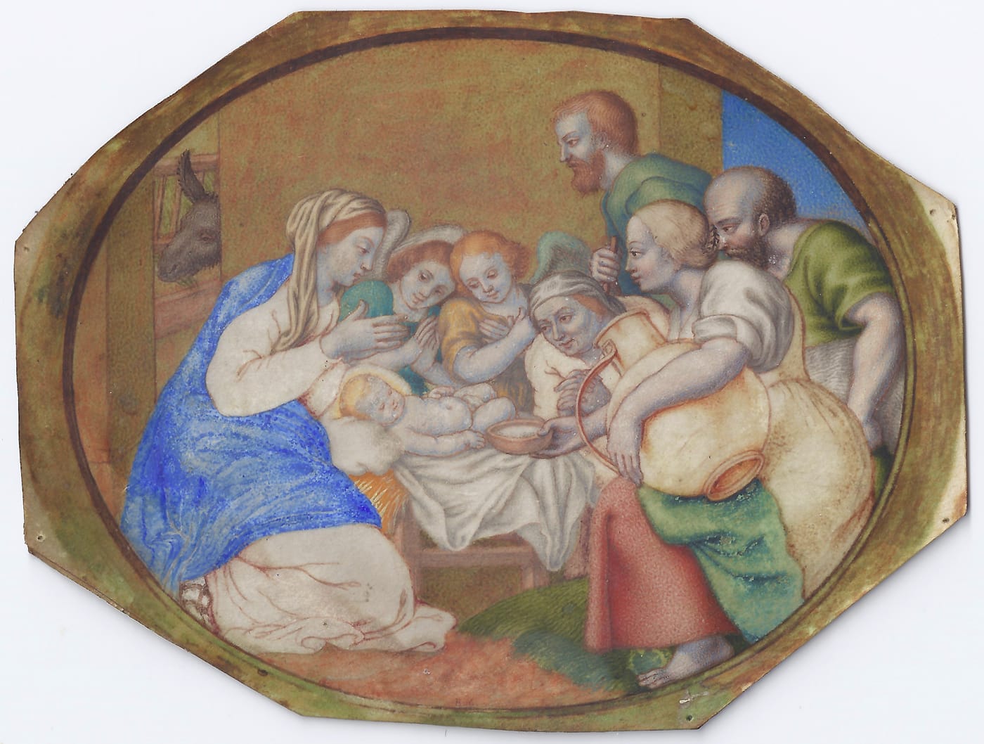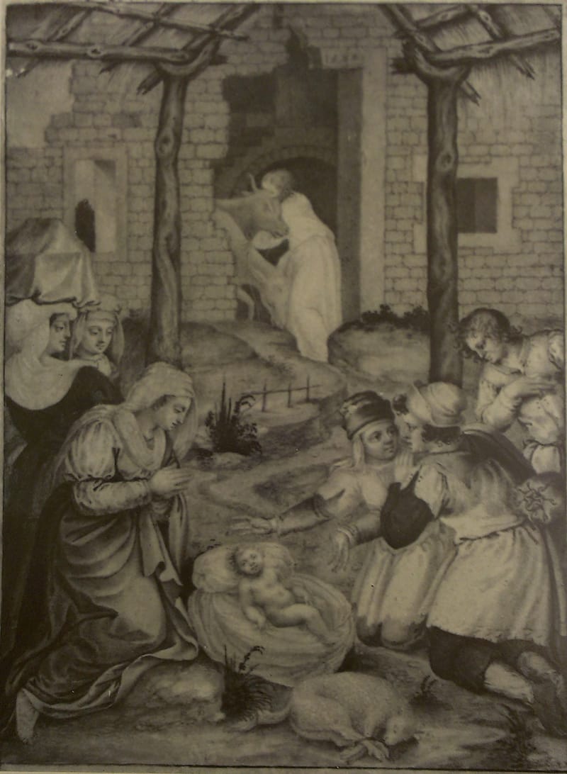 Among Castello’s most favoured compositions were depictions of the Adoration of the Shepherds and the Adoration of the Kings. Many examples exist, originally possibly used for private devotional purposes, although their owners would have been particularly entranced by their richness of colour and finesse of detail. An Adoration of the Shepherds of 1584 by Castello shows the Madonna in an almost identical position (fig.).3