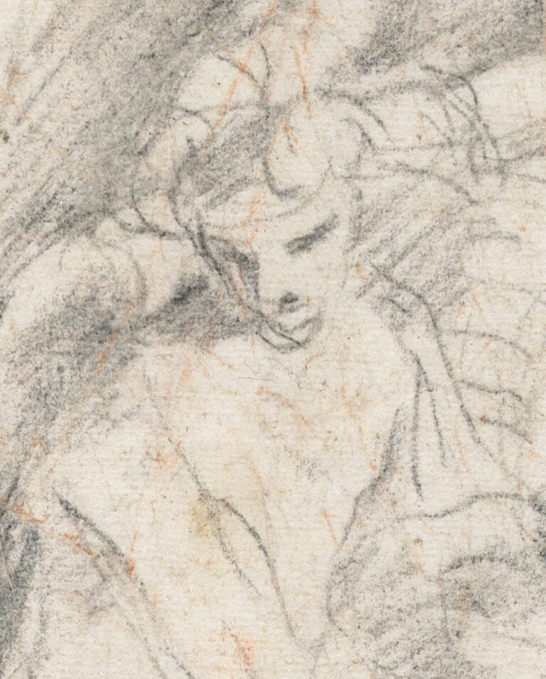 When this fast and assured drawing was sold by Christie’s in 2003, it was suggested that it could be connected with Lanfranco’s frescos in the dome of the church of Gesù Nuovo, Naples, which were executed from 1634 to 1635, but lost in an earthquake of 1688.2 Since then the sheet has however been correctly identified by Erich Schleier as a study for the ceiling fresco of the same subject in the apse of the Cappella Paganini in the Santa Maria in Vallicella in Rome, executed between December 1620 and April 1621 (fig.).3 The tapering shape of the fresco compartment is indicated in chalk on the drawing. A further study for the fresco is preserved in the Museum Kunst Palast in Düsseldorf, showing Christ’s captor at the right in greater detail (fig.).4 The irregular edges and ink and paint stains on our and the Düsseldorf drawing illustrate that these sheets did indeed function as working drawings during the painting process.