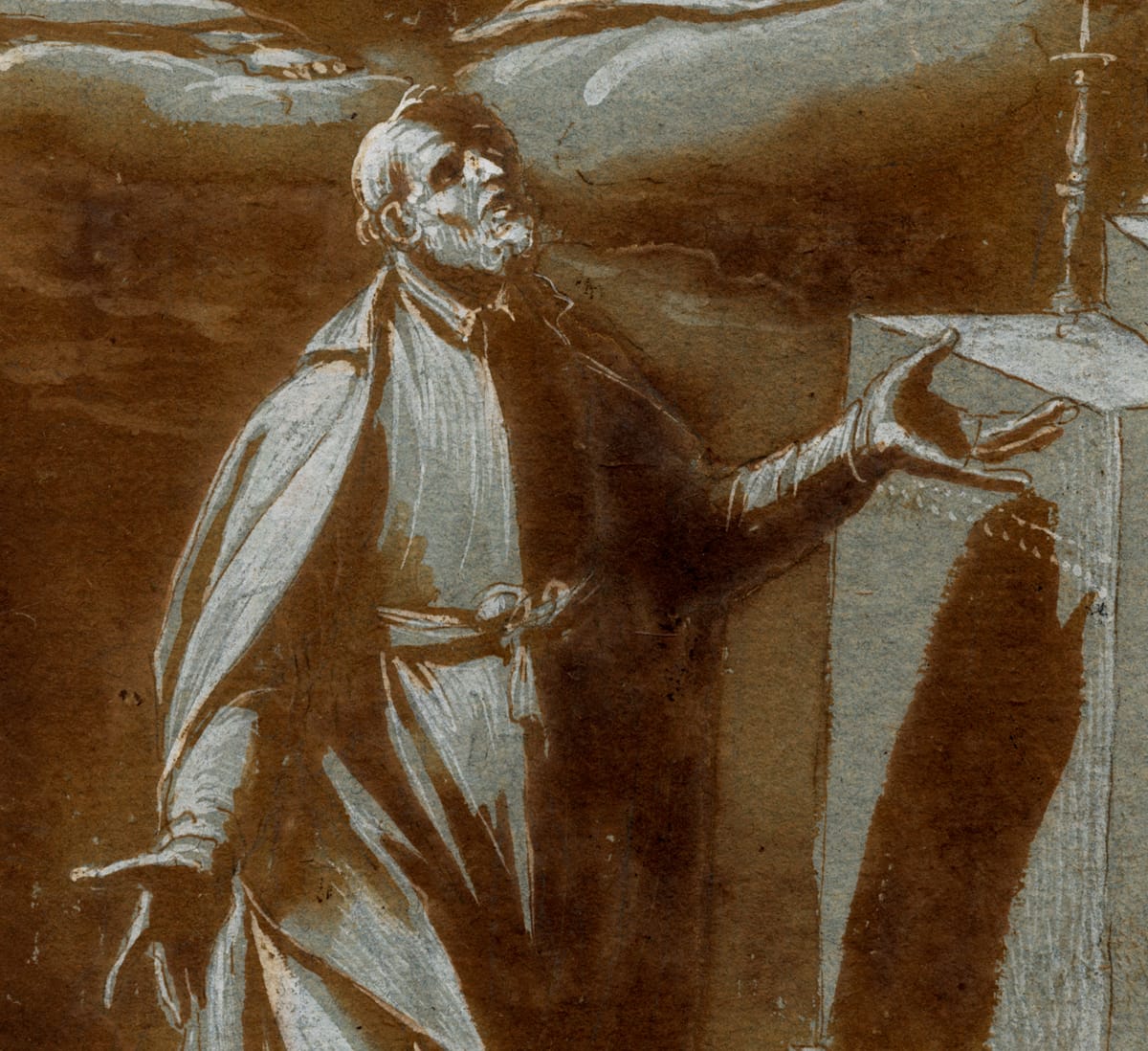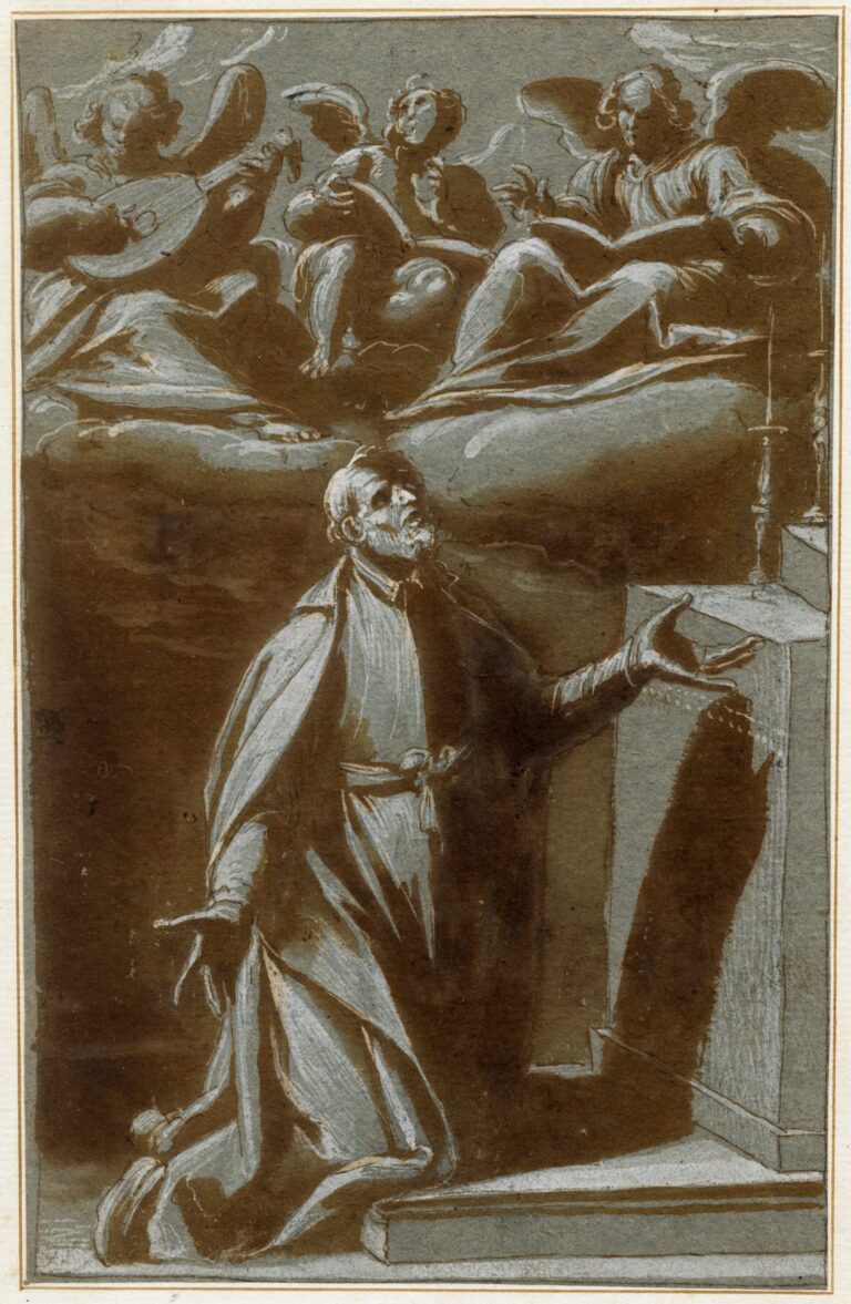 The deeply emotional and religious influence of the Counter-Reformation is clearly recognizable in this sheet, and indeed the saint depicted, Philippo Neri (1515–1595), known as the ‘Apostle of Rome’, a mystic who founded the Congregation of the Oratory, is one of the leading figures of the Counter-Reformation period. He was canonized in 1622, which occassioned an increase in his popularity, and it could be speculated that this drawing was executed around this period.