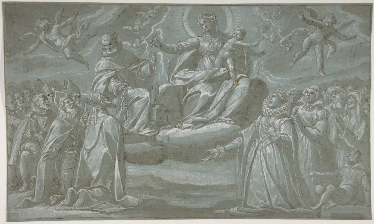 Our drawing may be compared, both in handling, technique and iconography, to a sheet depicting The Virgin and Child, Saint Dominic and Angels Distributing Chaplets to the Faithful, preserved in the Metropolitan Museum, New York (fig.).3 A further related drawing in the same technique of the Virgin and Child with Sts Francis of Assisi and Dominic is in the Accademia Carrara, Bergamo.4