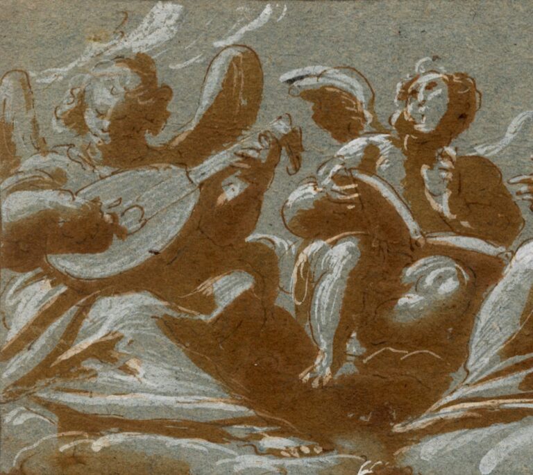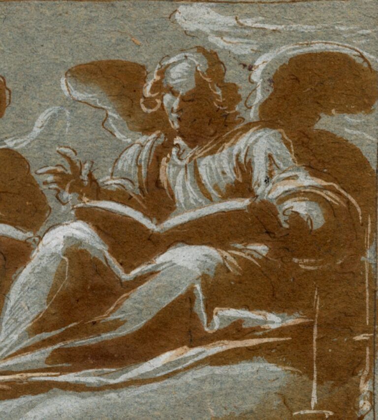 The present sheet with its lavish brown washes and heightening with white bodycolour on blue paper is characteristic of Mauro as a draughtsman, as are the figures with their typical round faces, wavy hair and hollow eyes. Some drawings by Mauro in this technique, from the collection of Padre Resta, are preserved in the Biblioteca Ambrosiana in Milan.2 Mauro’s compositions have been described as having the appearance of being frozen in action, and a similar feeling pervades our drawing.
