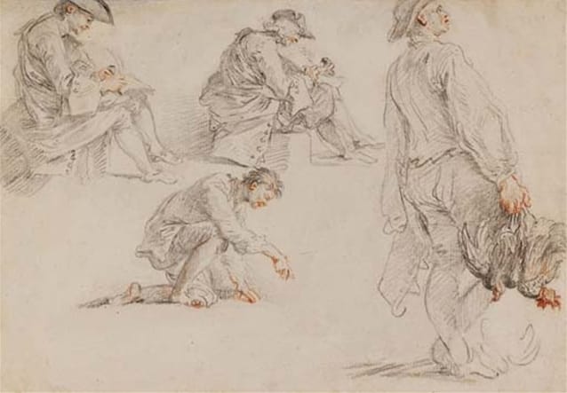 In order to give his architectural paintings a sense of scale and humanity, he added numerous figures to them, also called staffage. For these, studies from life in chalk and wash survive, which are little works of art in themselves. The British Museum and the Berlin Kupferstichkabinett hold sketchbooks by Panini with substantial groups of these studies.1 Our drawing is a rare document, as it can be related to a specific painted work: it is a study for a figure in Panini’s Ruins with the Temple of Saturn, dated 1739, in a private collection, Rome (fig.).2 The drawing must therefore have been executed before that date, presumably at some time during the 1730s. A sheet with four similar studies of figures was sold at Christie’s in 2007 (fig.).3