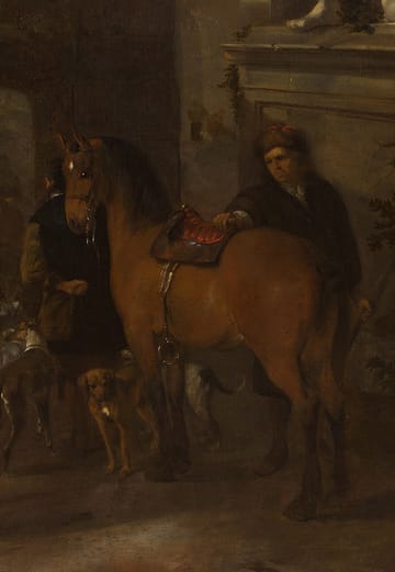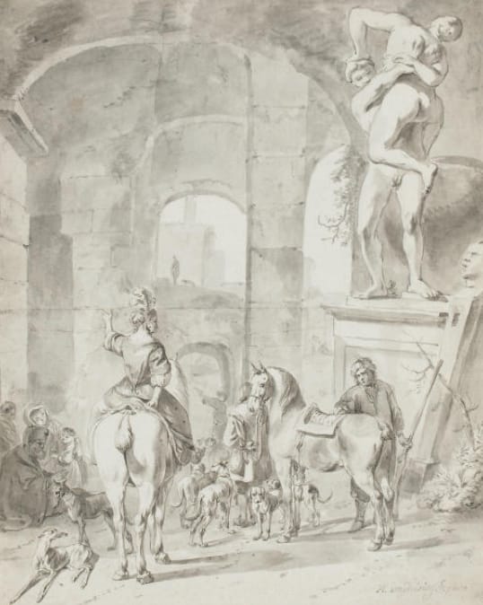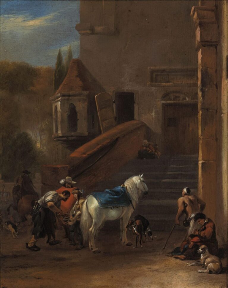 Hendrick Verschuring was born in Gorkum in 1627, the son of Willem Verschuring, a captain in the service of the Dutch Republic and ‘hopman’ or flag bearer of the ‘schutterij’ civic militia.1 At the young age of eight, he was sent to learn drawing from the portrait painter Dirck Govertsz, as was recorded by the artists’ biographer Arnold Houbraken. Afterwards, aged thirteen, he entered the studio of Jan Both, where he remained for six years. Both’s Italianate landscapes influenced him greatly and encouraged Verschuring to embark on a journey to Italy, recording his impressions in drawings. Verschuring remained in Italy for a long time, more than a decade according to some authors, but in actuality probably around five years, and upon his return North painted Mediterranean scenes with figures and horses.