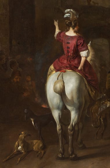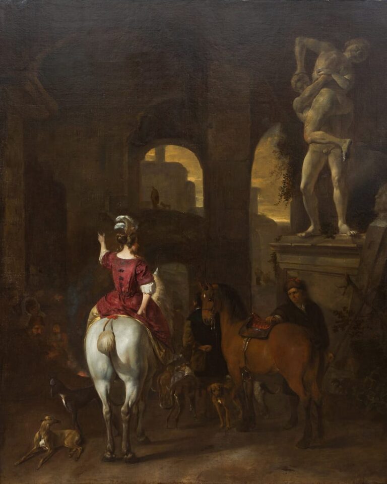 An Italianate Courtyard with a Lady on a Horse, the Rape of the Sabine Women in the Background