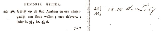 – Bernardus de Bosch II (1742–1816), Amsterdam; his sale, Amsterdam (Van der Schley … De Vries), 10 March 1817, Album F, no. 45: ‘Gezigt op de stad Arnhem en een wintergezigt aan stads wallen; met dekverw; ieder h. 3 3/8, br. 4 ½ d.’ (to ‘De Lelij’ for fl.18.10)