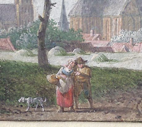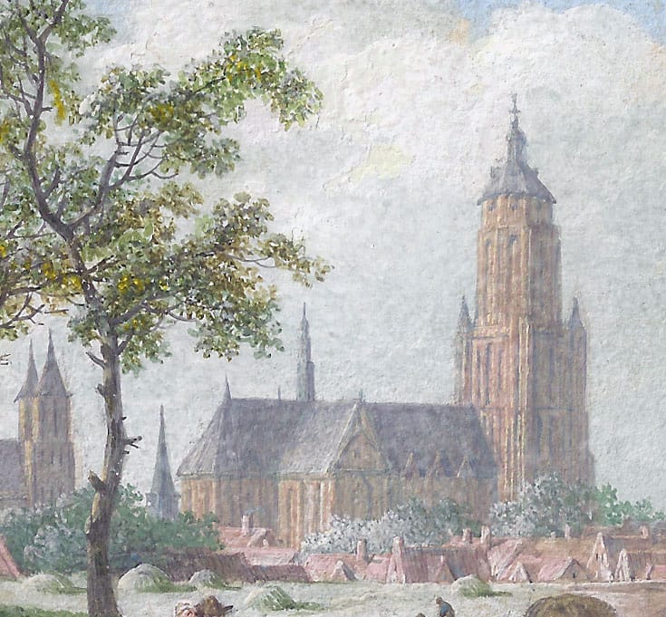 A peasant and his wife, accompanied by a dog, are walking along a sandy road on a summer’s day, while a cart laden with freshly mown hay is approaching the gates of an ancient town. The great Gothic cathedral dwarfs the picturesque burghers’ houses. The spires of several other churches suggest this is a city of wealth and prosperity. Although elaborately finished drawings of this sort often sprung from the artist’s imagination, in this case De Meijer has observed an actual scene: depicted is a view of Arnhem.1