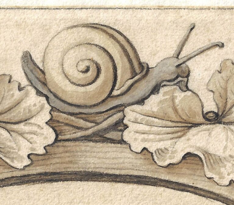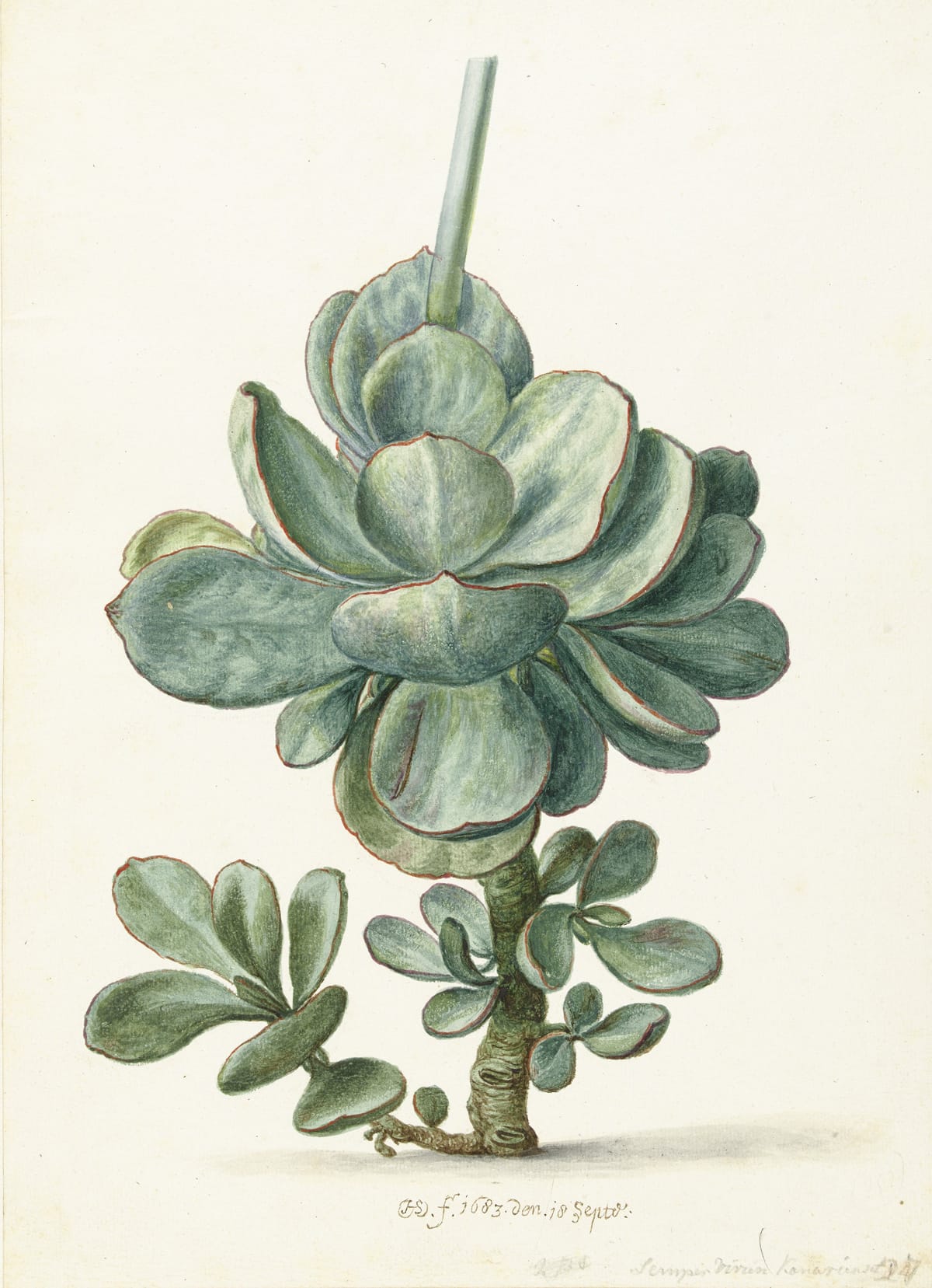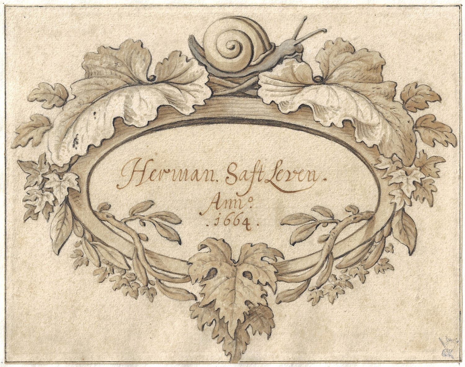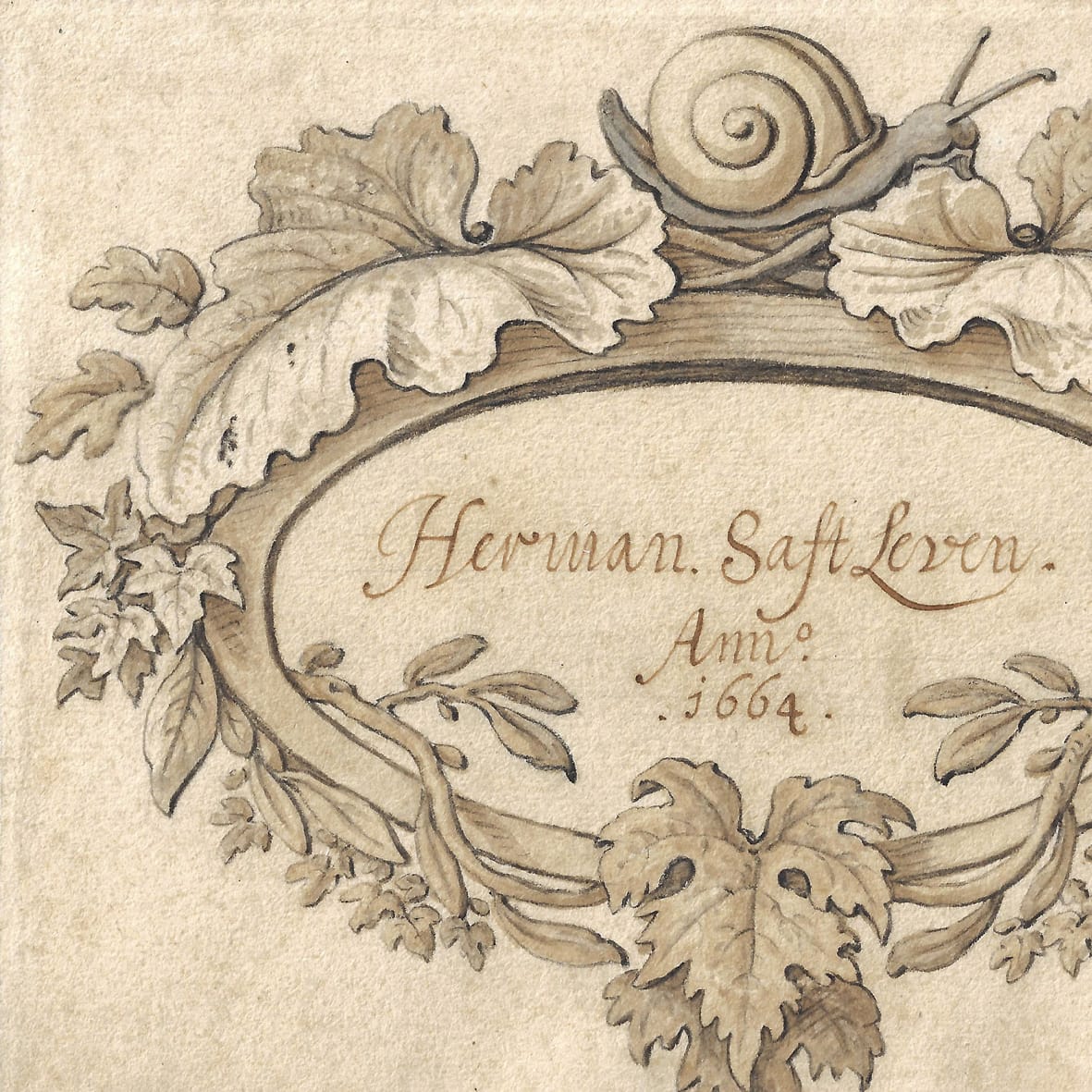 The present cartouche design is unique in Saftleven’s drawn oeuvre, the only pure ornament he ever produced. Consisting of leaves and branches twisting around an oval medallion, the central snail is a reference to the artist’s own surname, as Saft Leven can be translated as “soft life” or “slow life”, in reference to the physical character of the snail – this was already noted by Peter Führing in his catalogue of the drawings in the collection of Lodewijk Houthakker, who made a formidable collection of drawn designs, of which this sheet formed part.5 The original function of the sheet remains open to debate, but it would seem likely that it served as a frontispiece to a group of drawings by the artist, possibly landscapes produced during a journey in the year 1664. Saftleven’s interest in the natural and botanic world is also evidenced by a group of watercolours he produced late in his career, including a study of a succulent plant in the Rijksprentenkabinet in Amsterdam (fig.).6