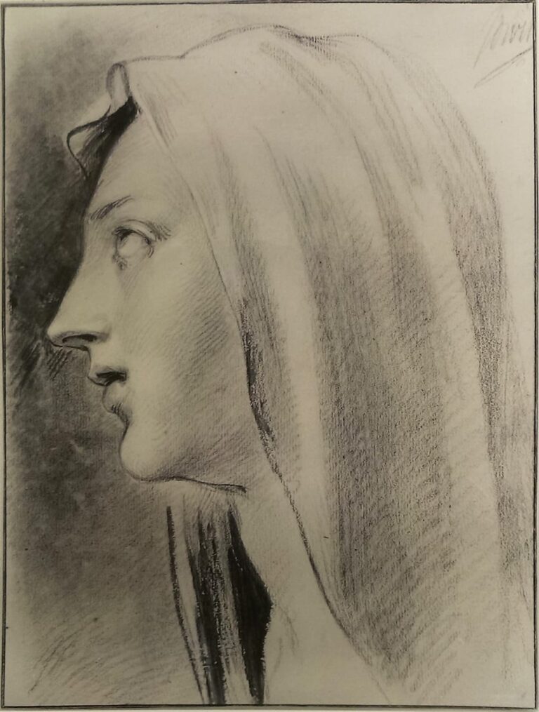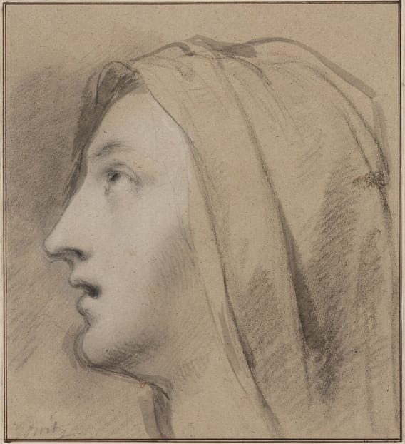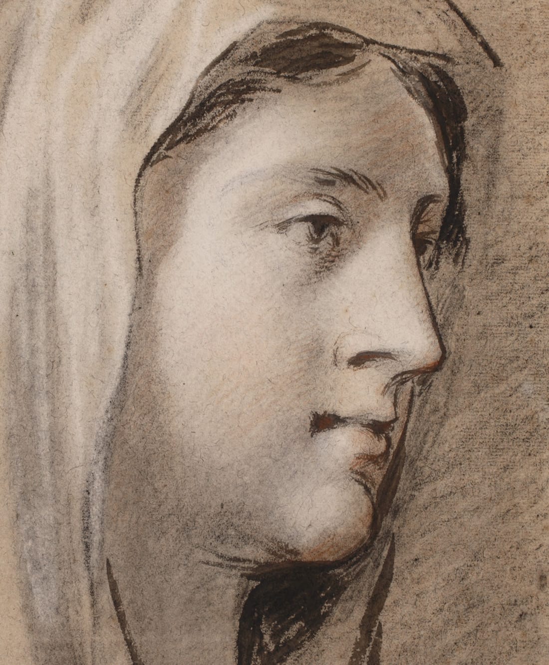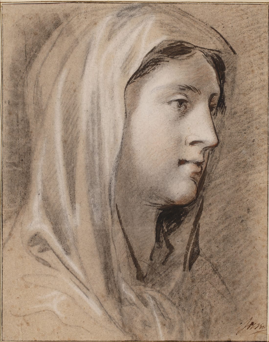 This monumental study of the head of the Virgin, with its tranquil expression and masterly applied brown wash, is among the most impressive drawings of heads by Jacob de Wit. A comparable drawing of a head of the Virgin, in profile looking to the left, also in black and white chalk on brown-grey paper, is preserved in the Teylers Museum, Haarlem (fig.).2 A further similar sheet, with the head of the Virgin in similar posiiton to the Teylers sheet, is in the Graphische Sammlung, Frankfurt am Main (fig.).3