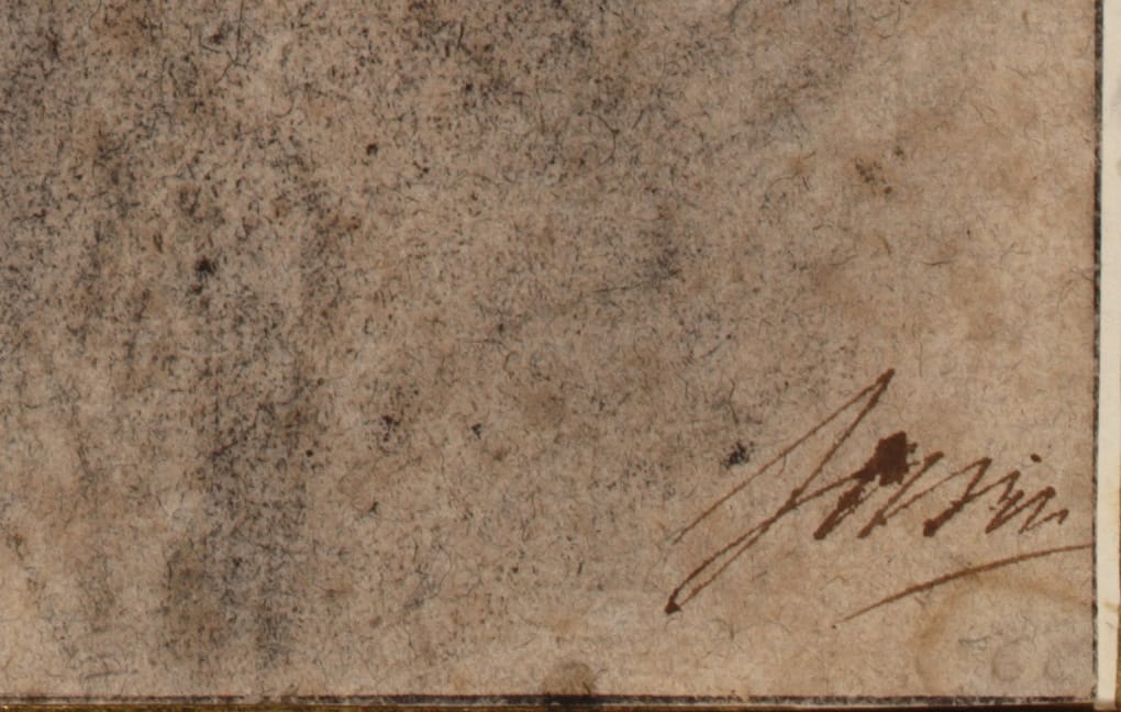 Black, red and white chalk, brown wash, black framing lines, on light brown-grey paper, 380 x 299 mm (15 x 11.8 inch); tipped along the left edge onto Ploos’s mount, with framing lines in gold leaf, pencil and grey wash