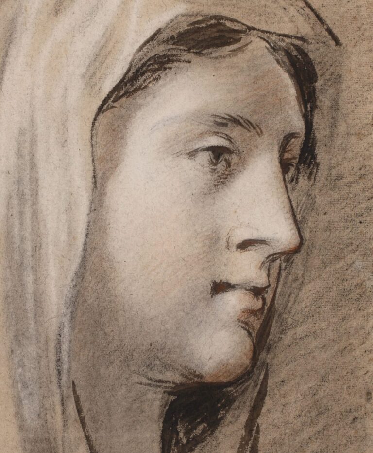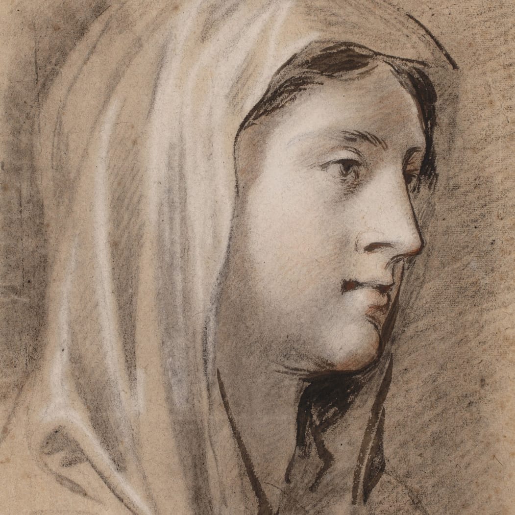 De Wit also frequently drew heads of Christ, usually seen en face. That these carefully finished drawings were highly favoured by contemporary collectors is evidenced by the collection of Cornelis Ploos van Amstel (1726–1798), who in addition to the present sheet owned two further drawings with heads of the Virgin.
