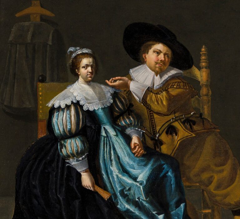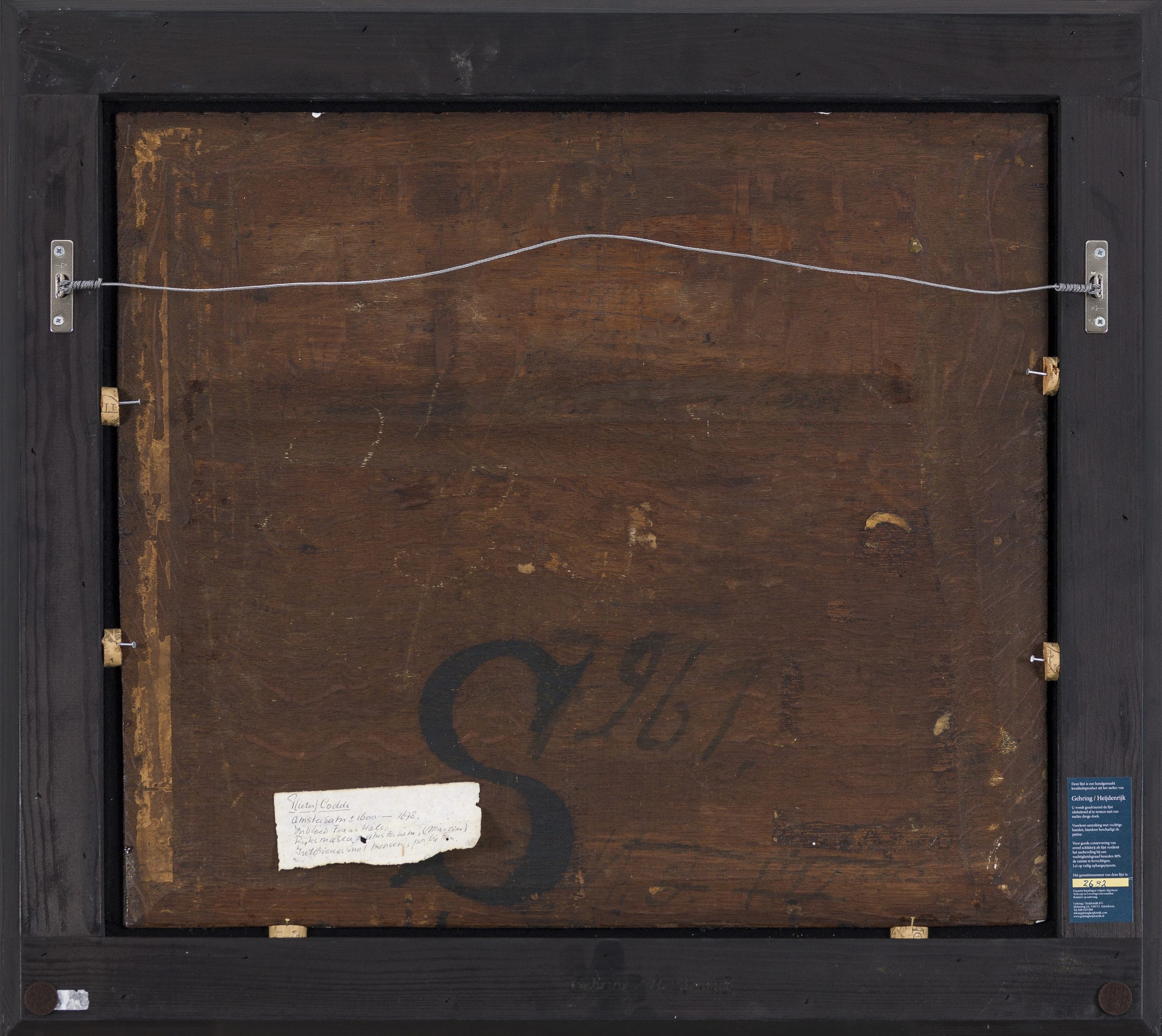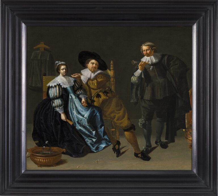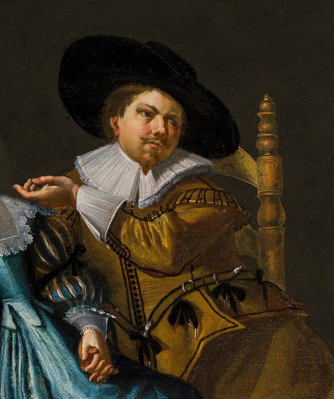 The present painting, which had been lost for nearly a whole century until its recent rediscovery, had been known from an old photograph, on the basis of which it had been dated to around 1630-1632 by Jochai Rosen in his catalogue raisonné on the artist. He considers this work an example of a number of brothel scenes by the artist: the woman at the left, a prostitute, holds hands with one seated suitor, a highly unusual motif in Dutch Golden Age painting, while a second suitor tilts a flute glass towards her – a gesture of obvious erotic meaning, as interpreted by Rosen.