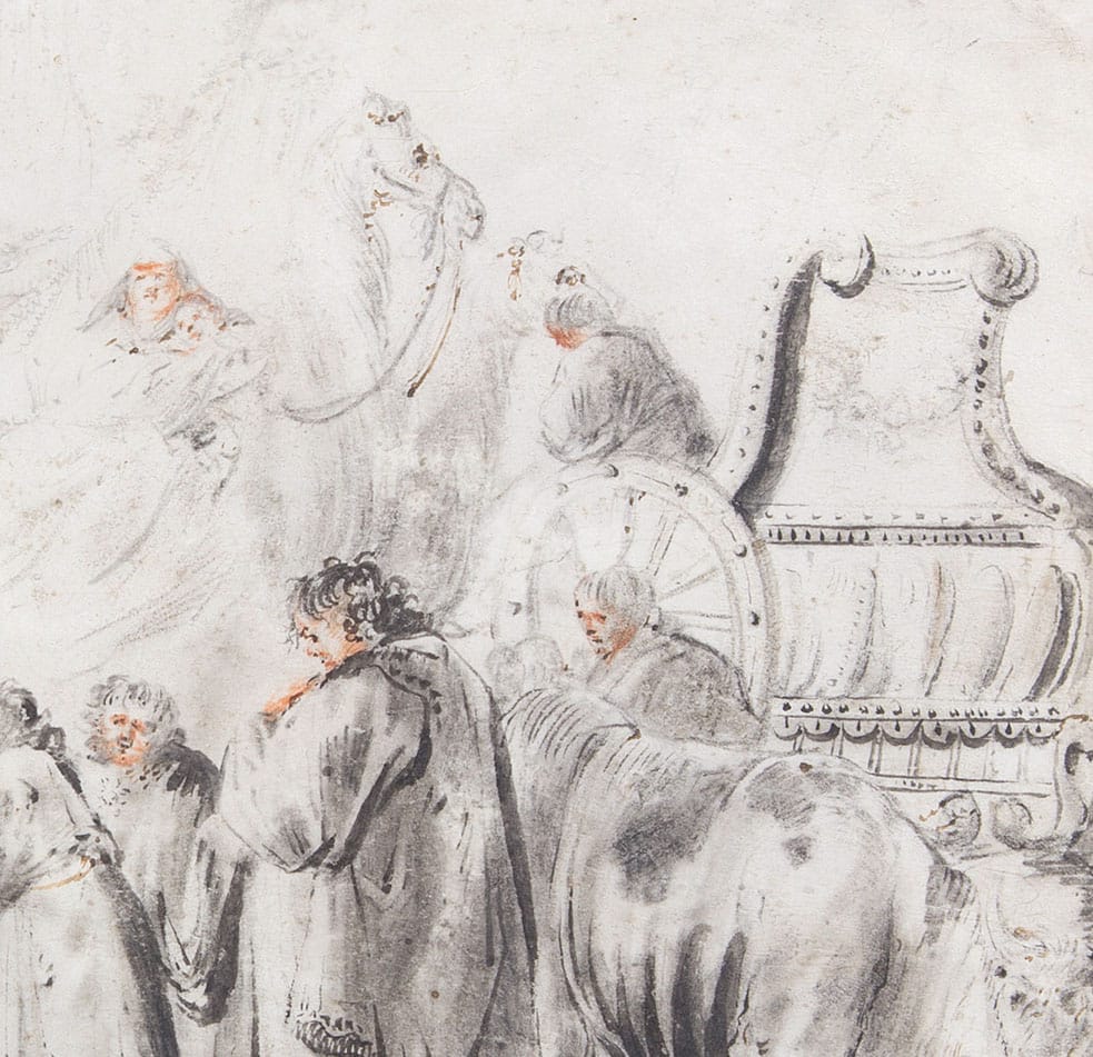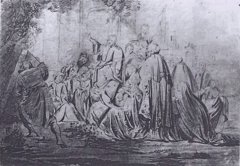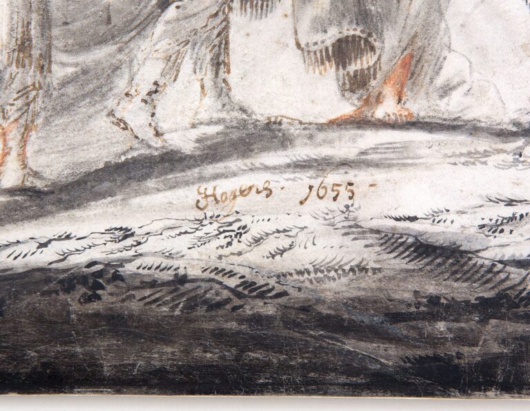 Our beautifully preserved sheet is typical of Hogers’s drawn oeuvre: all his known drawings are executed on vellum, in pen and wash in grey or black, and with accents in red on hands and faces, and take subjects from biblical history as their inspiration. About a dozen drawings are known, most in international museums. Our drawing may be compared to the Raising of Lazarus in the Rijksmuseum, Amsterdam (fig.).3 Hogers’s drawings must have been highly valued during his lifetime: the Deventer mayor Wilhelm Gelinck owned no less than six drawings on vellum by the artist.4