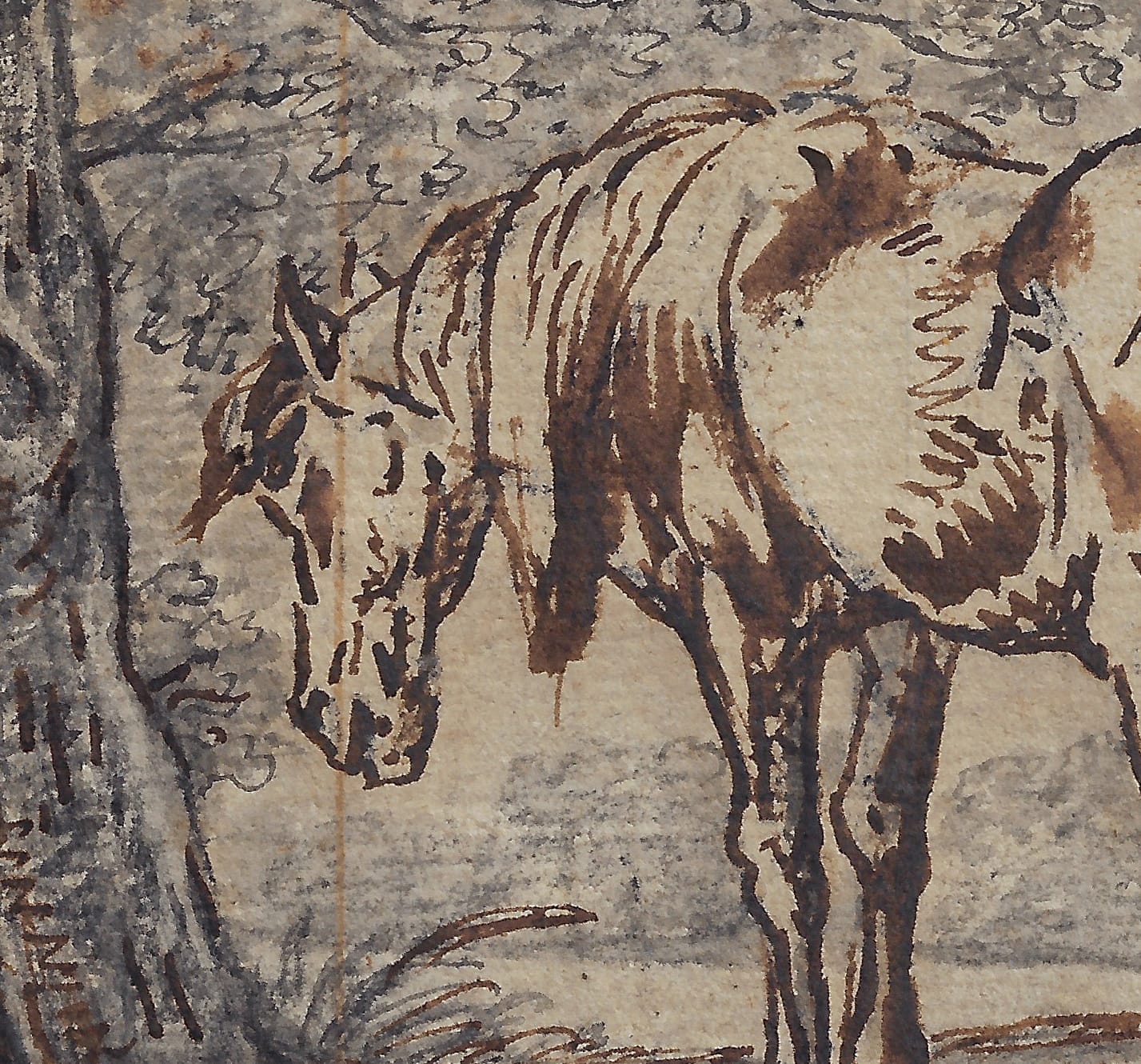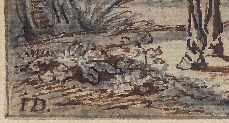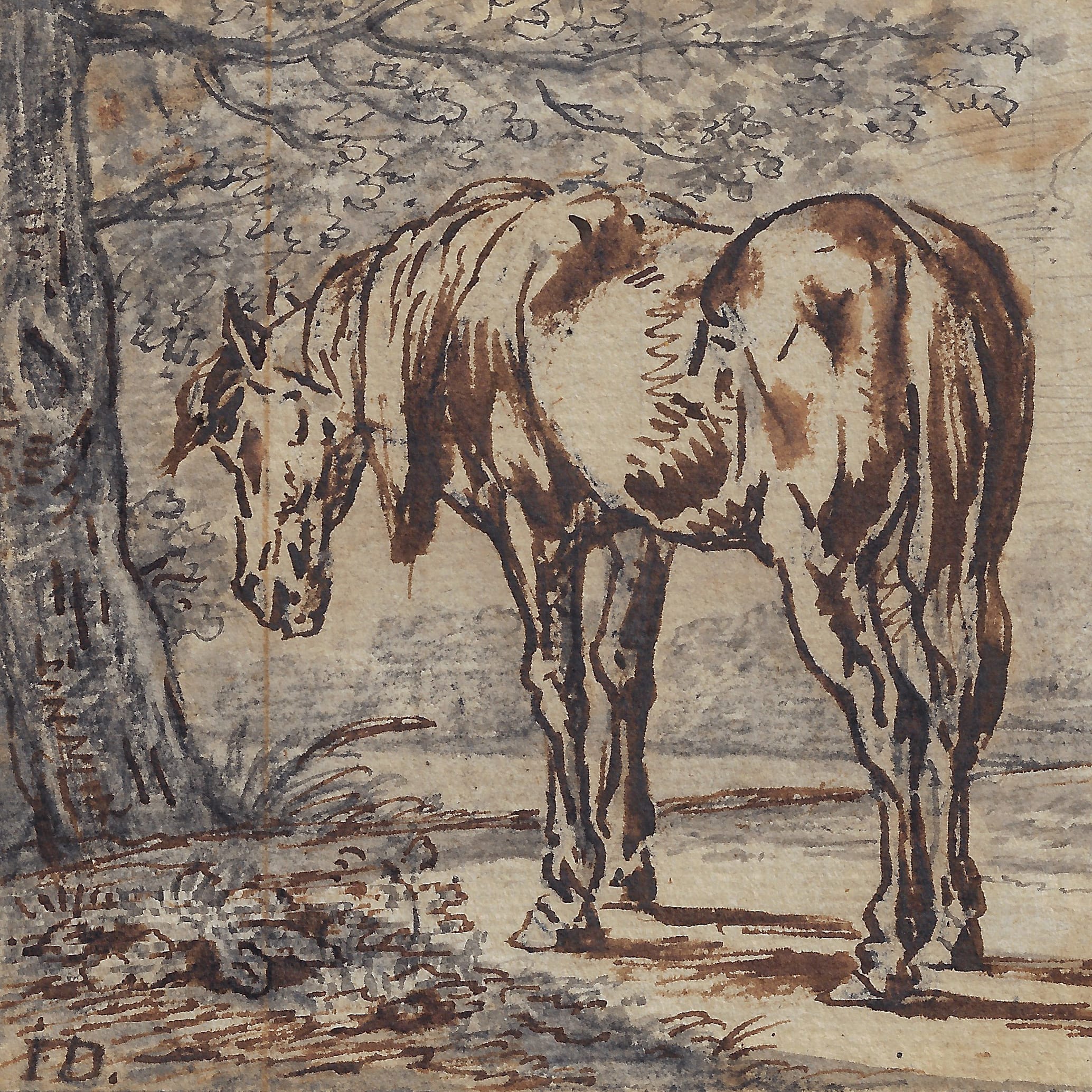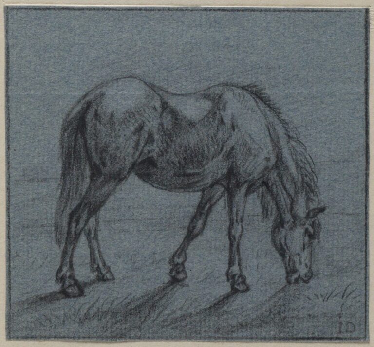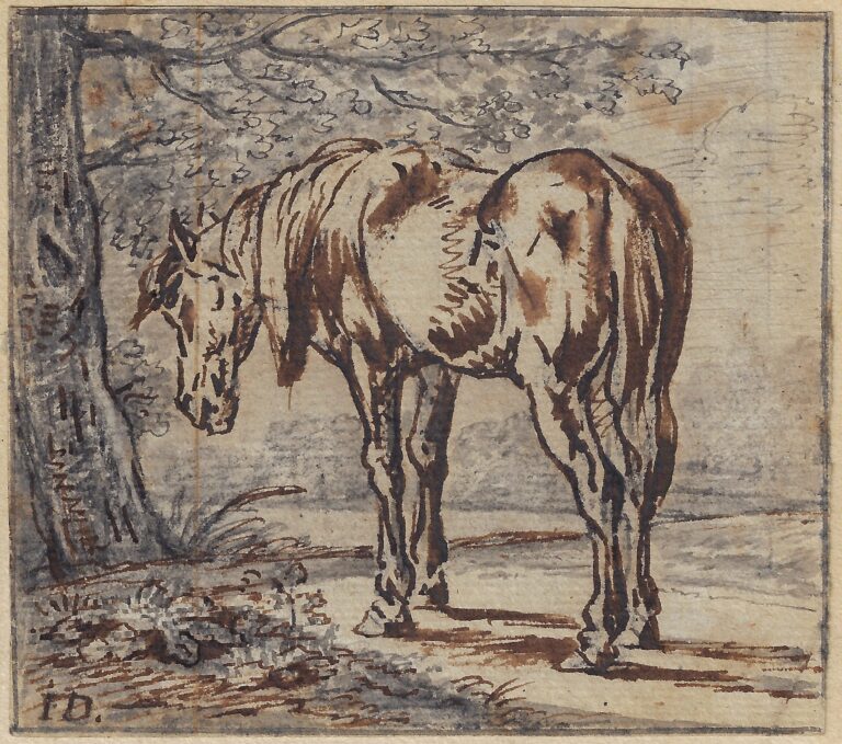 The drawn oeuvre of Dasveldt consists mostly of animal studies in black chalk – the present sheet, with the combination of black chalk, grey wash and powerful applications of pen and brown ink, is exceptional in its mixture of media, as it is in the painterly effects of the work, which is in fact executed on a small scale. The presence of Dasveldt’s iconic monogram ID suggests that this sheet was considered as a finished work of art by the artist, intended for collectors of ‘papierconst’, paper art. In terms of scale and subject matter, our drawing can for instance be compared by Dasveldt’s study of a grazing mare in the Teylers Museum in Haarlem (fig.).3