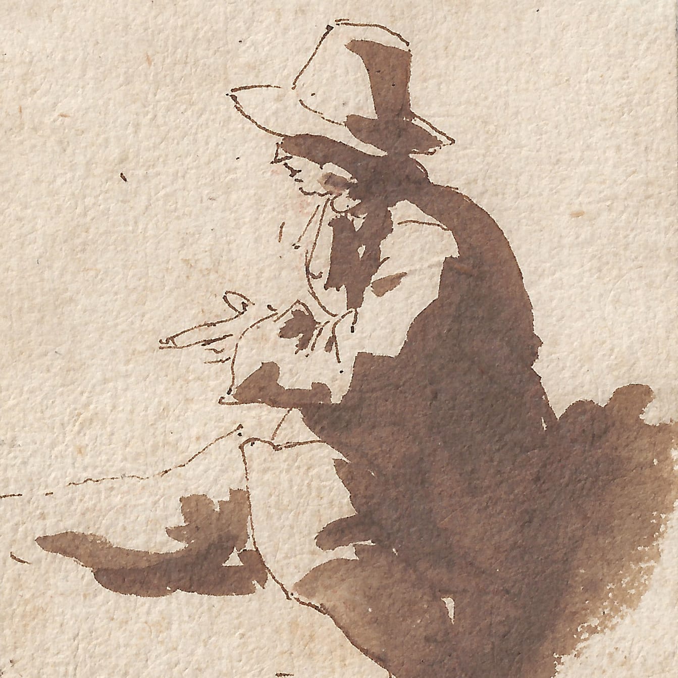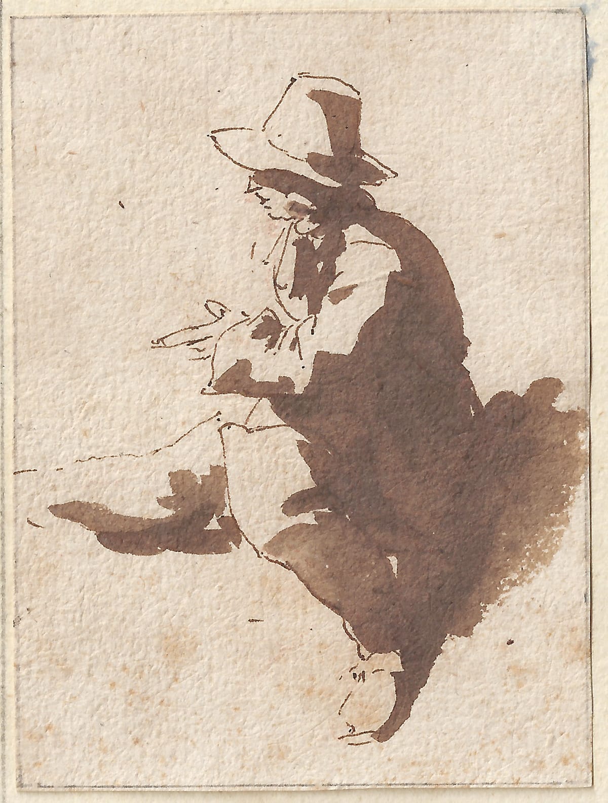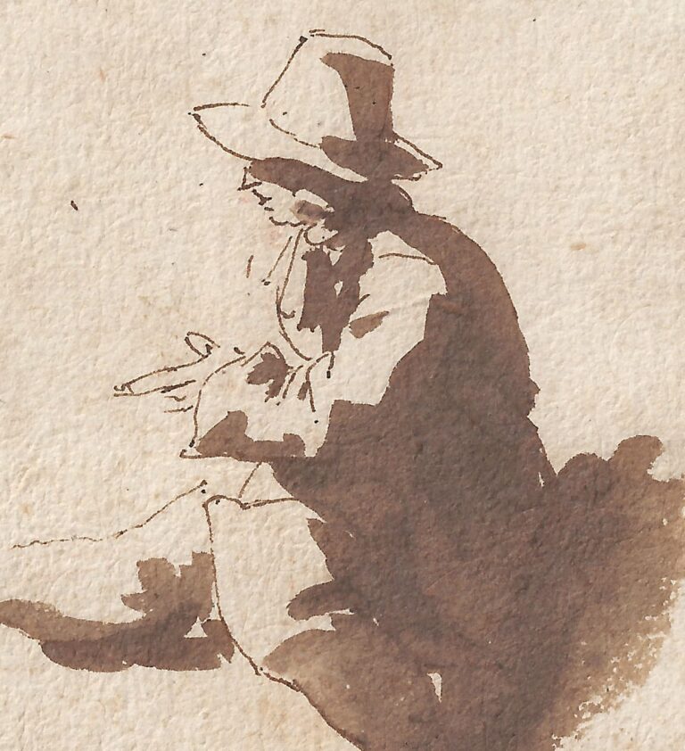 De Bisschop’s original drawings (rather than copies after Classical sculptures and Italian paintings and drawings) are frequently of small to miniature size, as is the present intimately beautiful drawing. They were originally almost certainly part of small-size sketch albums which the artist could easily carry around wherever he went, to document fleeting impressions and interesting views. De Bisschop was a highly accomplished draftsman, who was able to record a scene in a matter of minutes. The broad application of wash in this sheet is especially successful, and conveys the sense of strong sunlight on a summer’s day to perfection. Our drawing can for instance be compared to a study of a stonemason by De Bisschop, preserved in an eighteenth-century album of drawings, now in the Victoria & Albert Museum, London (fig.).3