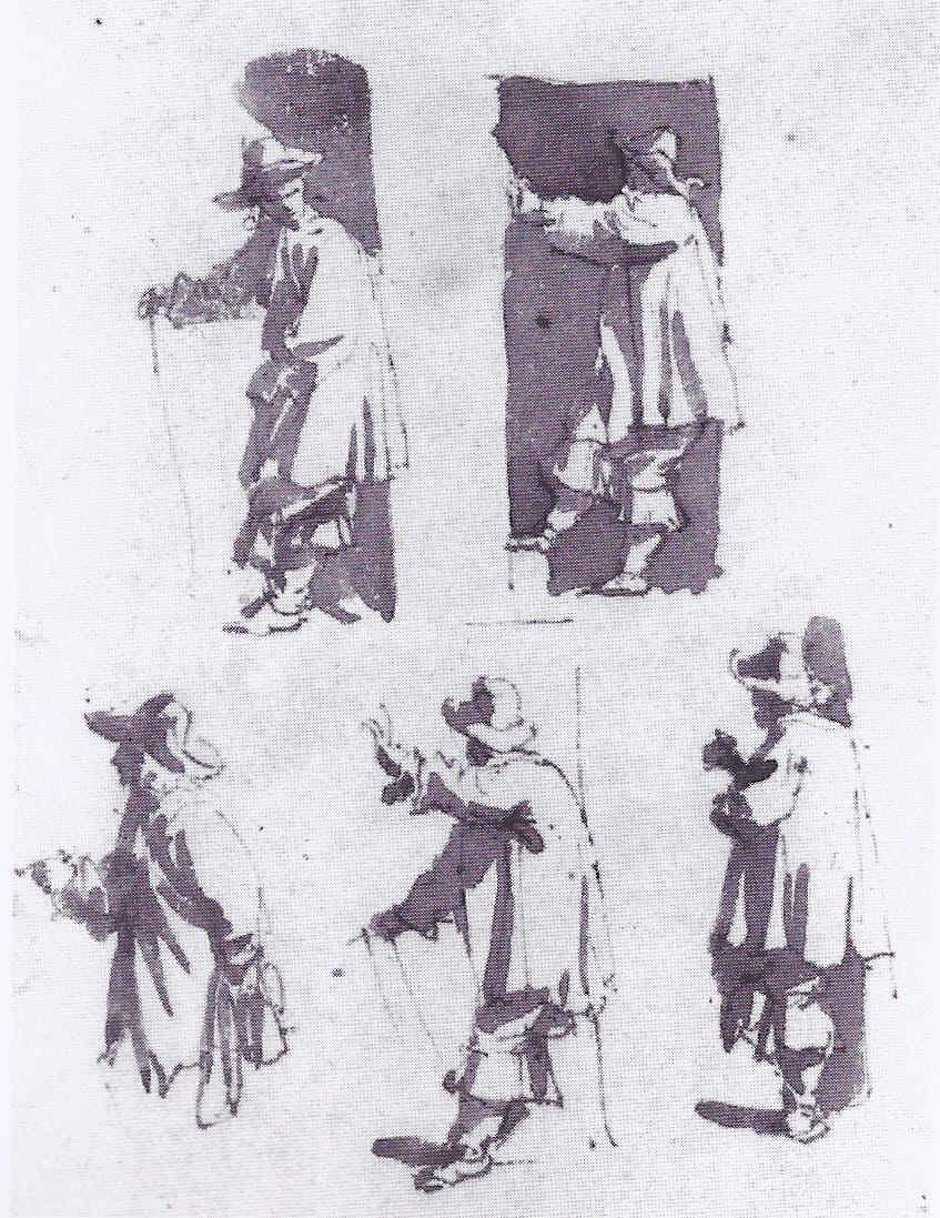 From the letters of Constantijn and Christiaan Huygens it is known that De Bisschop founded a private drawing academy around 1661. A frequent model was a man called Anthonij, also known under the tantalising alias of ‘de vliegende Platluys’ (‘the flying pubic louse’). A sheet with five studies of what is probably this model is preserved in the Prentenkabinet der Rijksuniversiteit, Leiden (fig.).4 Our drawing is especially comparable to the study at the lower left in the Leiden sheet, and it is likely that the model Anthonij is depicted again here. If the drawing was made during a session in the academy, the strong sense of light and shadow could have been produced by artificial lighting.