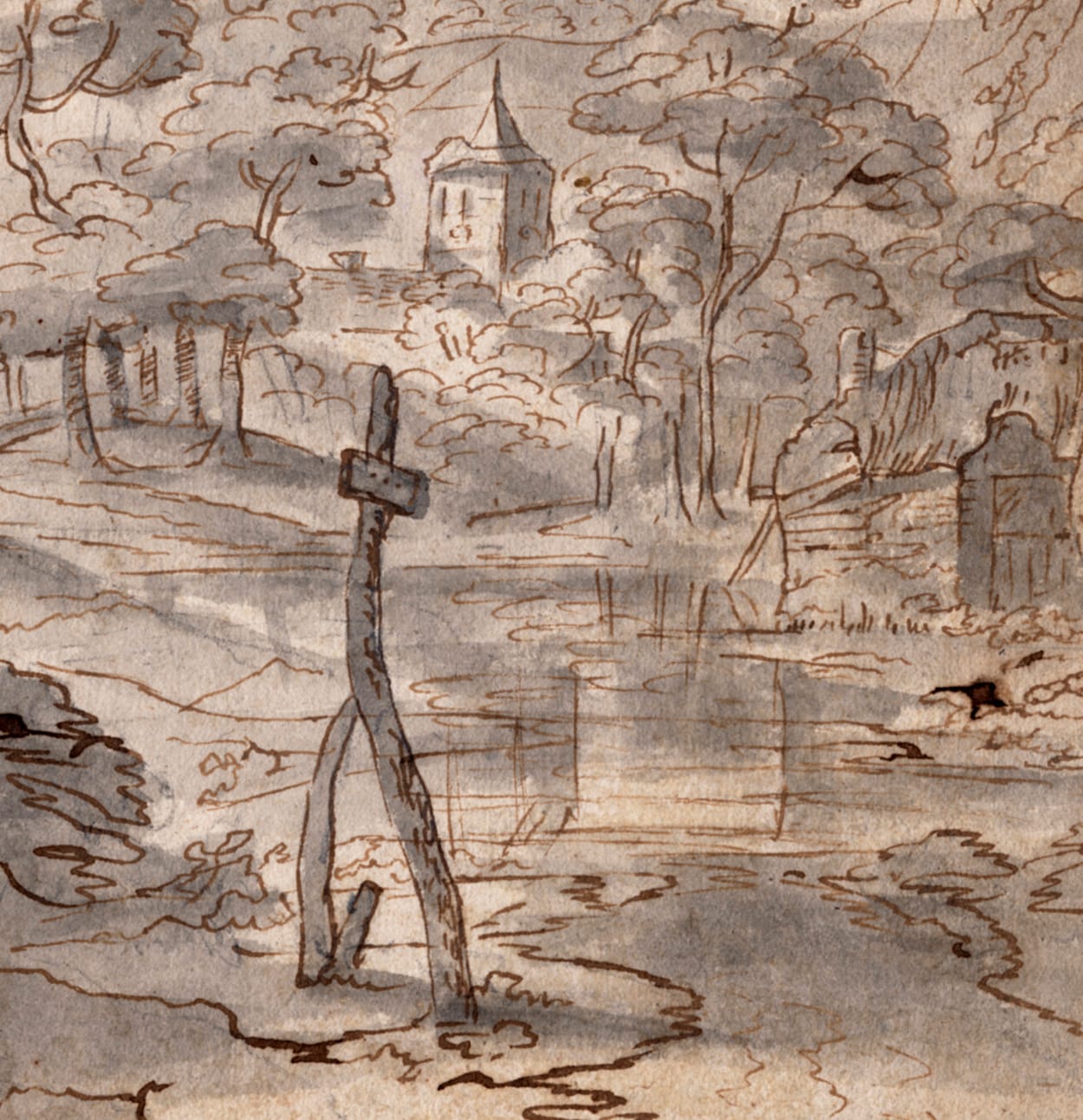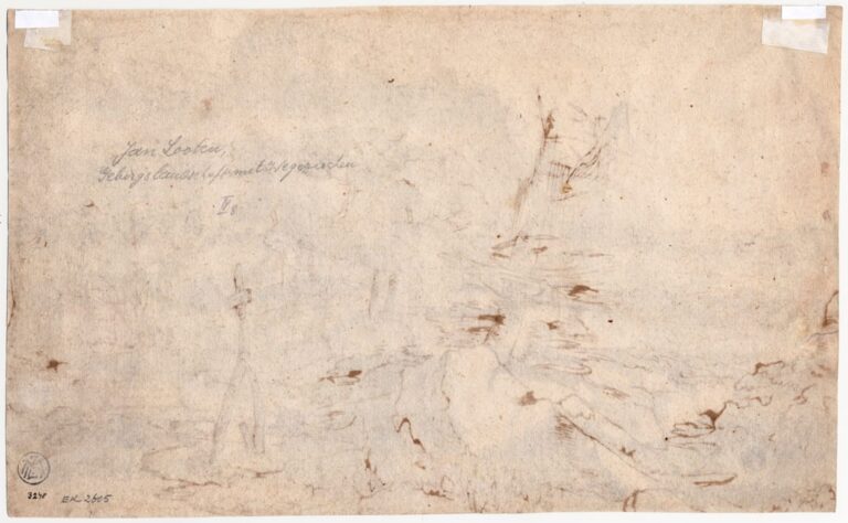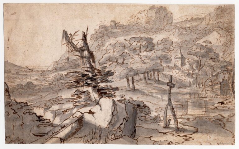 This drawing is one of very few works on paper by the artist.1 A single signed landscape drawing is in the Frits Lugt collection,2 whereas a drawing with an early attribution to Looten is in the Dresden museum.3 Our drawing was published as Looten in the 1954-55 Brno exhibition, but an alternative attribution to Pieter Dircksz Santvoort was suggested by Dr Ann Zwollo some years later. Since then the Looten attribution has been generally accepted. The drawing may be compared to one of Looten’s most magnificent paintings, Rocky Wooded River Landscape, signed and dated 1661 (fig.).4 Both works feature a dead tree in the centre of the composition, with diagonally-placed treetrunks in the foreground, a path winding its way into the distance, and a pole supported by a diagonal beam along it. Our drawing can probably be dated around the same period, very shortly before Looten emigrated to London.