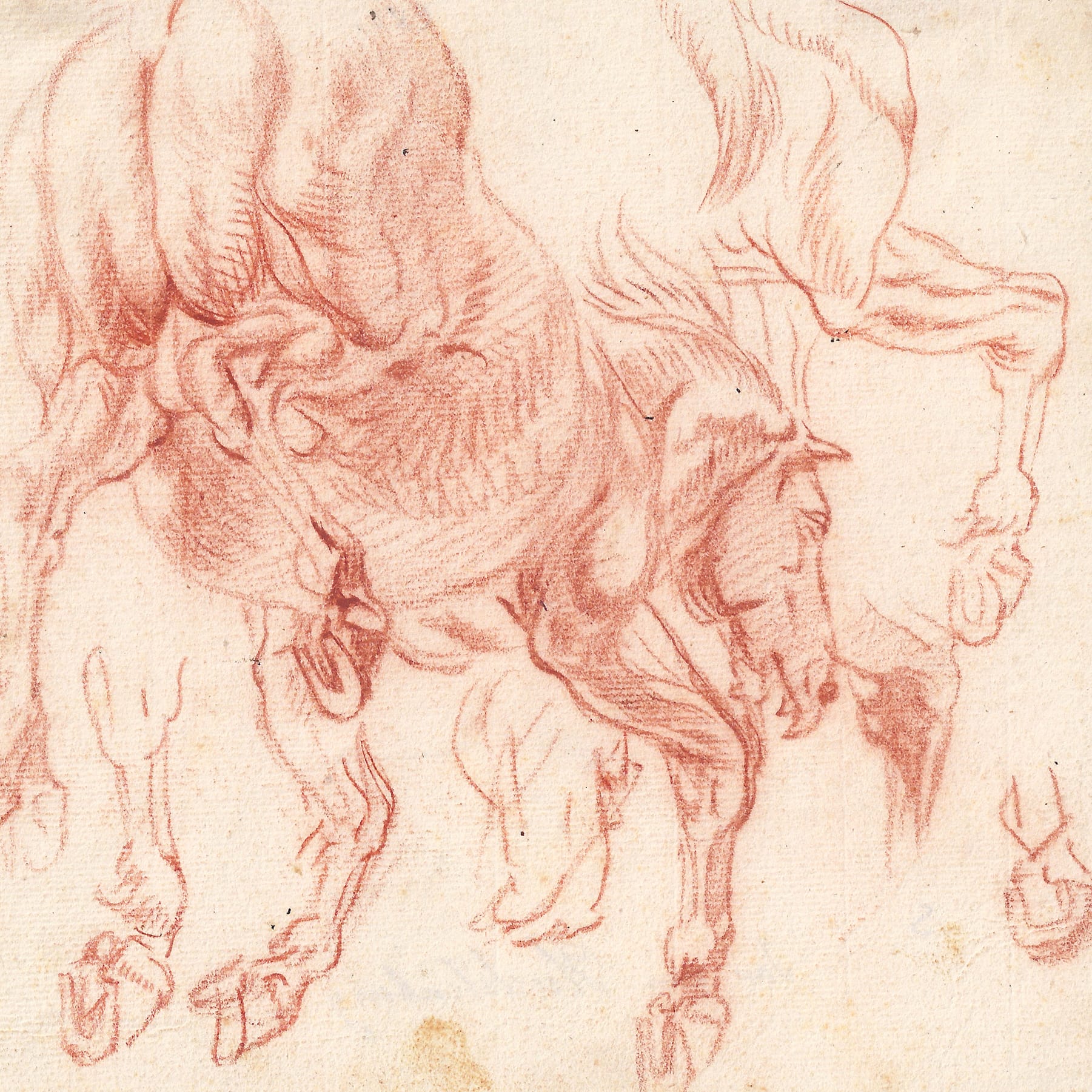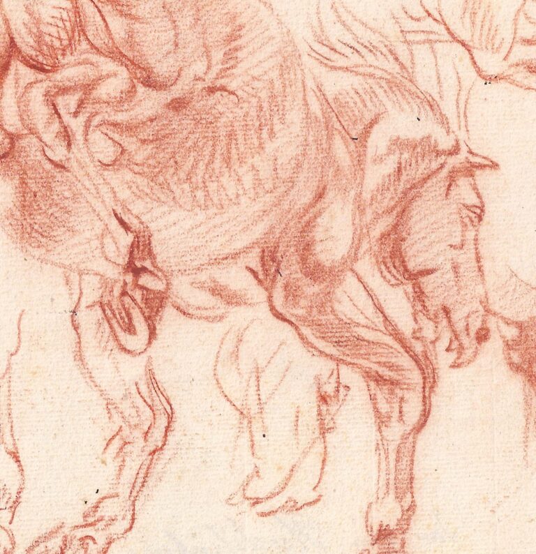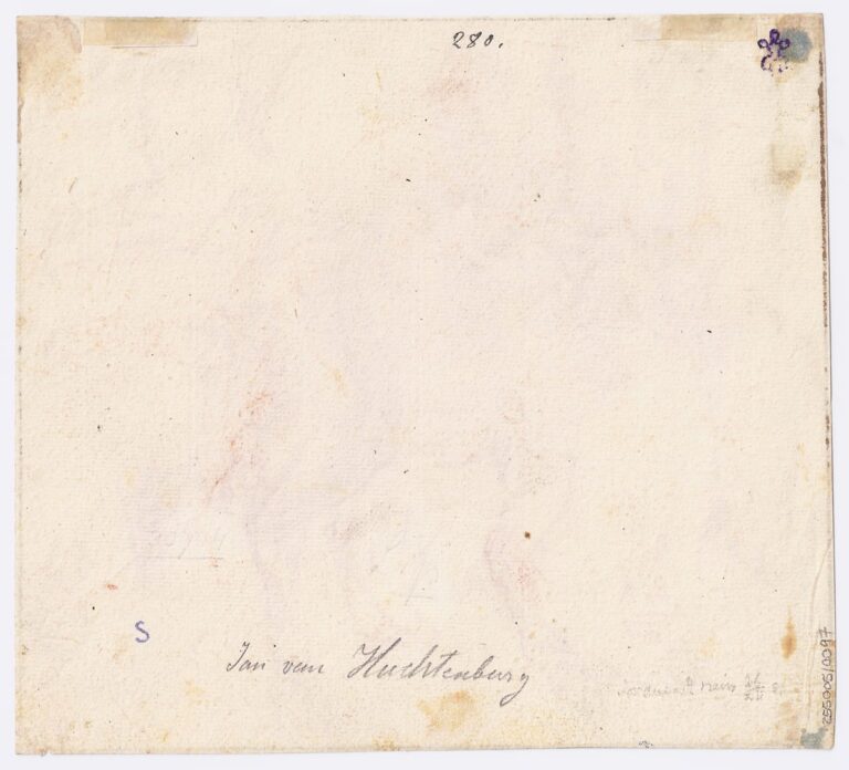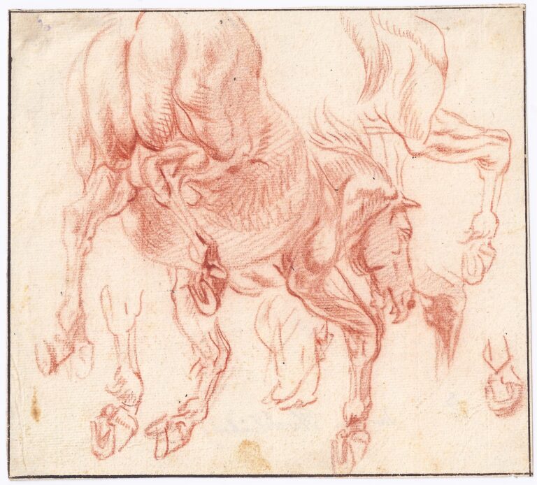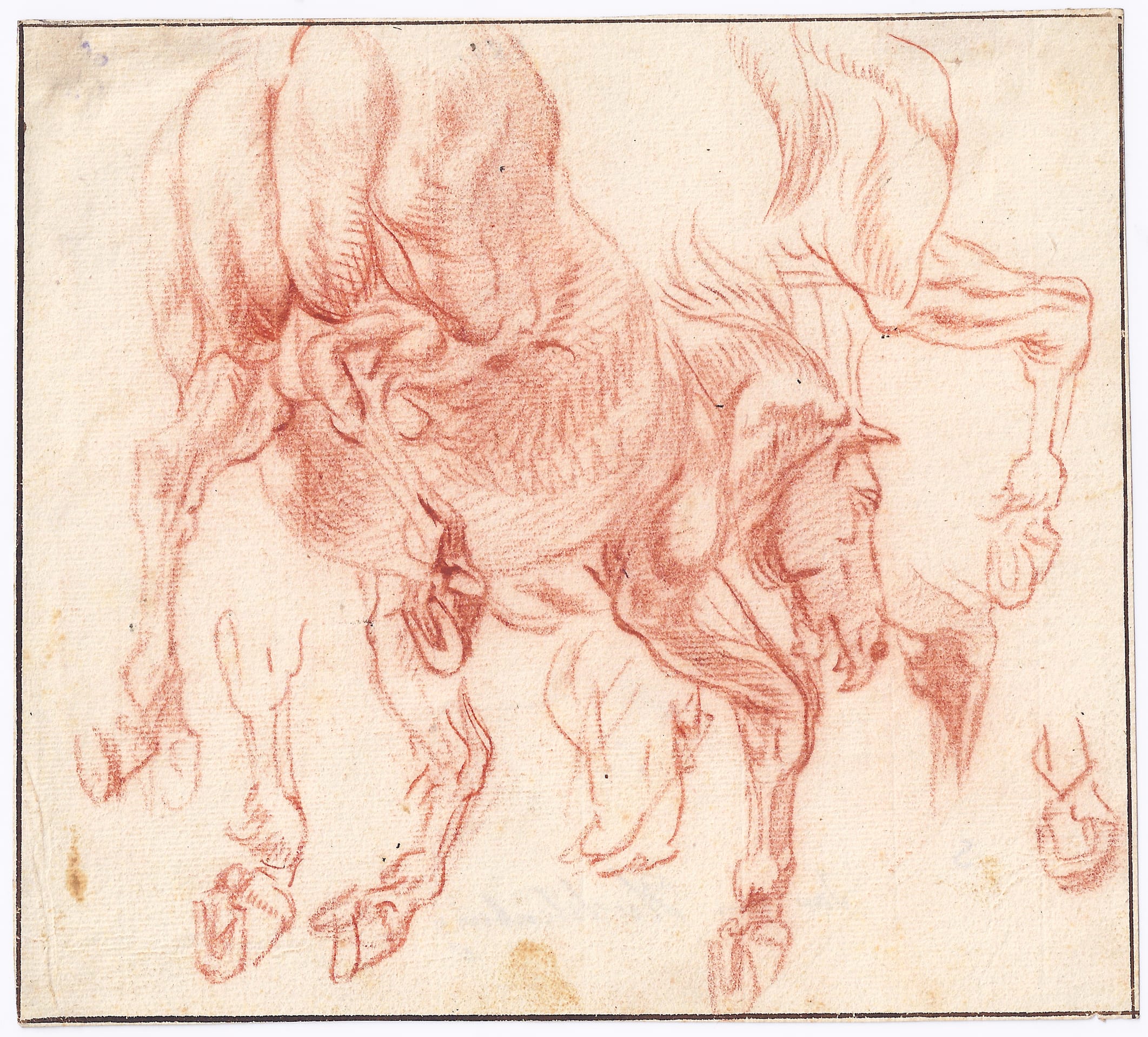 Huchtenburg was most appreciated for his realistic portrayal of horses in his battle scenes. In preparation for these, he must have made countless sketches of horses, yet very few are known today.3 The present sheet is of exceptional quality and has long been given to Huchtenburg. It would appear to date from quite early in his career, certainly still in the seventeenth century. The sheet makes a particularly lively impression because of the separate studies of the animal’s legs, hooves and head. Both in technique and because of the separate detail studies the sheet is reminiscent of drawings by Adriaen van de Velde (1636–1672).