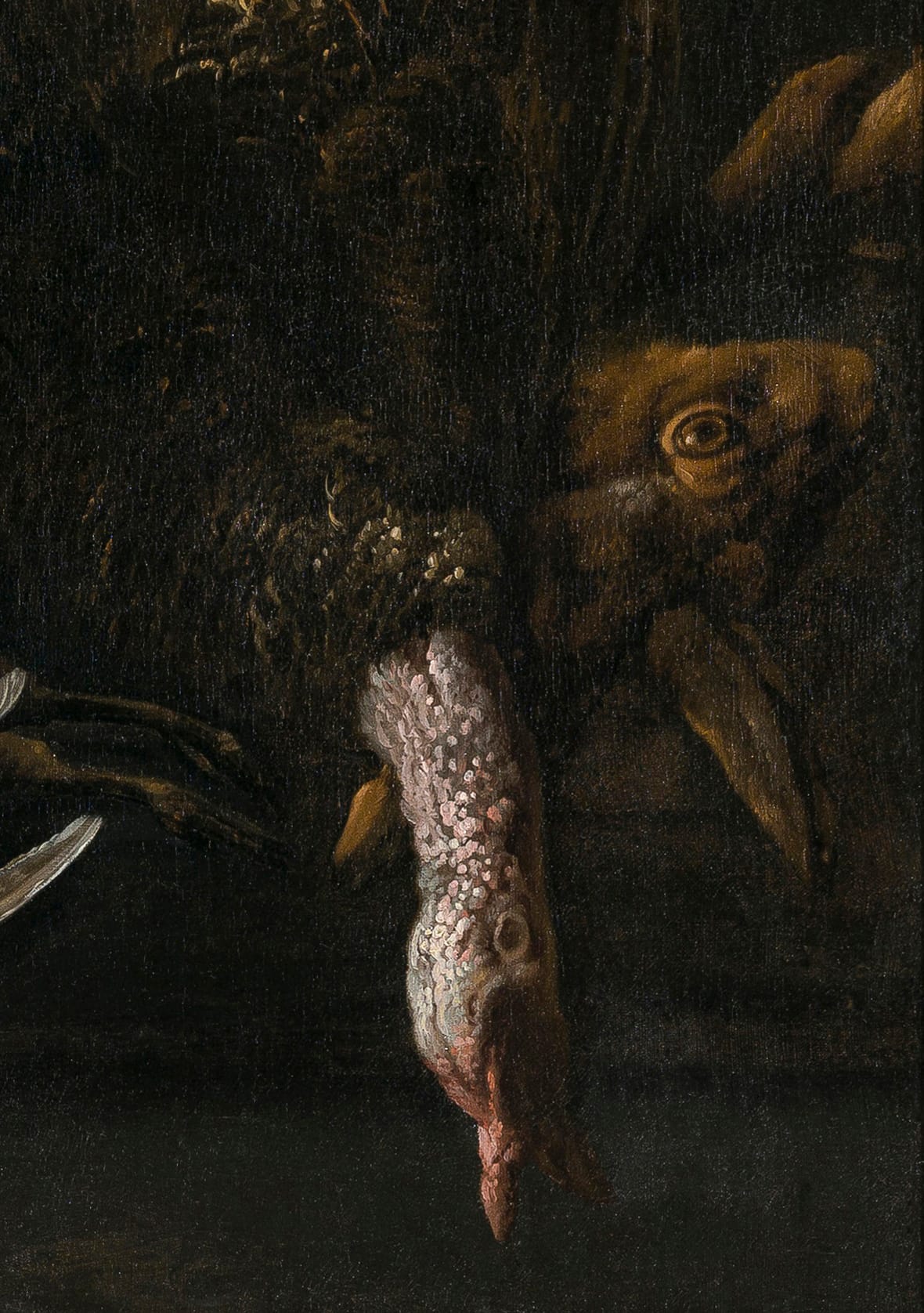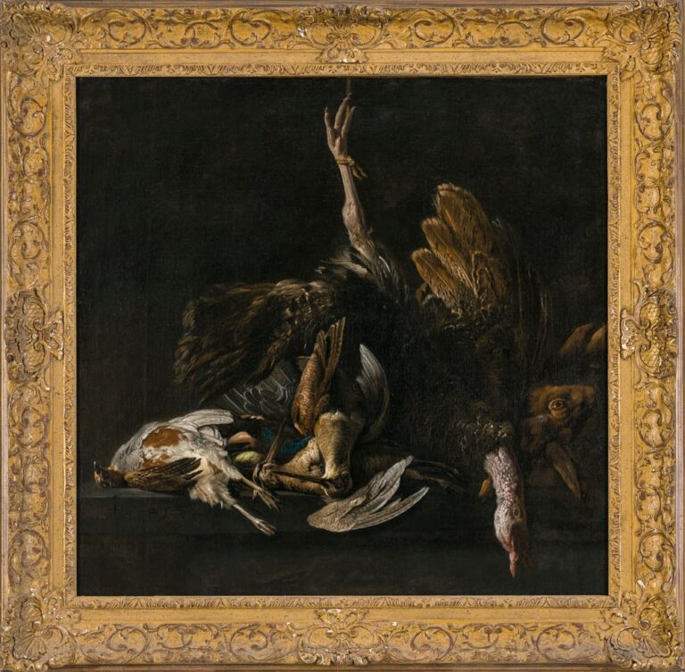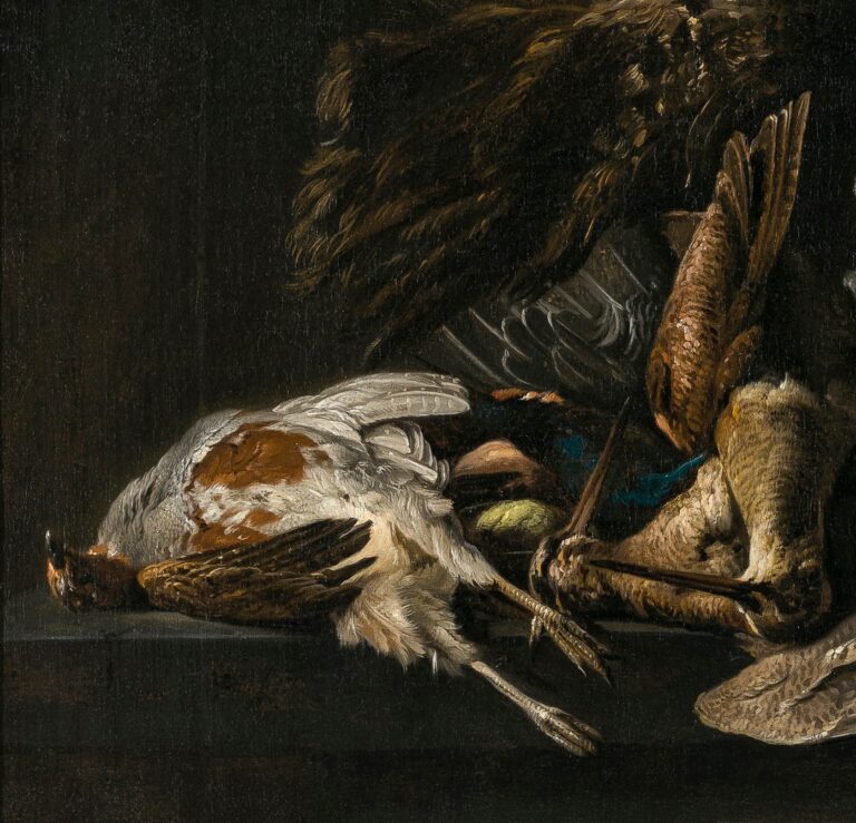 The present work is a particularly large and impressive still life by Vonck, probably dating to around 1650-1660. Arranged in a triangular composition on a stone ledge are the spoils of a successful day hunting and shooting: from left to right we see a partridge and two woodcocks, the two preferred birds for consumption since the Middle Ages. Between the partridge and woodcocks lies a brightly coloured bird, presumably a wood grouse. The centre of the composition is formed by the turkey, one of its legs suspended by a rope. Turkeys had been introduced into Europe during the sixteenth century, imported from their original habitat of North and Central America – by the middle of the seventeenth century, they were widespread. At the right edge of the painting we see a hare, particularly difficult to shoot and therefore considered a great prize for sportsmen.4 Unlike many other artists of his time, Vonck does not show the animals ready to be cooked or displayed on expensive platters as tokens of wealth and status. They seem to exist in a placeless world, out of time. Vonck’s painting confronts us with the basic facts of life – and death.