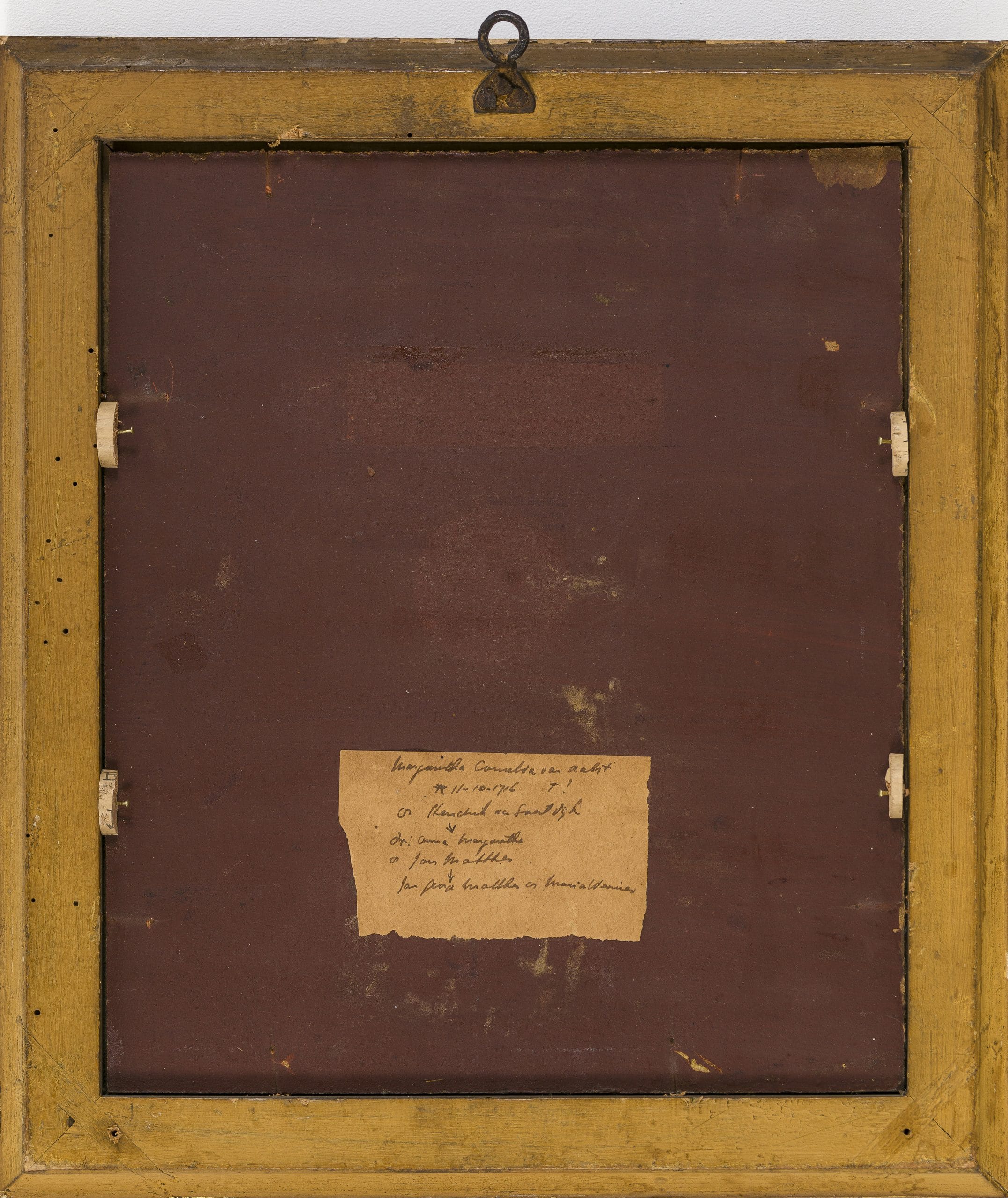 Although they are by different painters, these portraits belong together and depict a husband and wife. Hendrik van Soesdijk was ‘drossaard’ and ‘schout’ of Vreeland and married Margaretha Cornelia van Aalst, his junior by thirty years. Their son, Johan van Soesdijk, born in March 1738, the same year as the portrait of his mother was painted, was married in 1767 to Geertruy Aletta Ploos van Amstel, the daughter of the collector and printmaker Cornelis Ploos van Amstel. Hendrik’s portrait was painted in 1723 by Cornelis Pronk, but when his young wife was painted in 1738, the selected artist was the French-born society portraitist Jean Fournier, who based the composition of the portrait, the support and size on the earlier portrait by Pronk, to produce a ‘matching’ set of pendants.