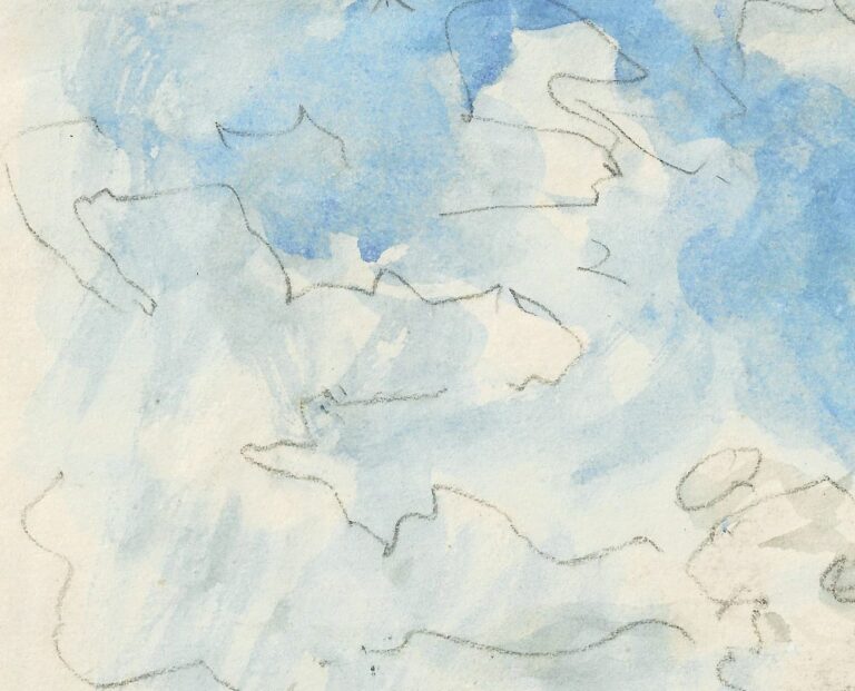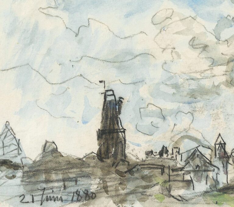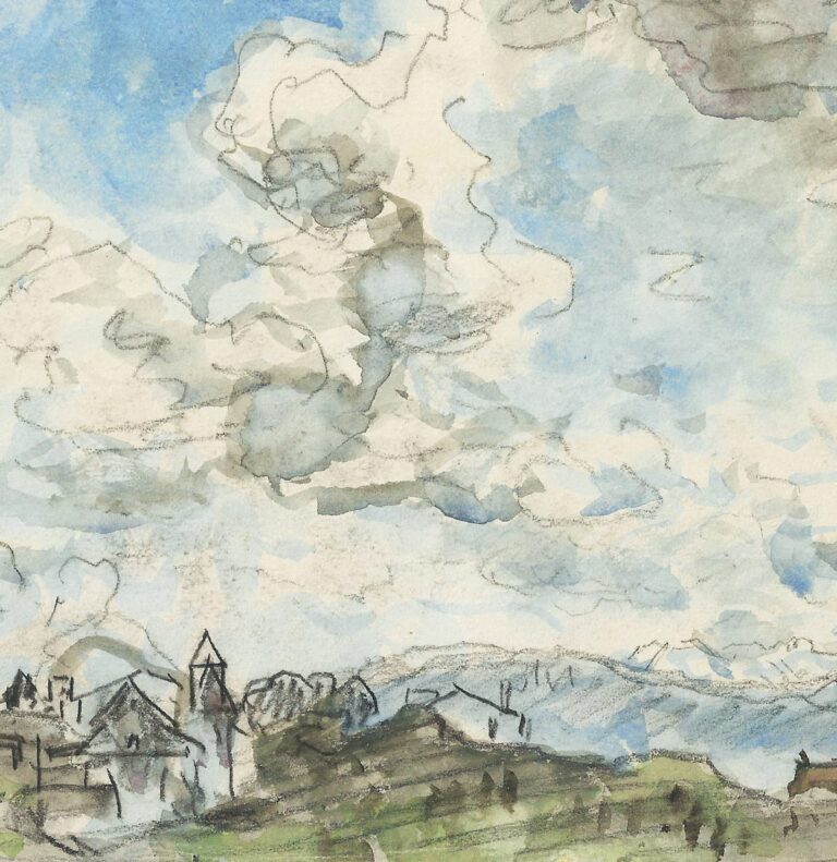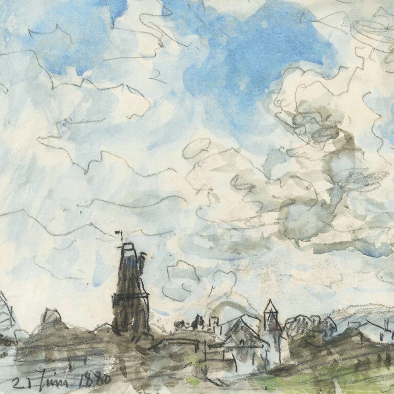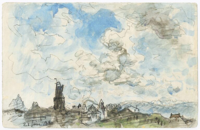 In this superb sketchbook watercolour Jongkind shows himself to be innovating and fresh even at the age of sixty-one. The artist concentrated fully on the cloud formations, filling most of the sheet. The horizon is formed by an angular mass of rooftops and distant mountains, only broken by the narrow windmill or tower. The restless handling of the black chalk and the loosely applied blue wash shows the artist at the height of his skill, and the angularity recalls the work of Cézanne. The delineation of the clouds can for instance be compared to a watercolour in the Metropolitan Museum, New York, which dates from 1870 and is more traditional in composition than our more ‘modern’ sheet (fig.).2