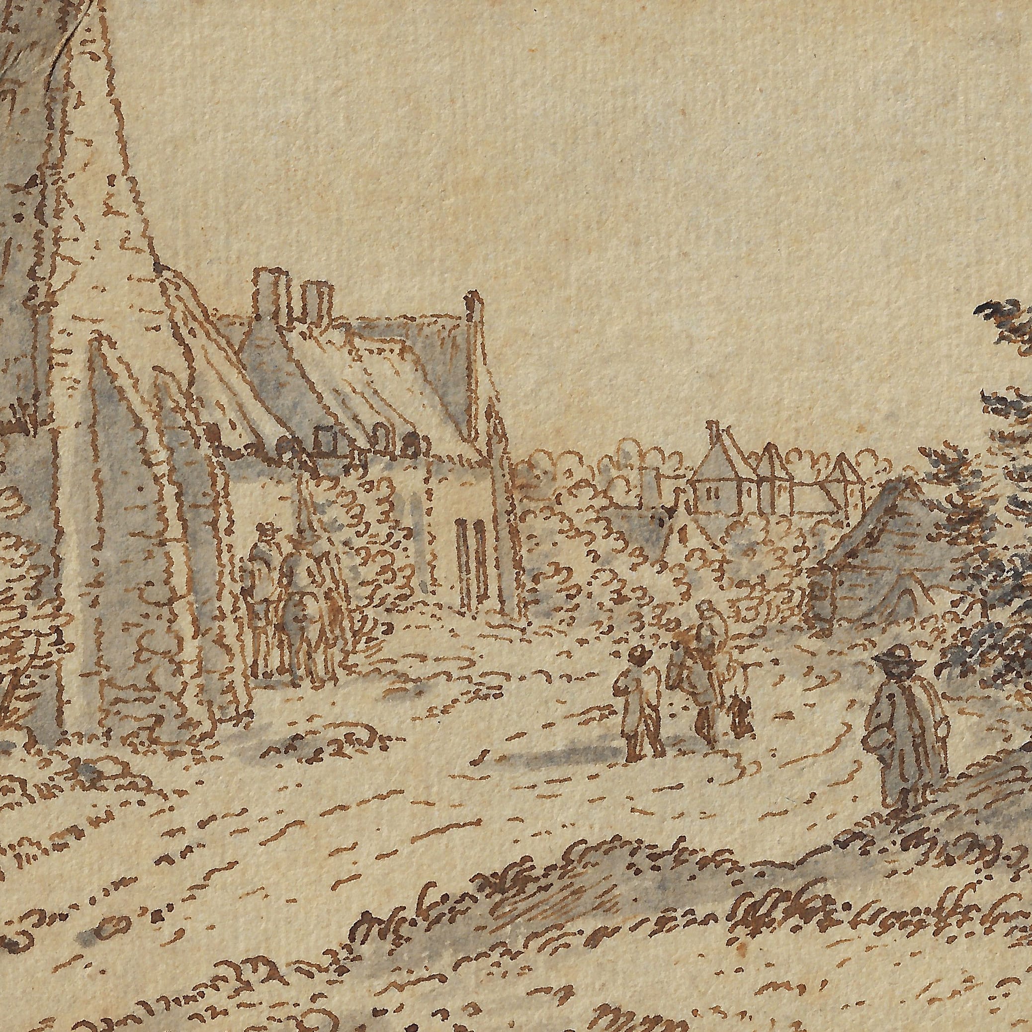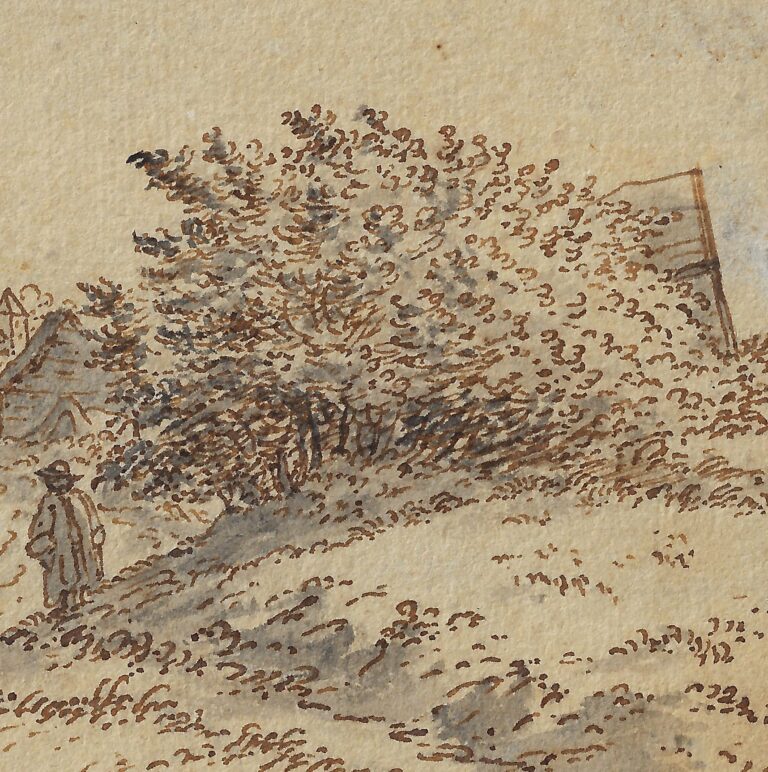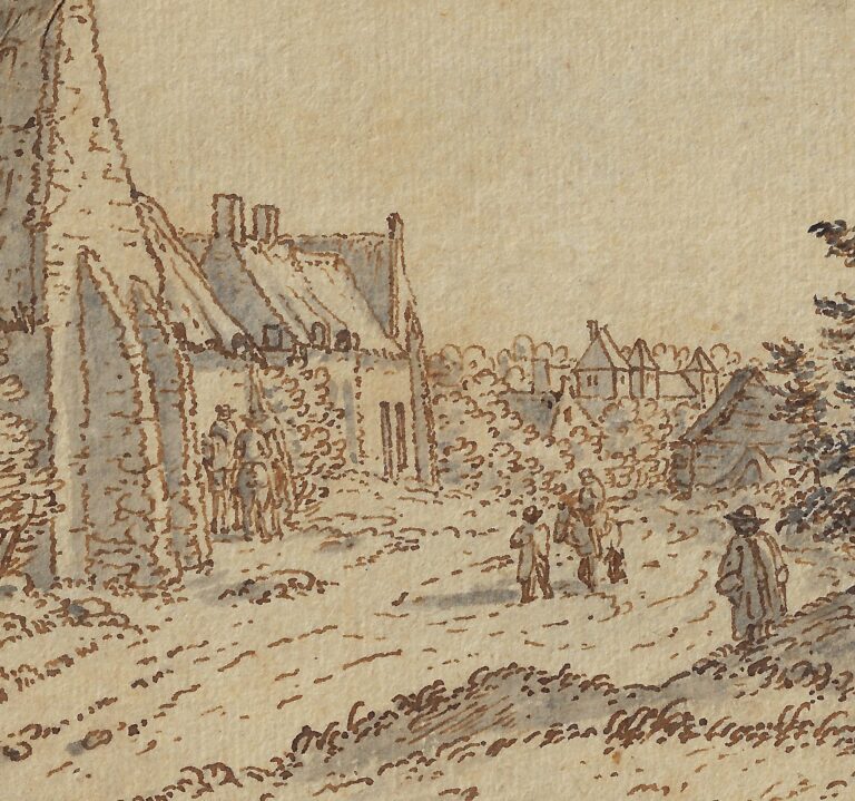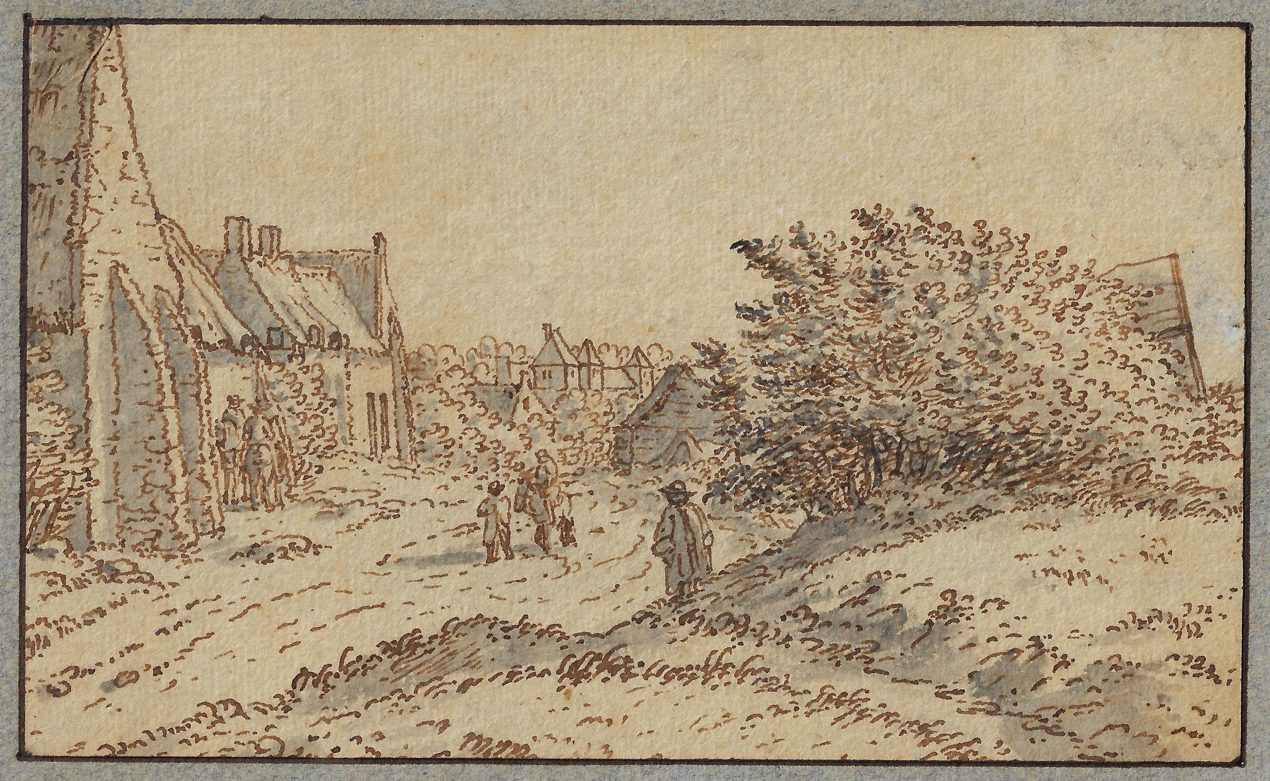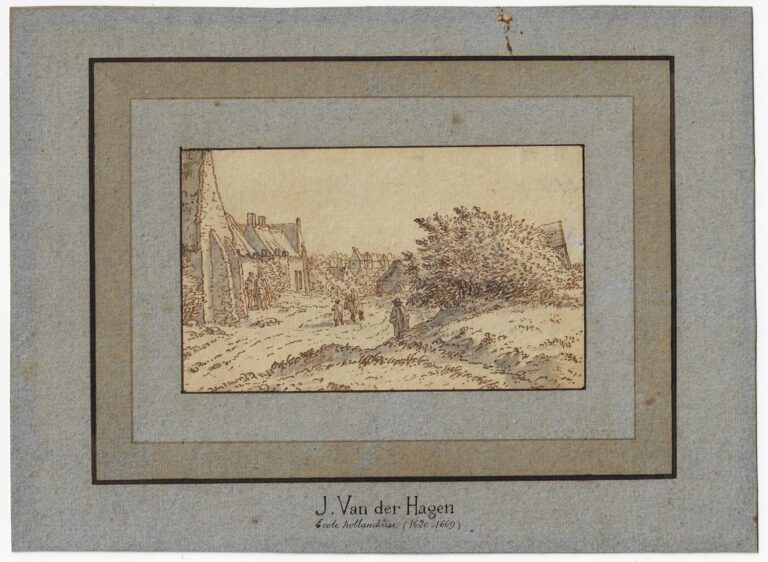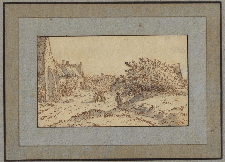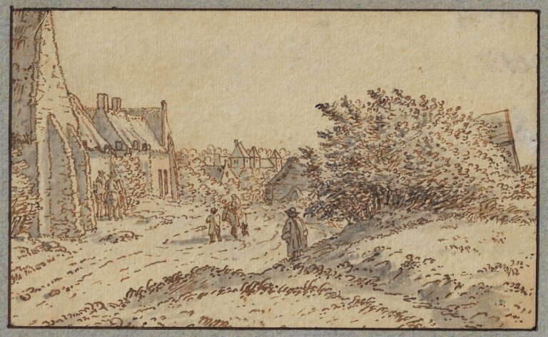 Pen and brown ink, grey wash, black ink framing lines, 89 x 148 mm, laid down onto a blue mount with framing lines in brown ink and brown wash, bearing a previous identification as ‘J. Van der Hagen / Ecole hollandaise (1620-1669)’