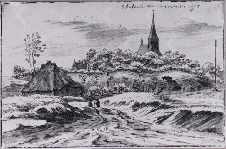 De Grave’s topographical drawings are frequently around 95 x 150 mm in size and are thought to come from a travelling sketchbook of these dimensions. Our drawing is likely to have come from such a sketchbook, and is likely to date around 1675. It can for instance be compared to De Grave’s view of the village of Sint Anthonis, drawn on 12 November of that year (fig.).2