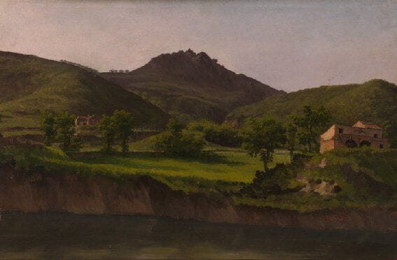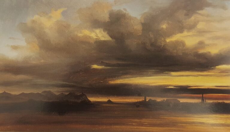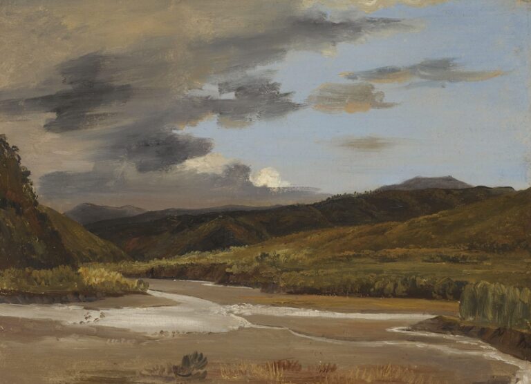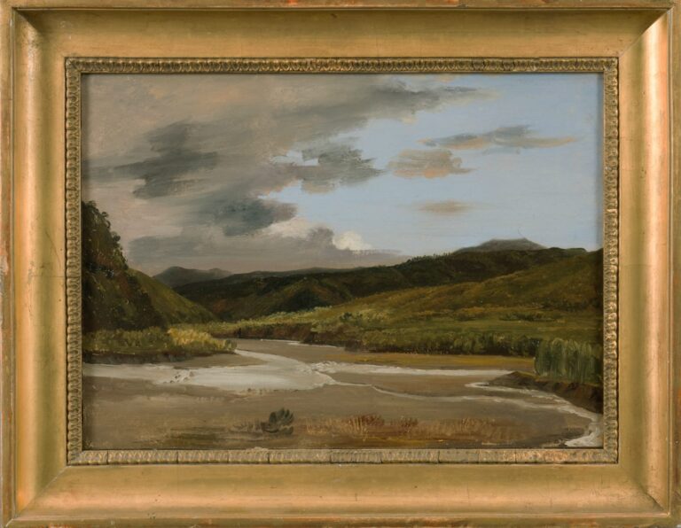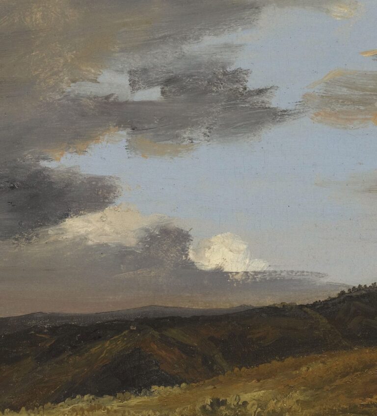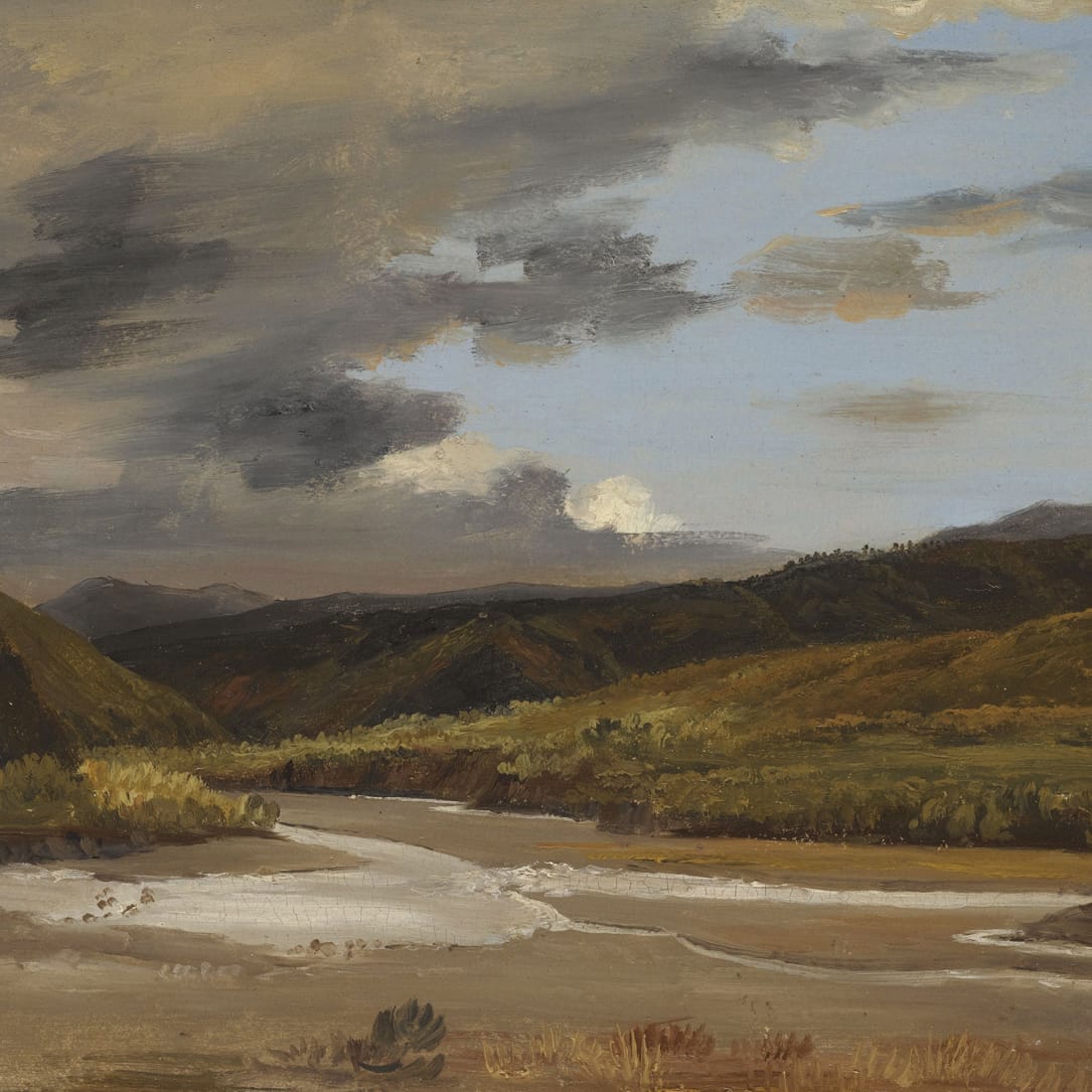 Coignet was already painting plein air sketches during the early 1830s, and a rare dedicated sale of a series of these sketches made in France, Switzerland and Italy was offered at public auction in Paris in 1834.2 A River Landscape attributed to Coignet is part of the Gere Collection, now in the National Gallery, London (fig.).3 The loose handling and silhouettes of the tree tops on the distant ranges are comparable. In the broad execution of the sky, our sketch is comparable to Coignet’s Sunset over the River Rhine with the City of Bonn Beyond, datable to around 1829, which was on the art market in 2007.4 Our sketch is likely to date from the same period, around 1830. It is obvious that the loose touch developed by the plein-air painters was highly influential to the Impressionists of the following generation.
