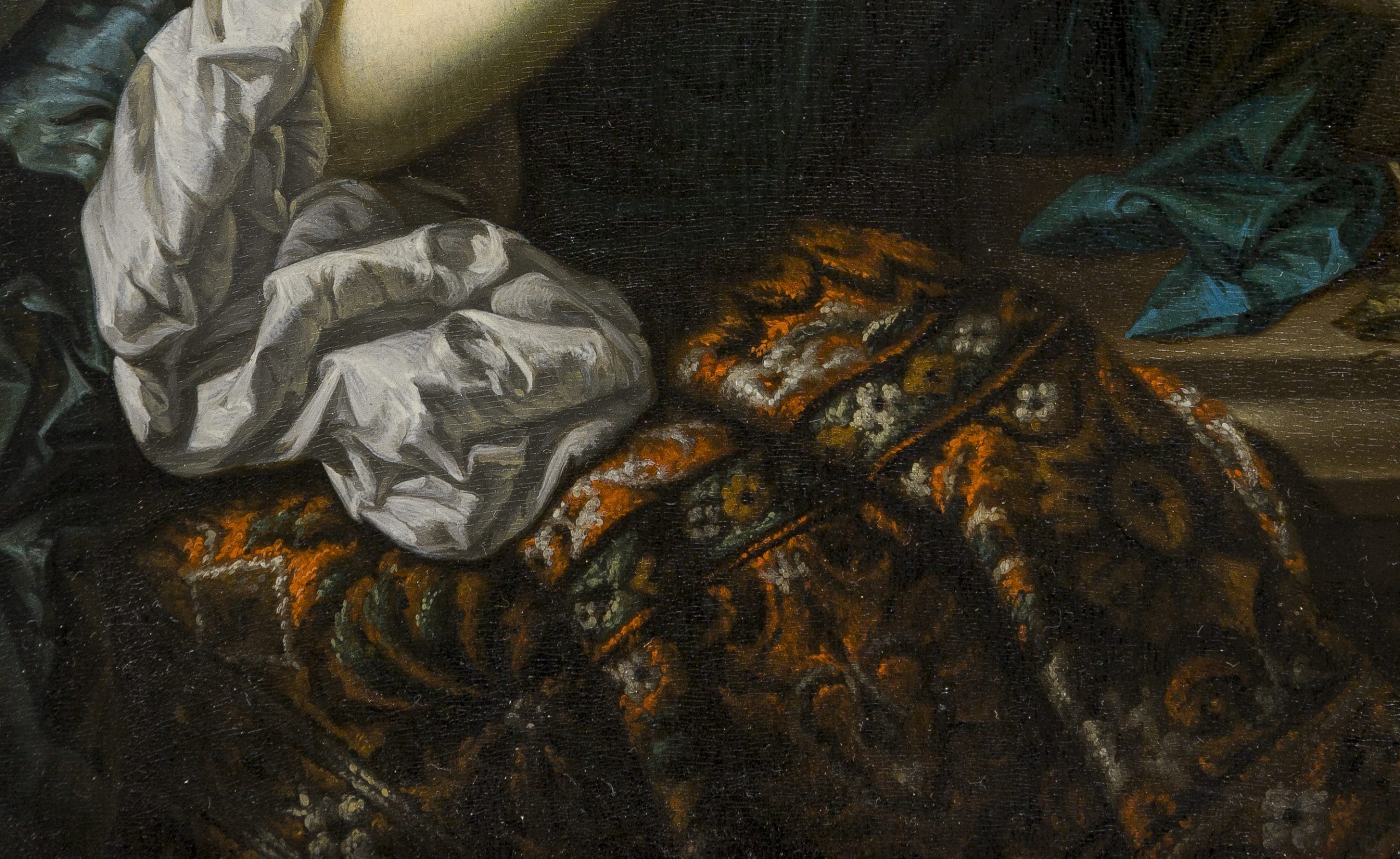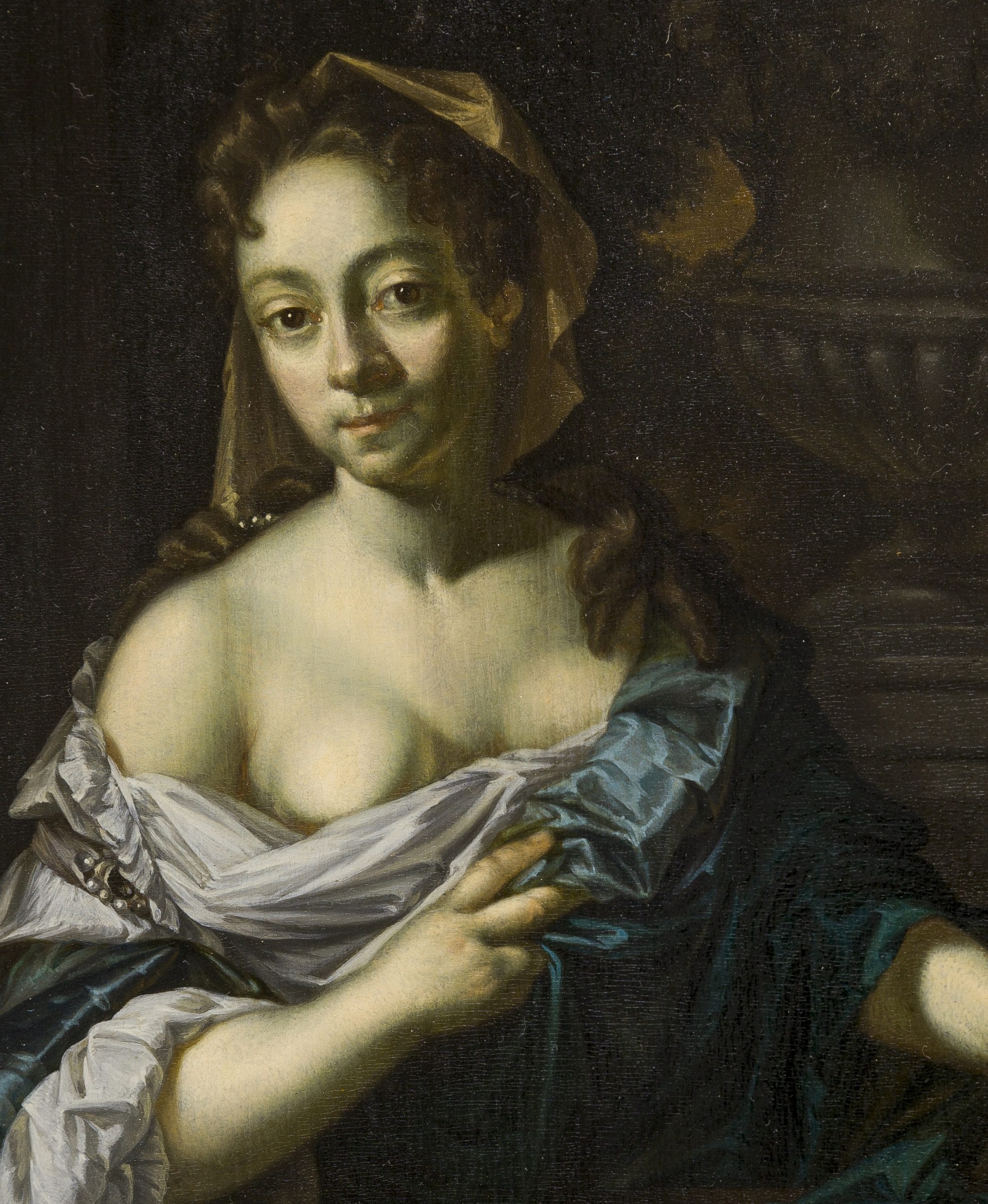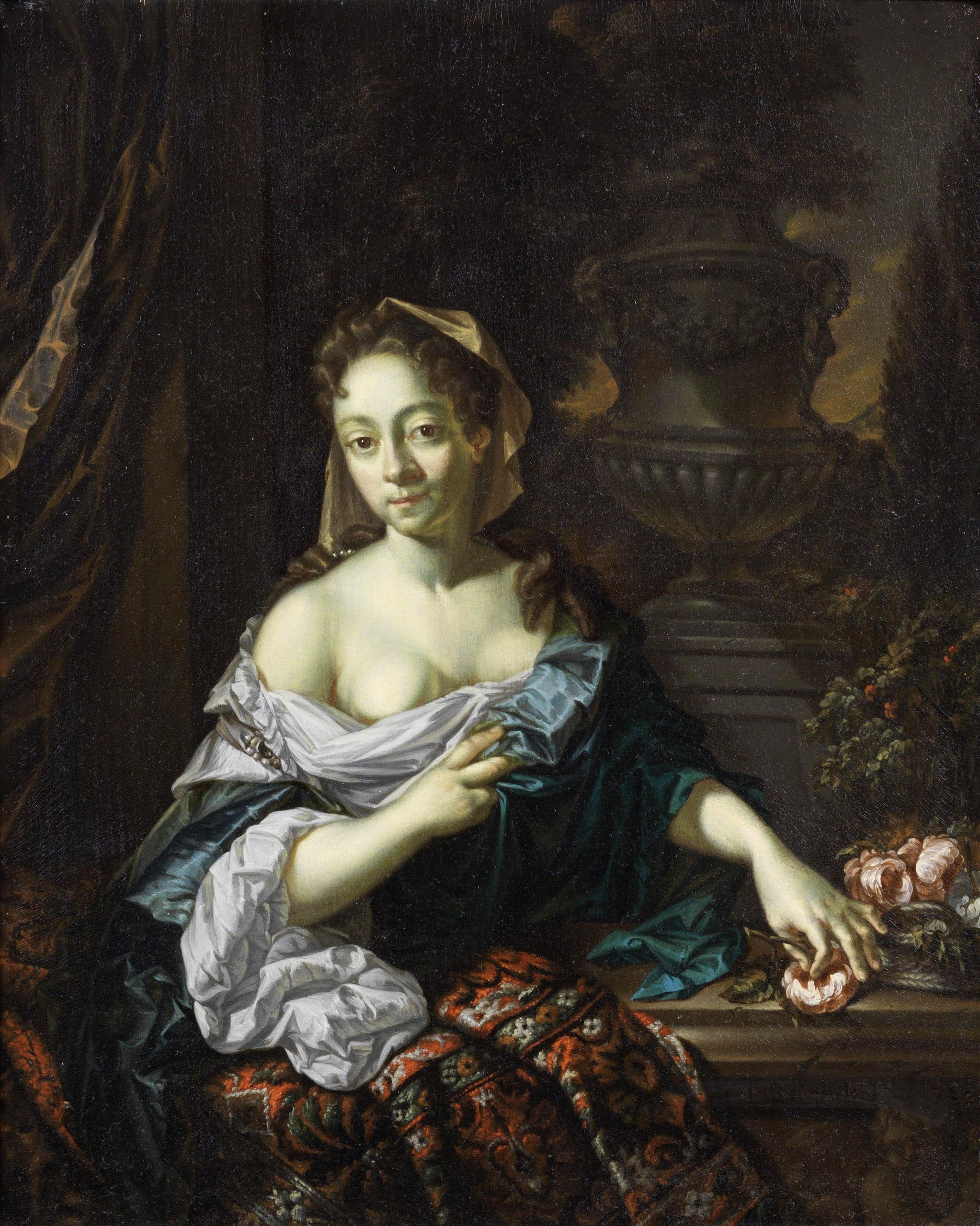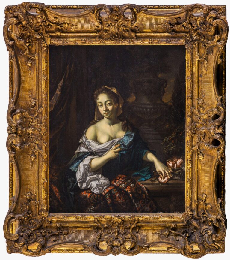 This rare painting is in very good condition and illustrates Beugholt’s talented hand, especially in the meticulous and jewel-like depiction of various surfaces and fabrics, in which the fine painters excelled, from the soft skin tones to the silks and linens of the lady’s garments and the richly coloured Persian carpet, draped over the stone balustrade. The imposing stone vase inspired by Daniel Marot in the background is typical for this late Baroque period.