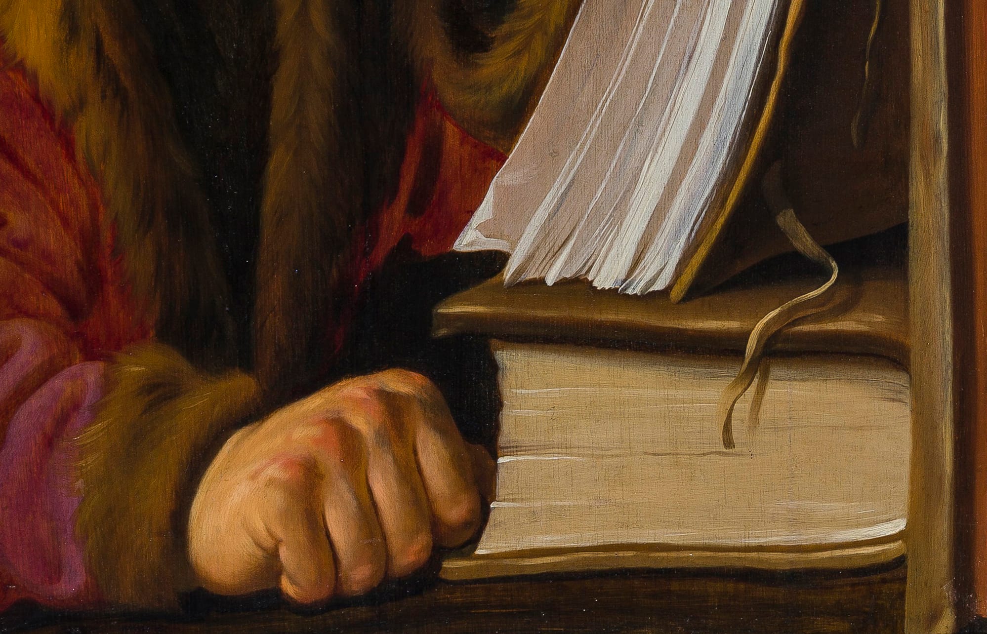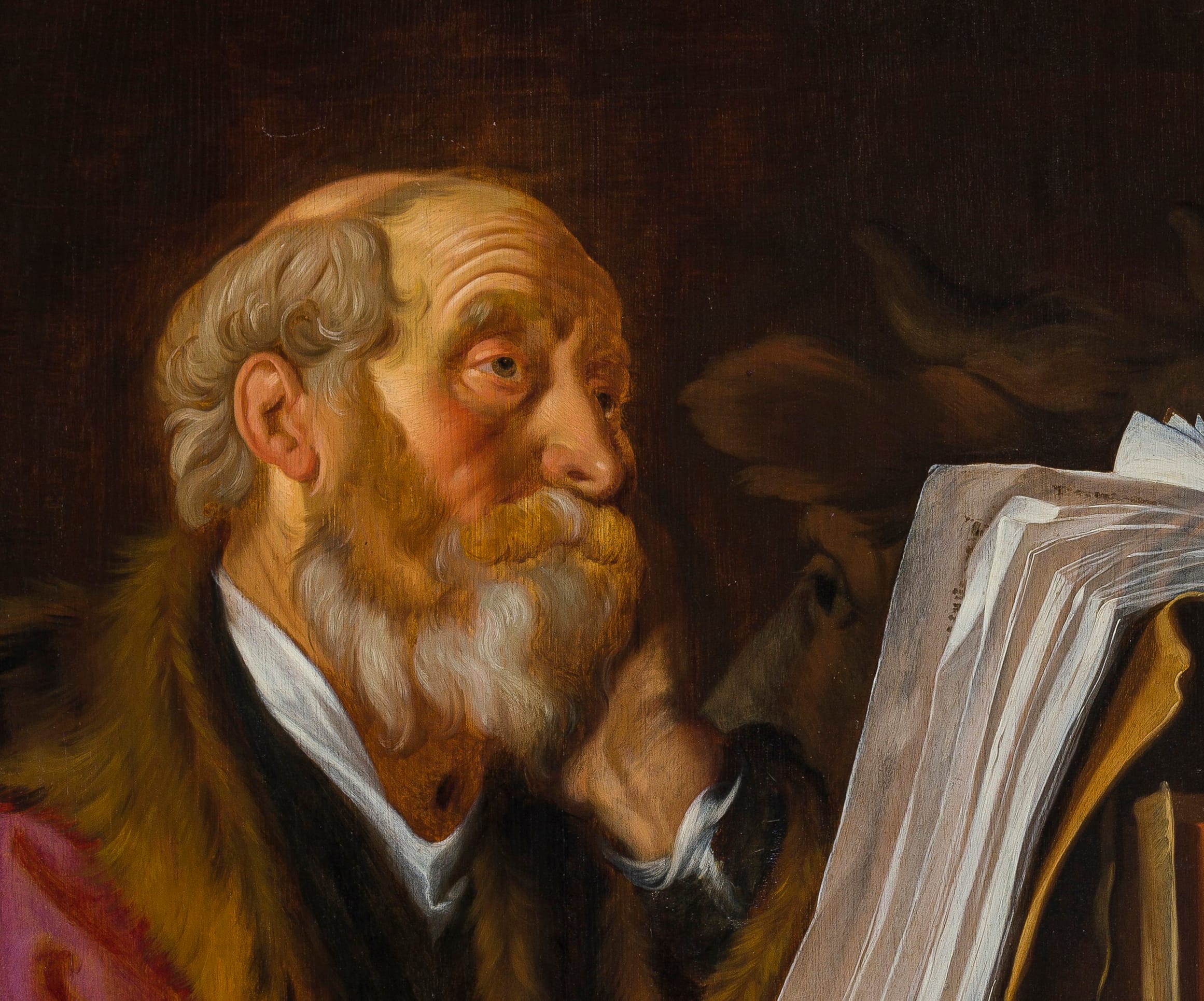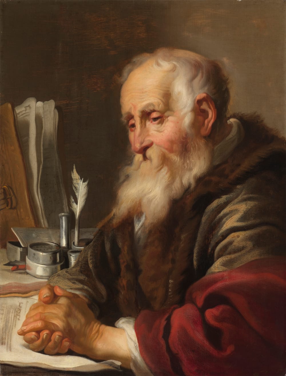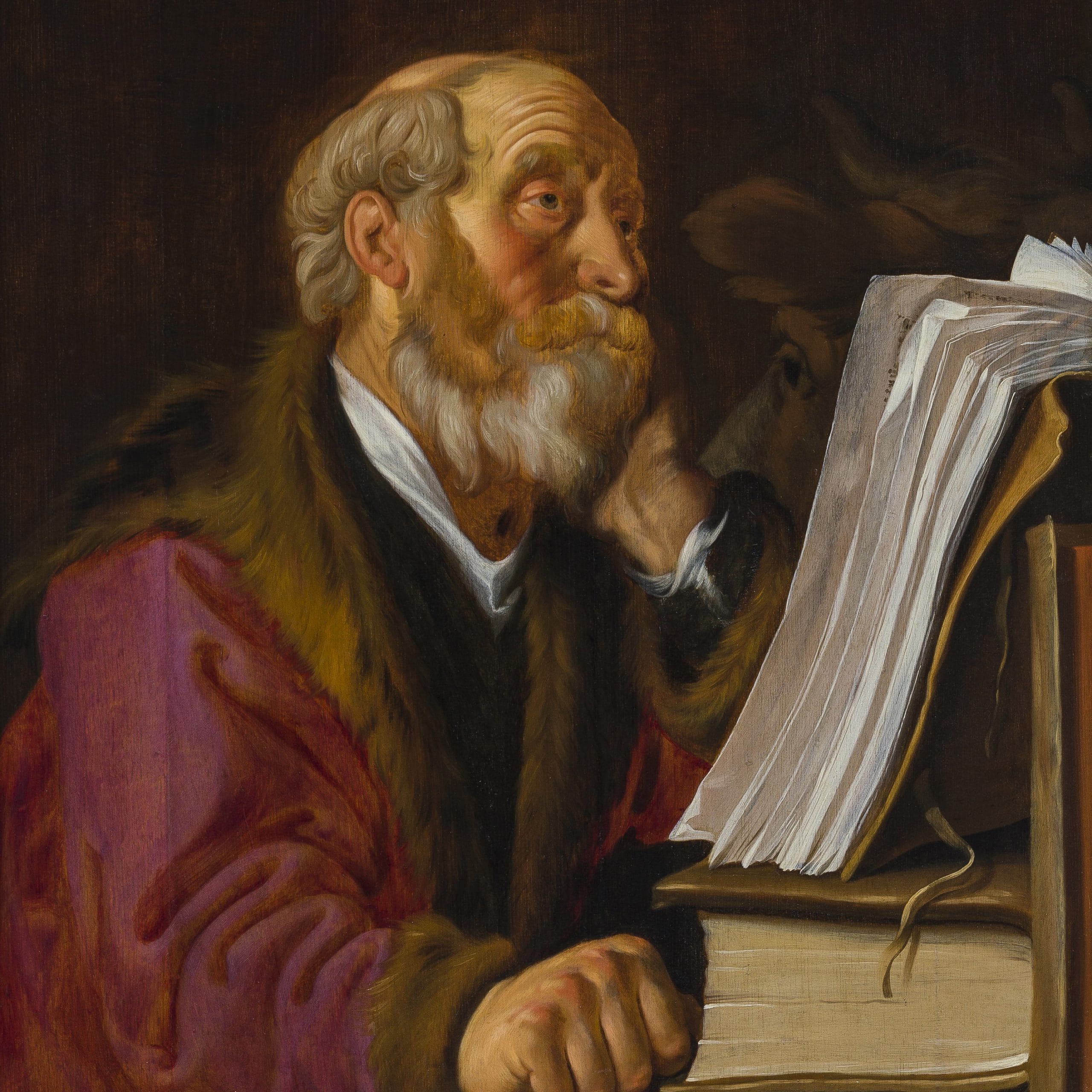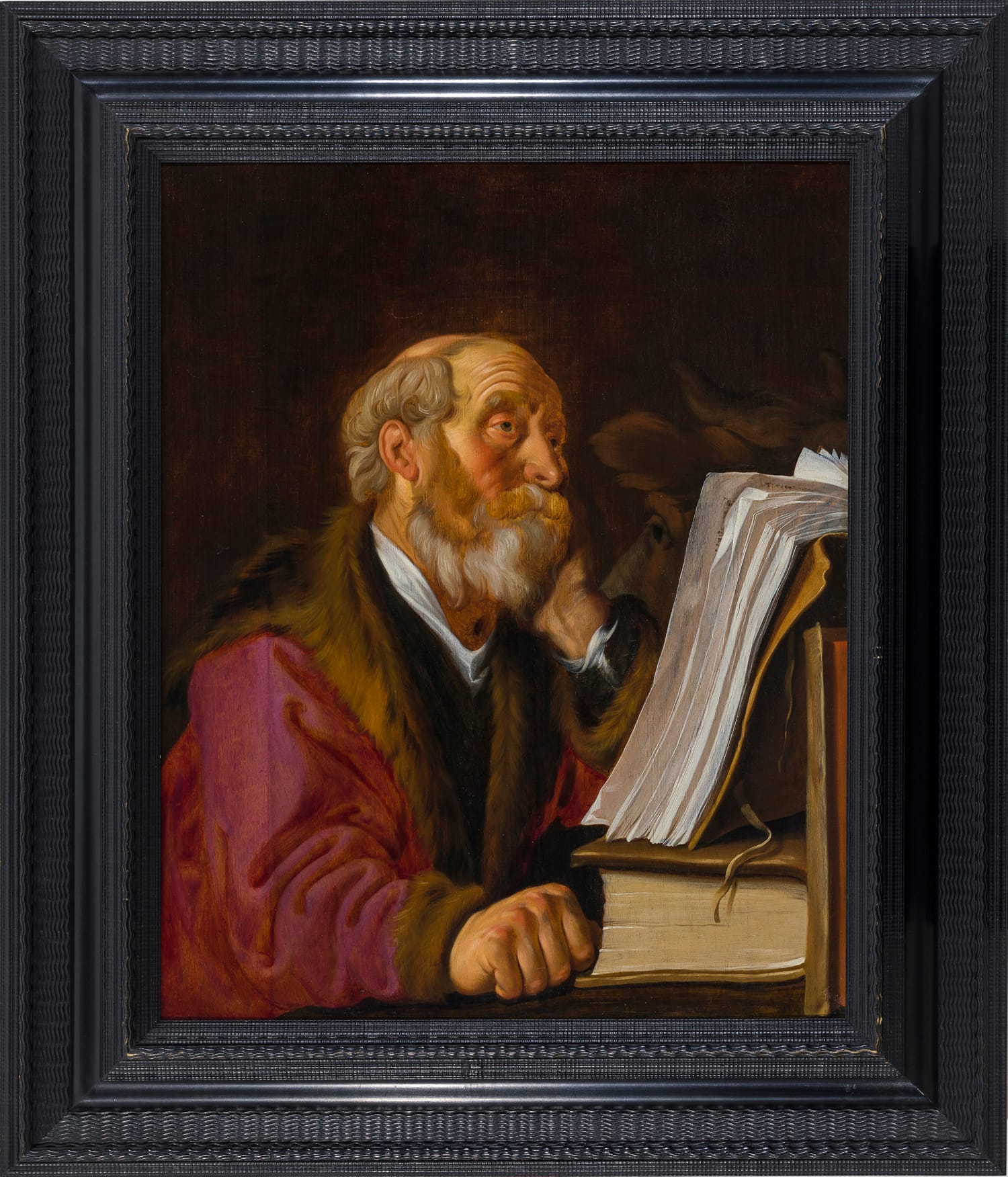 Jacobsz painted several series and possibly individual representations of the four Evangelists. A set of the four saints of circa 1630/31 is preserved in the collection of the Musée des Beaux-Arts, Rouen, which includes a Saint Luke shown en profil (fig.).3 These evangelists are thought to have been inspired by a set of the four evangelists of c.1629 by Jan Lievens, now in the museum in Bamberg.4 Our Saint Luke was most likely also originally part of a set of four, though the other saints are now no longer known. In handling and colouring, it is very similar to a painting by Jacob Backer representing a scholar at his desk of c.1632, now in the Leiden Collection (fig.).5 Our painting appears to date also from the years around 1630, and is for instance comparable to Jacobsz’ painting of St Paul the Hermit Writing in his Study of 1629,6 and also with his painting King David Playing the Harp of the same year, in the collection of the Fries Museum in Leeuwarden.7