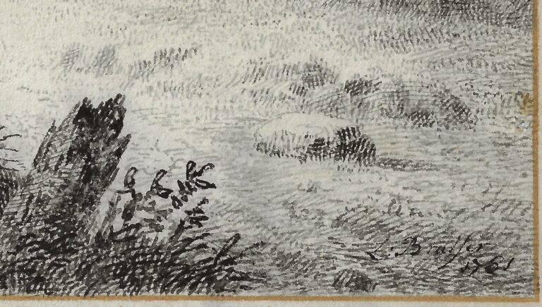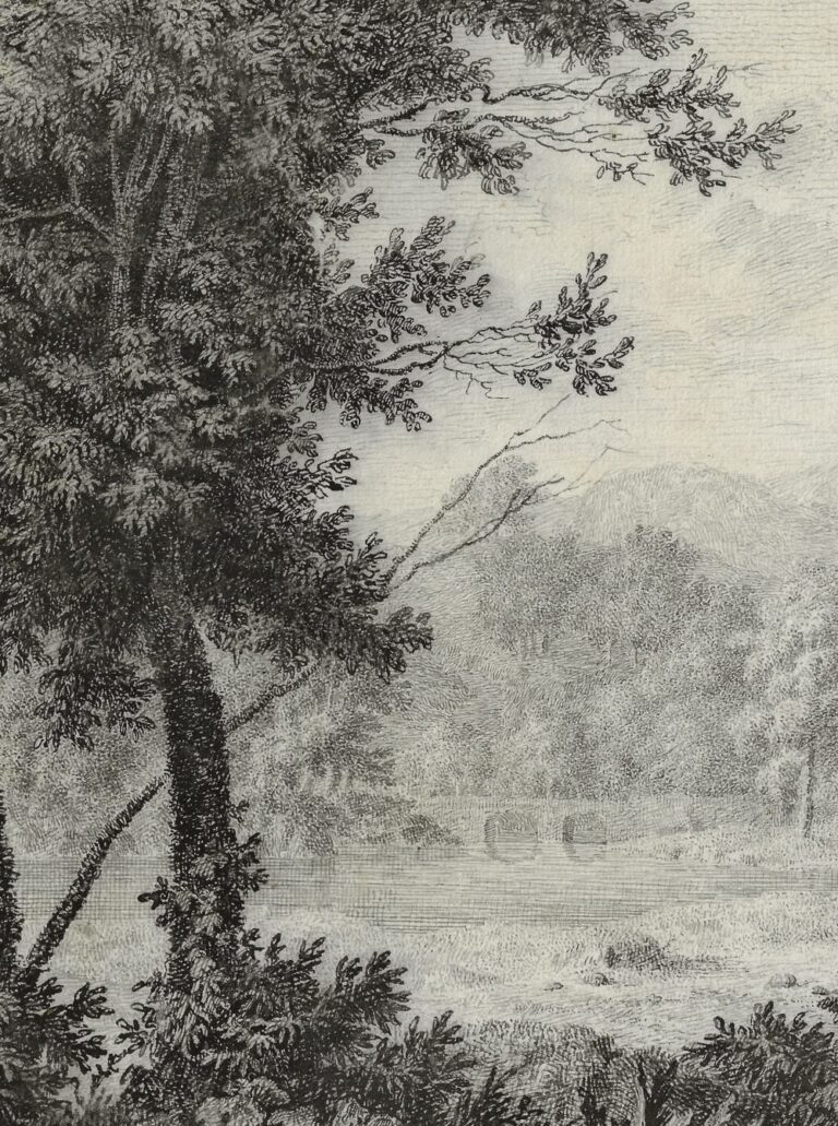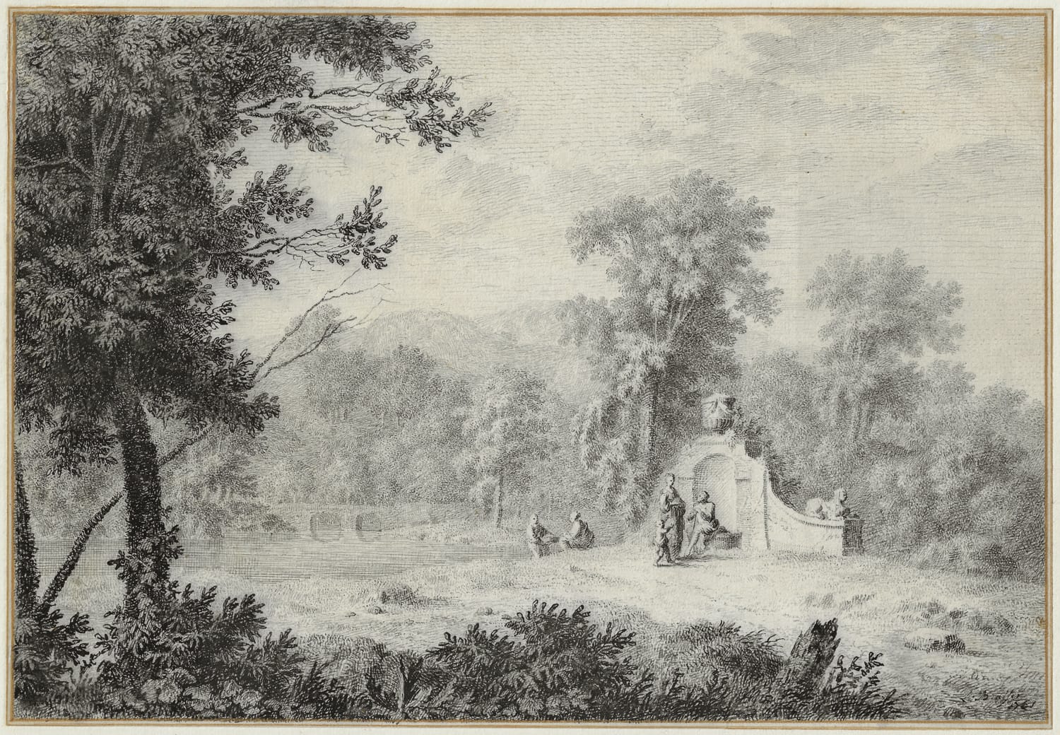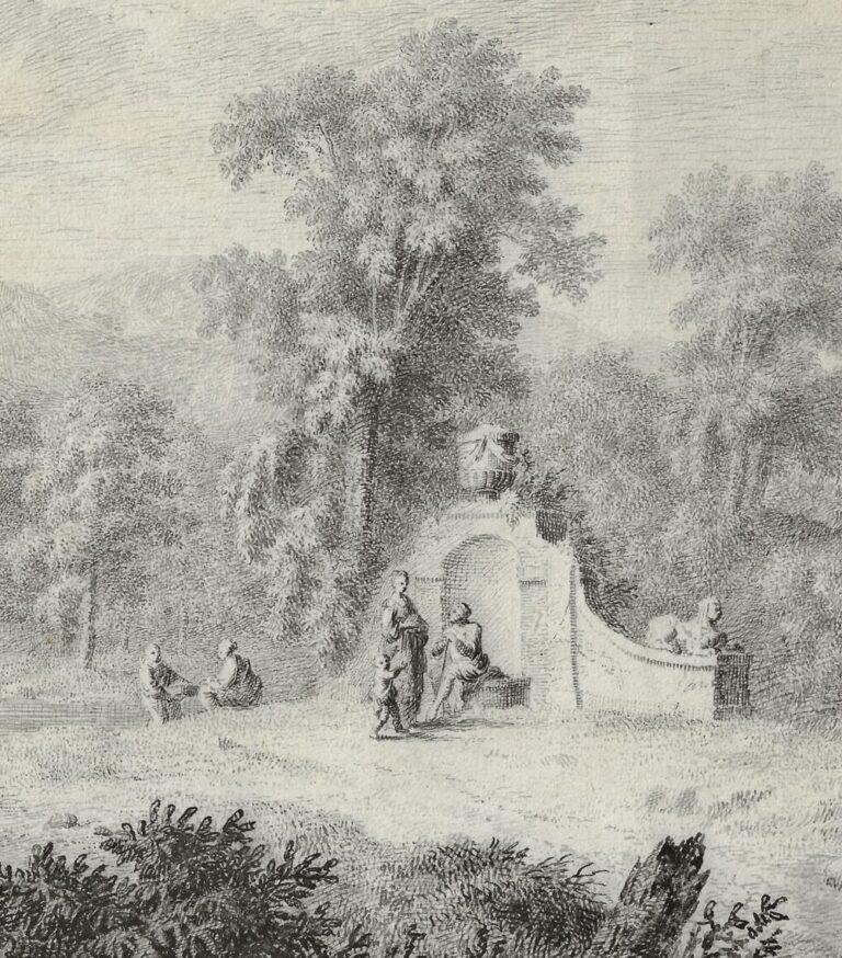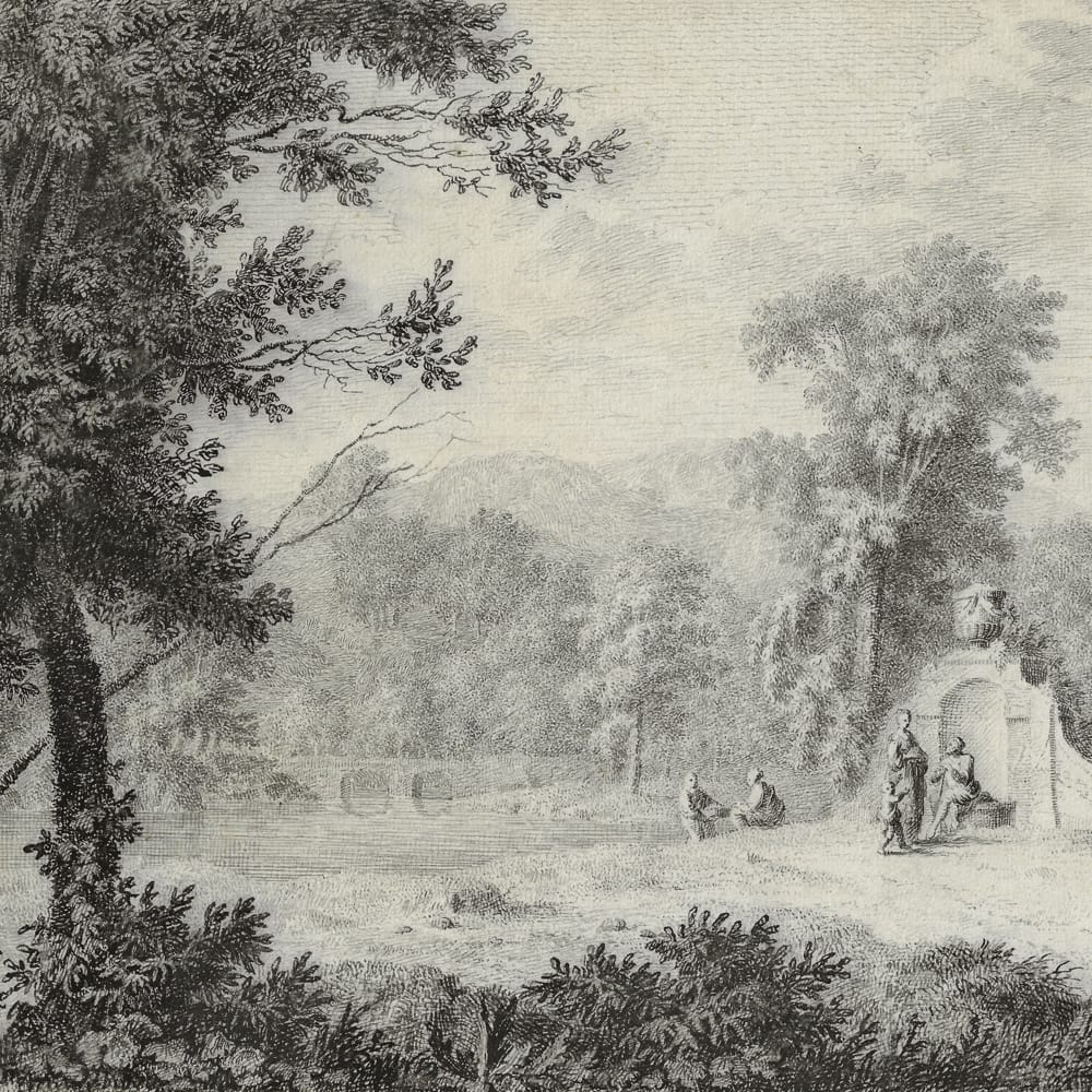 Despite this known group of Arcadian drawings by Brasser, and possibly more examples that he managed to sell during his lifetime, virtually none have survived to this day, with the notable exception of the present large and decorative sheet. The draughtsmanship is particularly distinctive: Brasser constructed the sheet with a myriad of dots, tiny strokes and undulating lines, almost pointillist in manner, and reflecting his activities as an engraver. Moreover, the employed black ink is reminiscent of ink used for engravings, rather than the favoured brown ink of the period. It is possible the drawing was made as an imitation of a print, as an example of virtuosity. The sculpted sphynx at the base of the shallow arched niche in the drawing is an early example of Egyptomania. The Arcadian landscape itself illustrates the fashion for English landscape architecture that evolved during the second half of the eighteenth century, more natural than the earlier Baroque symmetrical ‘French’ manner.