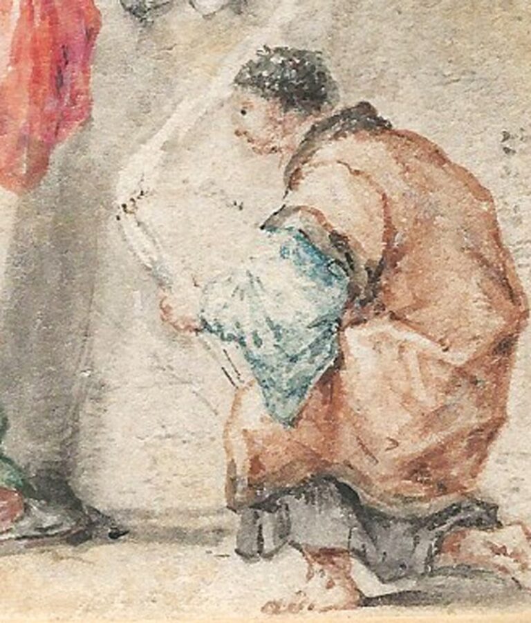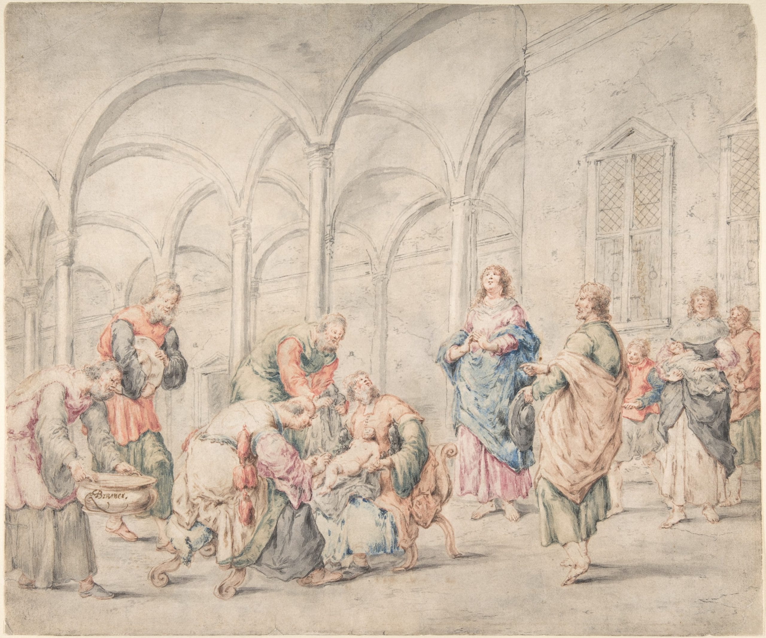 This charming drawing on vellum must originally have been part of a series of the Life of Christ, intended to be sold to a private collector, as is evidenced by Bramer’s employment of the expensive vellum as support. It is thought that Bramer’s coloured drawings were executed towards the end of his career, during the 1660s.2 The artist is unique in Dutch art of this period in his preference for coloured drawings of religious scenes, which he made in large numbers. Some twenty series of the Life of Christ are known, some originally consisting of around ten or twelve sheets, others of as many as fifty. This is the case with a set that survives complete in its original binding in a private collection in The Netherlands.3