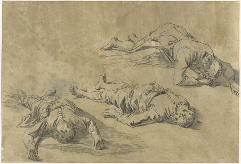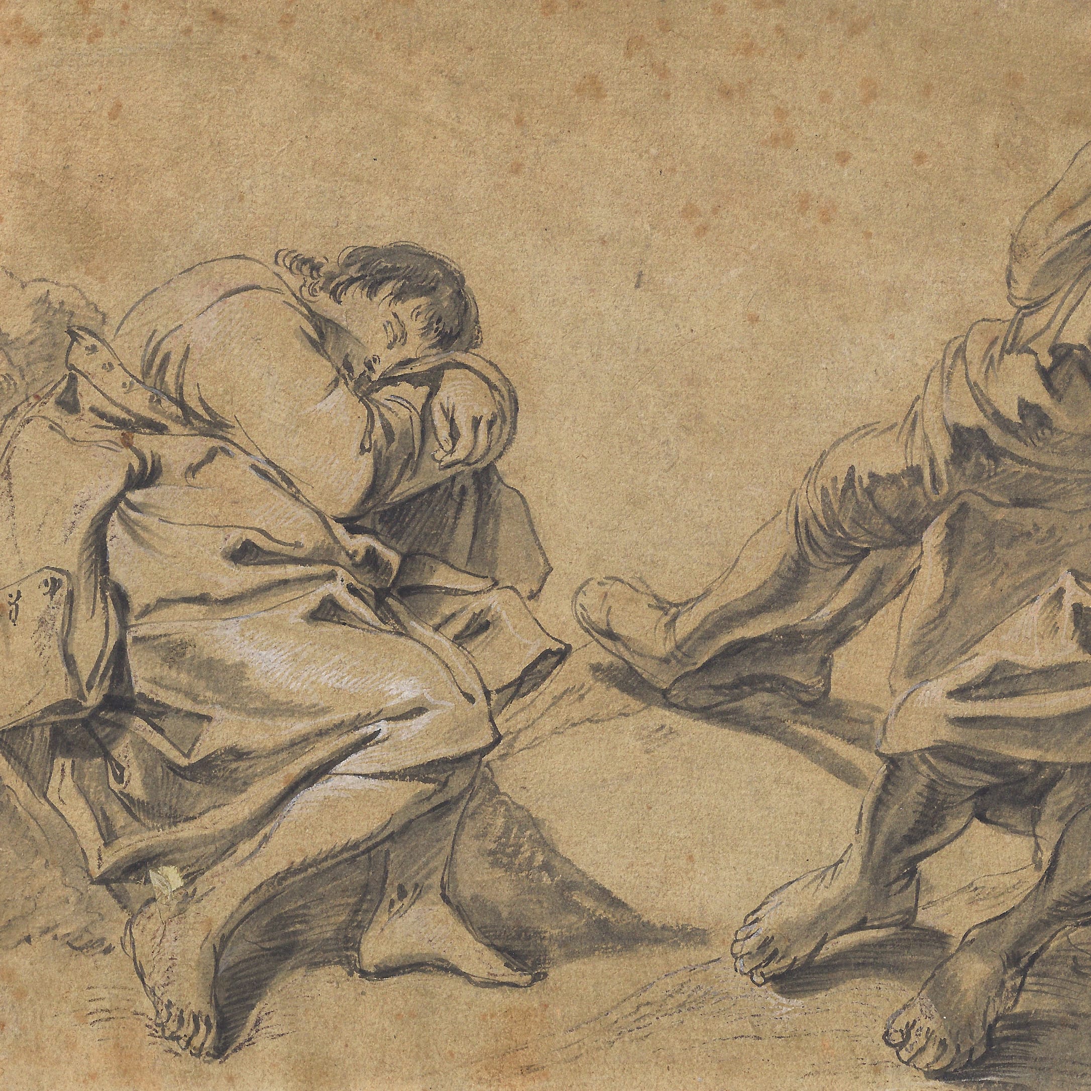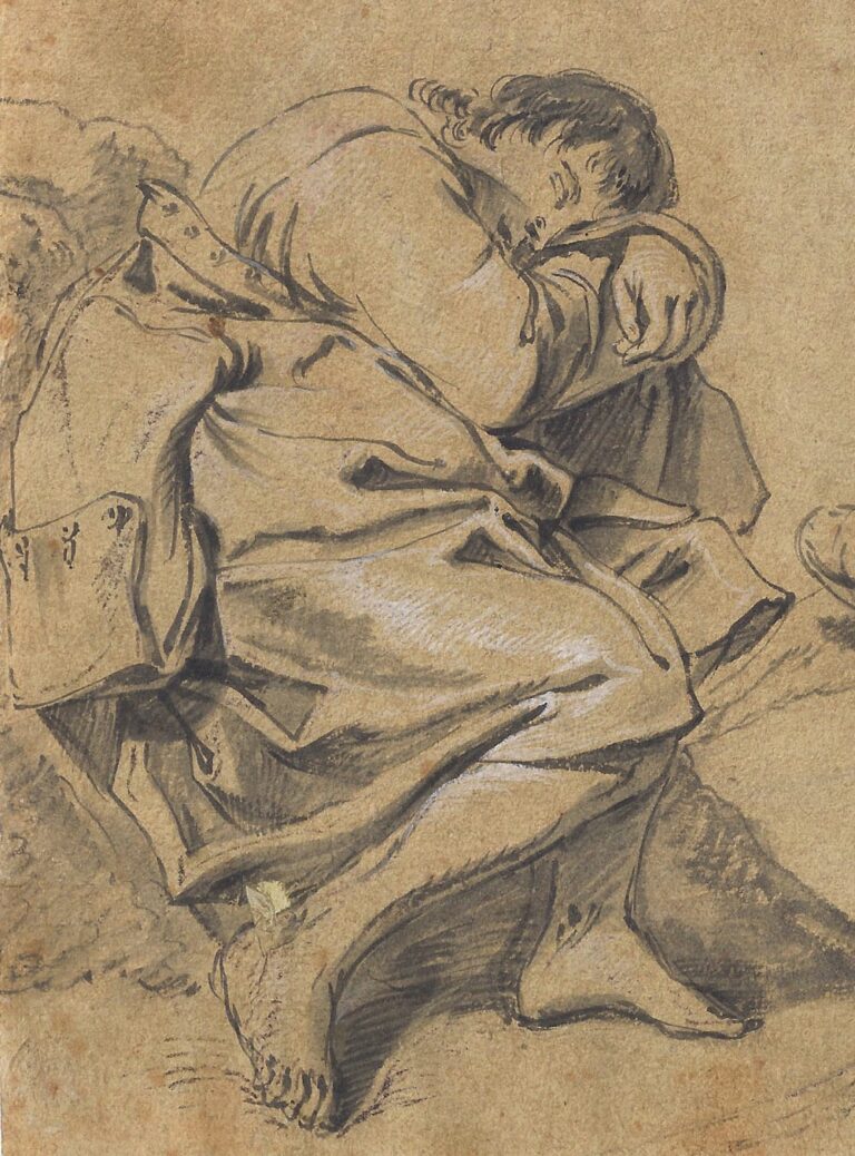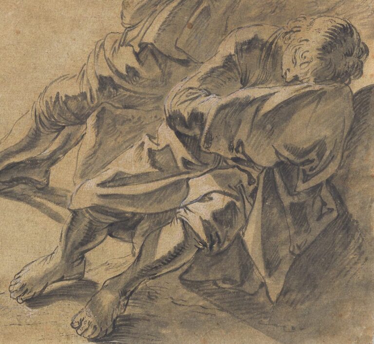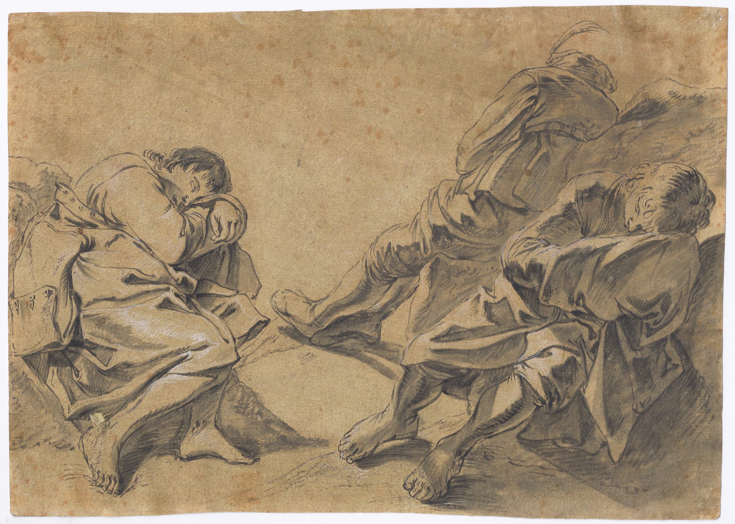 Almost all of Bramer’s drawings sprang from his imagination. The related Rijksmuseum sheets are thought to have drawn in this way, but our drawing has the appearance of being observed from life, which makes it a rarity in Bramer’s drawn oeuvre. Figures from the model sheets generally do not appear in the artist’s painted works; the three figures in our drawing do not appear to occur in any of Bramer’s paintings. Although the clothing appears to be seventeenth-century, the figures are reminiscent of scenes of sleeping apostles in depictions of the Agony in the Garden, such as Bramer’s drawing of the subject preserved in the Kunsthalle, Bremen (see last fig.).4
