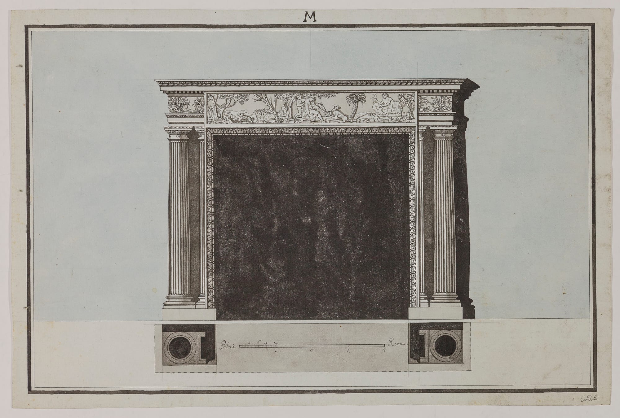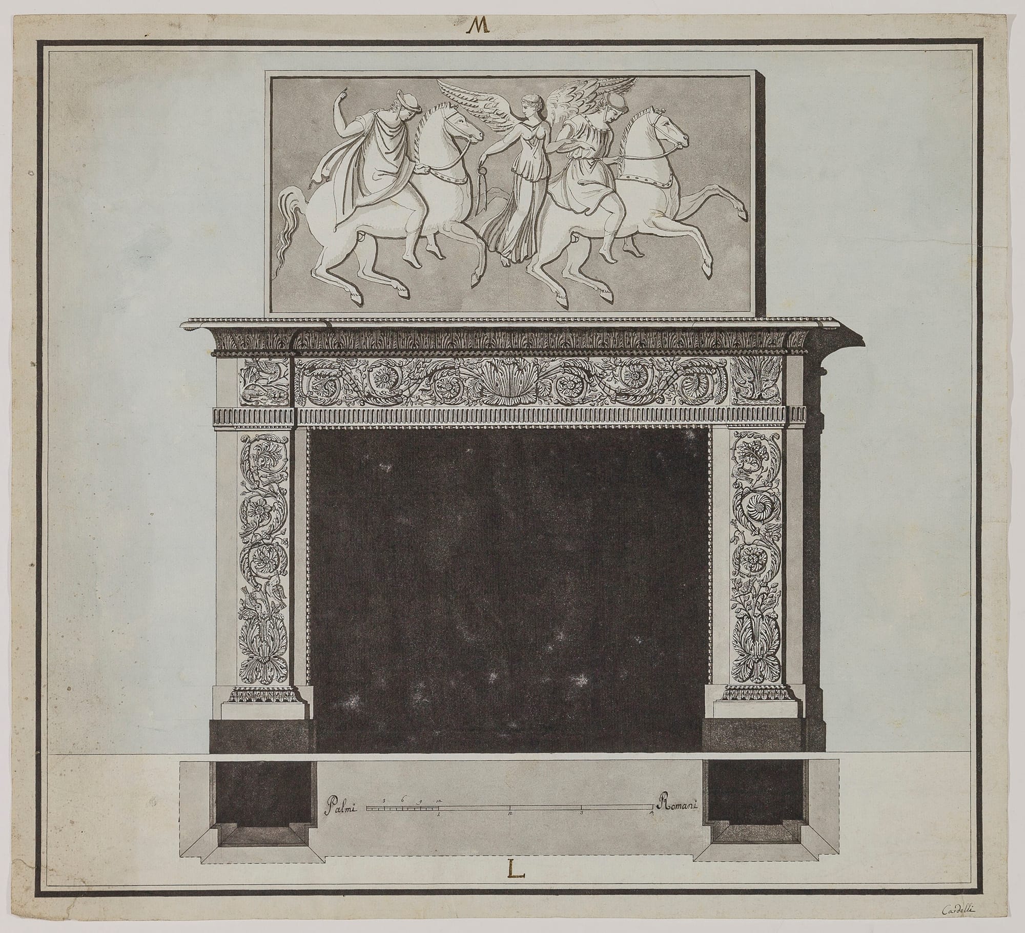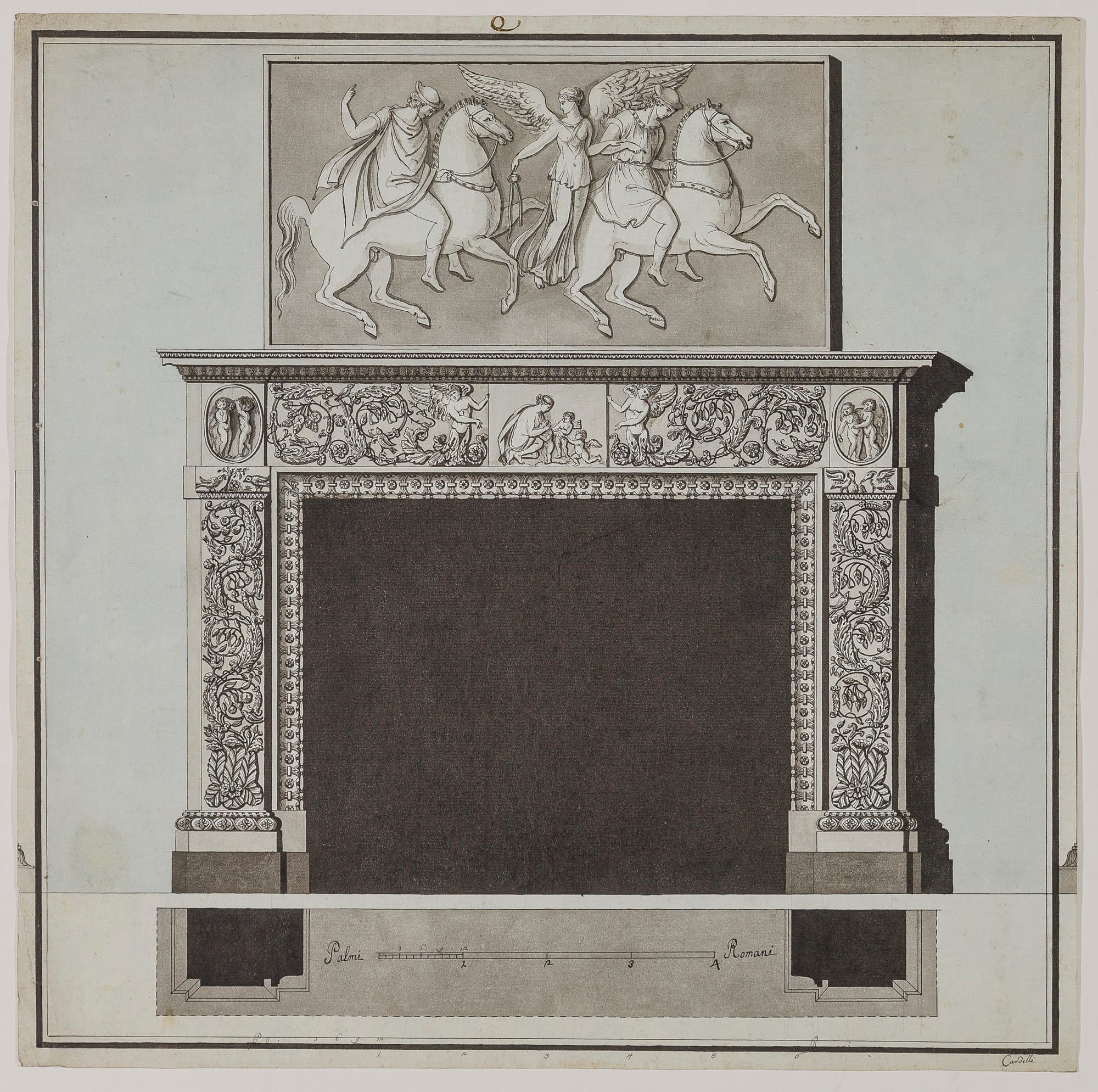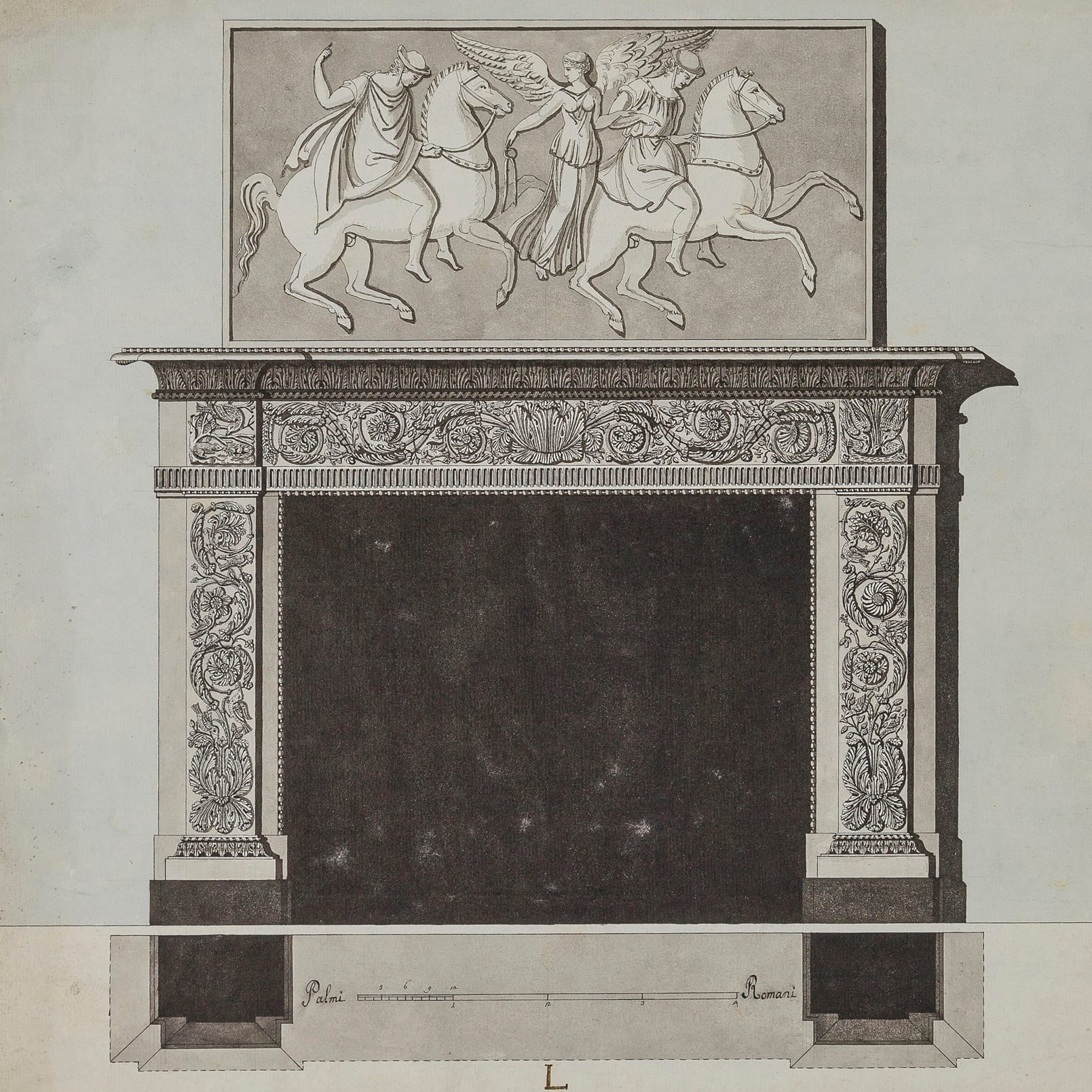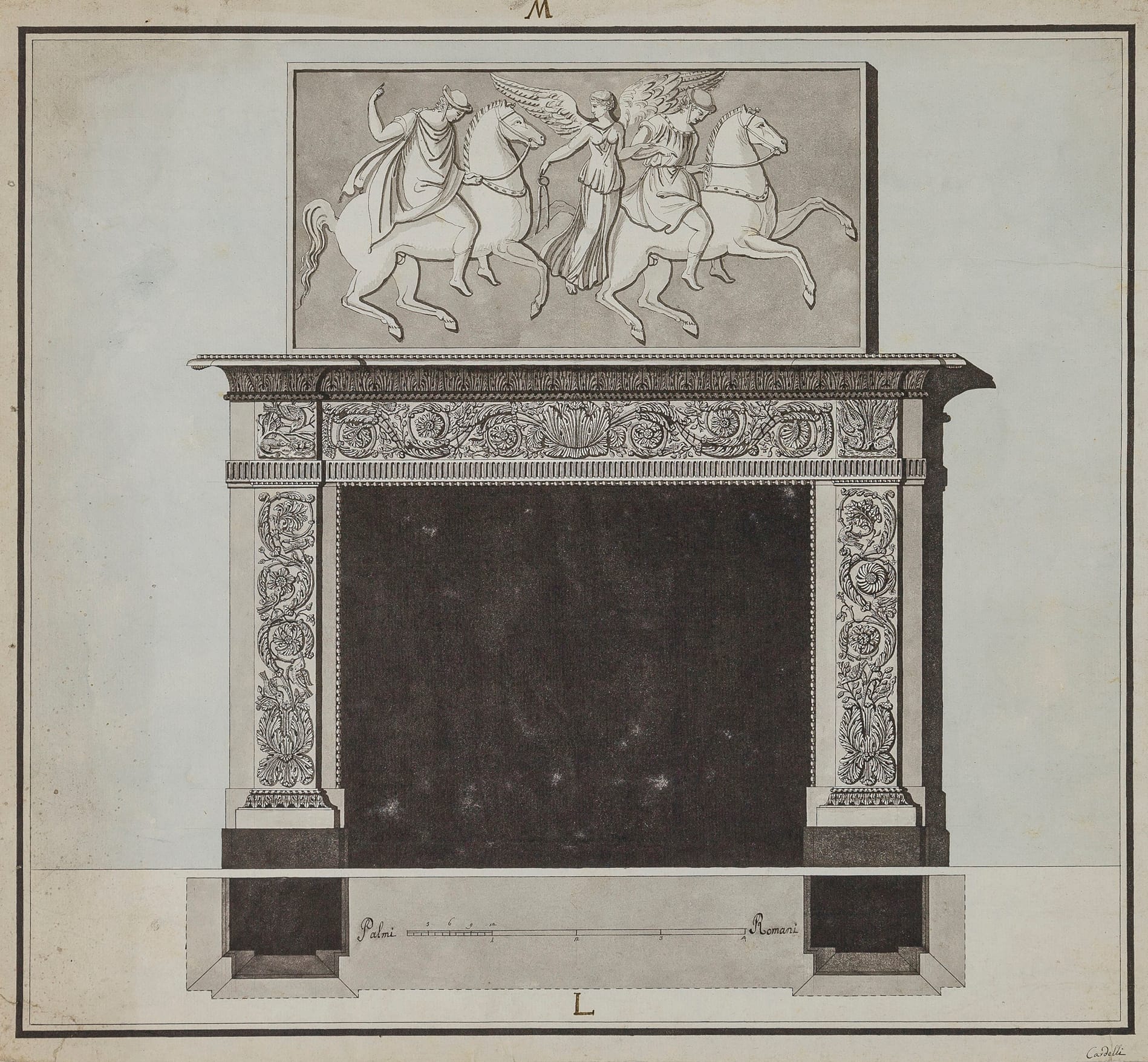 Surviving designs and presentation drawings by Cardelli are exceptionally rare. A marble chimney by Cardelli which is comparable in design to the drawings shown here was bought in Rome by Friedrich Wilhelm von Erdmansdorff (1736–1800) for King Friedrich Wilhelm II of Prussia (1744–1797) (fig.).5