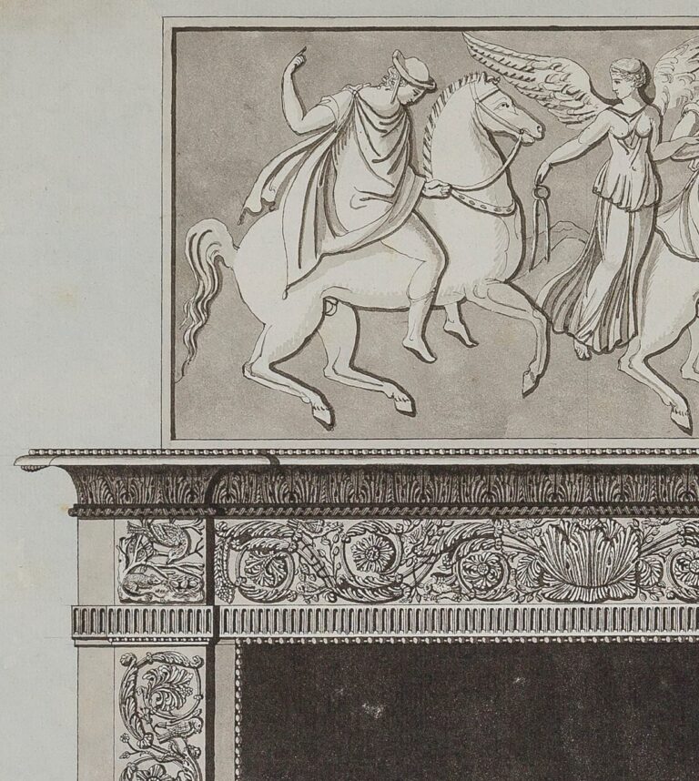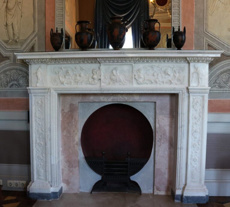 During the late eighteenth century, the Italian neoclassical taste and design occasioned Rome to become the production centre for fireplaces for the wealthiest members of the European aristocracy. A number of recorded chimneypieces in both Italy and in country houses around Britain were supplied by Cardelli, often to travellers who had embarked on the Grand Tour. A chimneypiece purchased directly from Cardelli in 1771 by the Collector Thomas Mansel Talbot survives at Penrice Castle.3 Other chimneypieces by Cardelli can be found in the Queen’s ante-chamber at the Palazzo Pitti, with another in the Quirinale.4