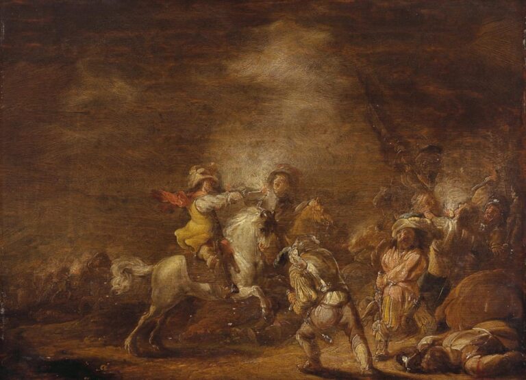 Although paintings by Scheits are rare, good examples are preserved in the collections of the Universiteit van Amsterdam, Amsterdam, the Deutsche Barockgalerie, Augsburg, the Hamburger Kunsthalle, Hamburg, the Schönborn collection at Schloss Weissenstein, Pommersfelden and the Kadriorg Art Museum, Tallinn. Our painting can for instance be compared to Scheits’s painting of a Cavalry Skirmish in the Hamburger Kunsthalle (fig.).2