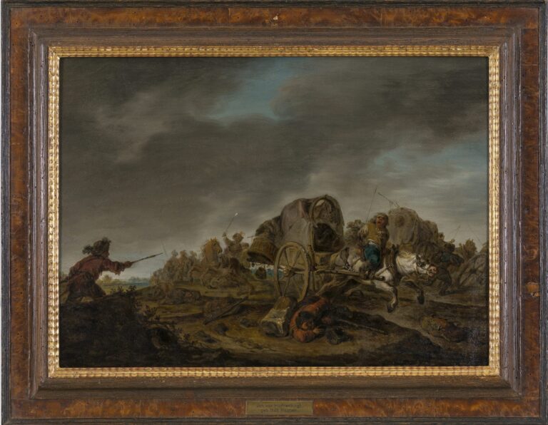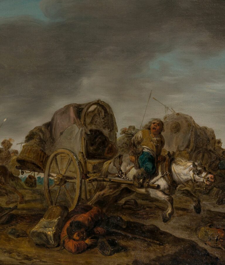 The loose handling of this recently discovered painting recalls the influence of Haarlem painters, not only Scheits’s master Wouwerman, but also other contemporary painters such as Adriaen and Isaac van Ostade and ultimately Frans Hals. The work may have been painted during his time in Holland during the 1640s but could also have been painted in Germany after his return to Hamburg. As was noted out by Dr Fred Meijer, the fairly dark and romantic sky is typical for the artist.