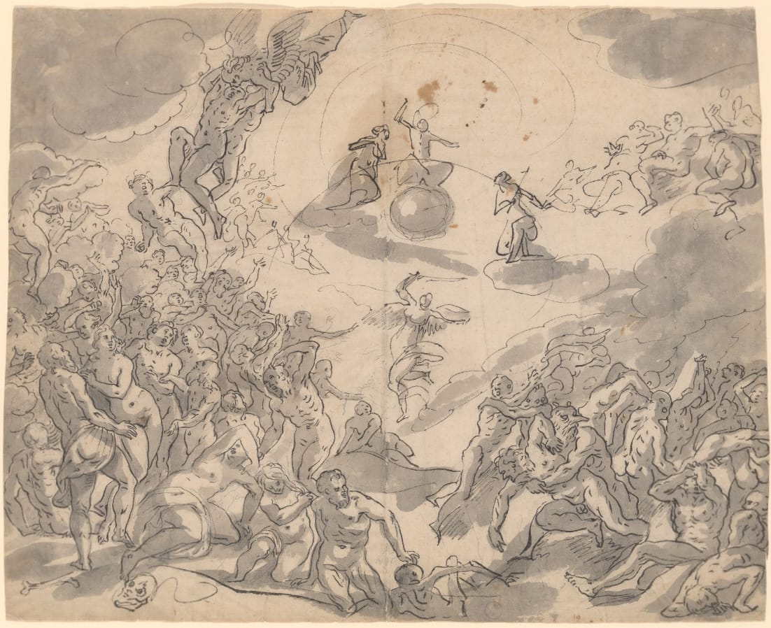 The present drawing can for instance be compared to Herr’s Last Judgment in the Metropolitan Museum, New York (fig.).2 The human musculature is drawn with a rather wide pen, with undulating outlines subtly varying in strength. The way in which the artist has drawn the heads is especially comparable, in particular of figures looking up. The rather pointed feet, particular those of Christ in the present drawing, are also typical. Herr’s Rape of the Sabine Women of 1626 in the Staatsgalerie, Stuttgart, also shows clear parallels to our drawing (fig.).3 Again the figures have been drawn with undulating lines of various width, and the architecture in the background is indicated in a similar shorthand manner. Interestingly, the Stuttgart sheet is also from the collection of Achille Ryhiner-Delon, who kept it in his album No. 53.4