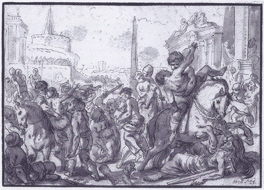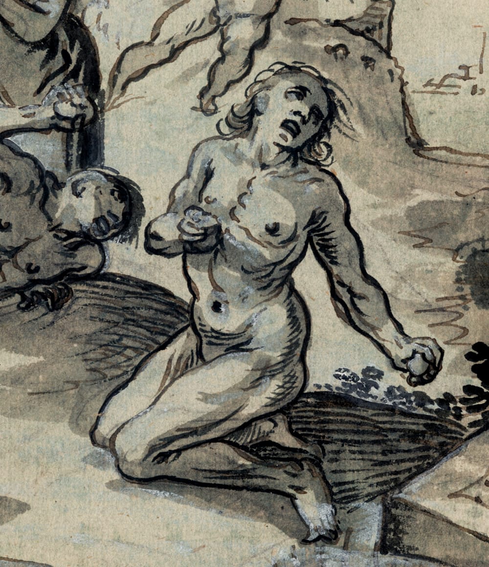 This recently discovered drawing is an interesting addition to the small oeuvre of the Southern German Michael Herr.1 Born in Metzingen, he was most likely trained in Stuttgart between 1605 and 1609, possibly by the court painter Georg Donauer, before moving to Nuremberg in 1610. He travelled to Rome and Venice in 1614-15 and was fascinated by the works of his Italian contemporaries, including the Carracci, Guido Reni, and Jacopo Palma il Giovane. He returned to Nuremberg in 1618 or 1619, becoming a master there in 1622. Herr established himself as one of the city’s leading masters and was elected to represent local artiss in the Larger City Council from 1639 onward. He not only produced historical, religious, and mythological paintings, but also received numerous commissions for epitaphs and portraits. Herr also depicted soldiers in their daily routines – a subject he could study firsthand when the Swedish troups besieged Nuremberg in 1632.
