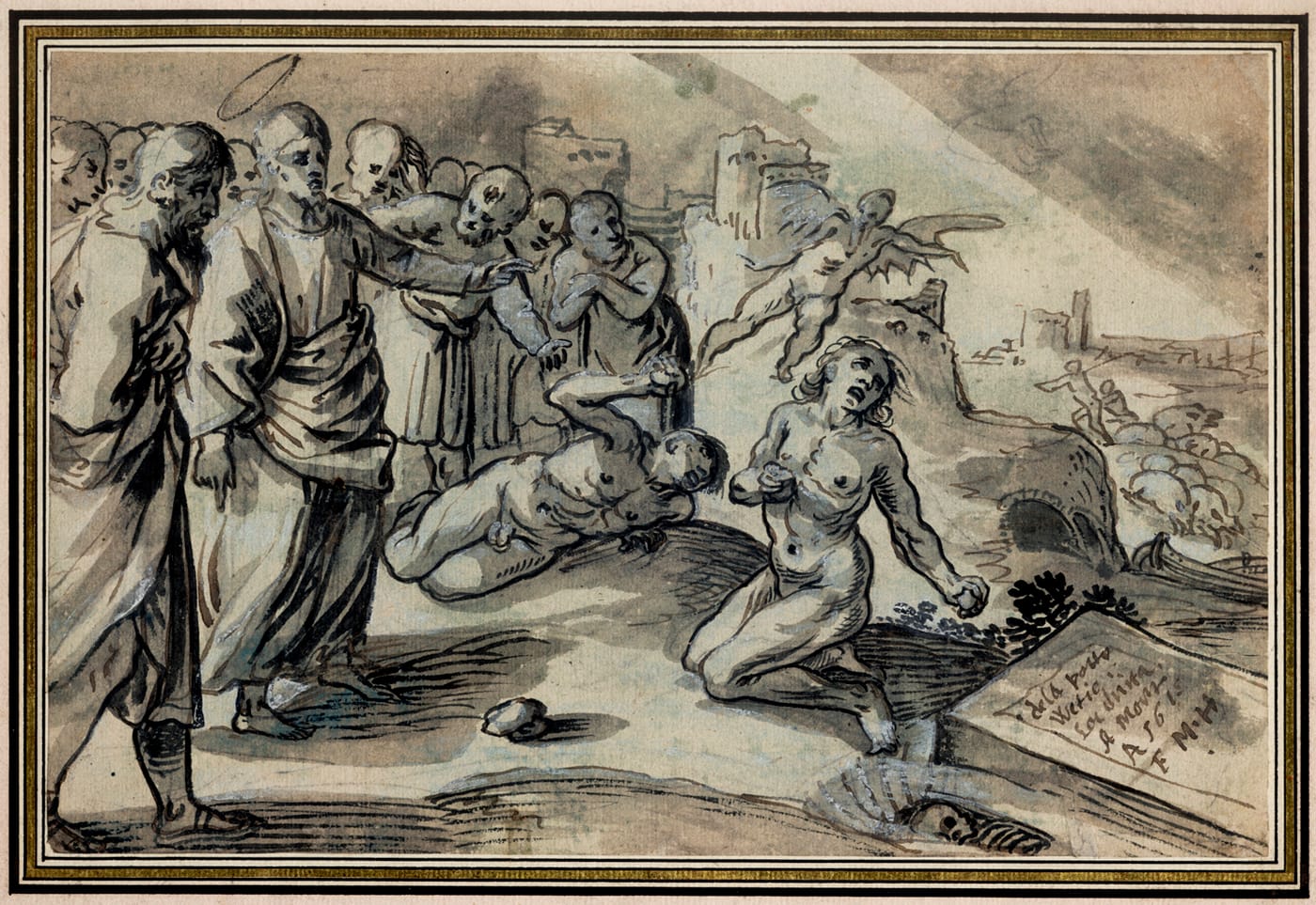 Pen and black and brown ink, grey and brown wash, heightened in white (partly oxidized) over black chalk, 198 x 301 mm (7.8 x 11.9 inch); laid down on Achille Ryhiner-Delon’s collector’s mount with framing lines in black ink, gold leaf and pink and green wash, 274 x 382 mm (10.8 x 15 inch)