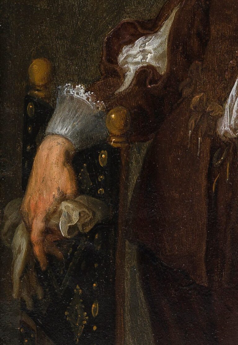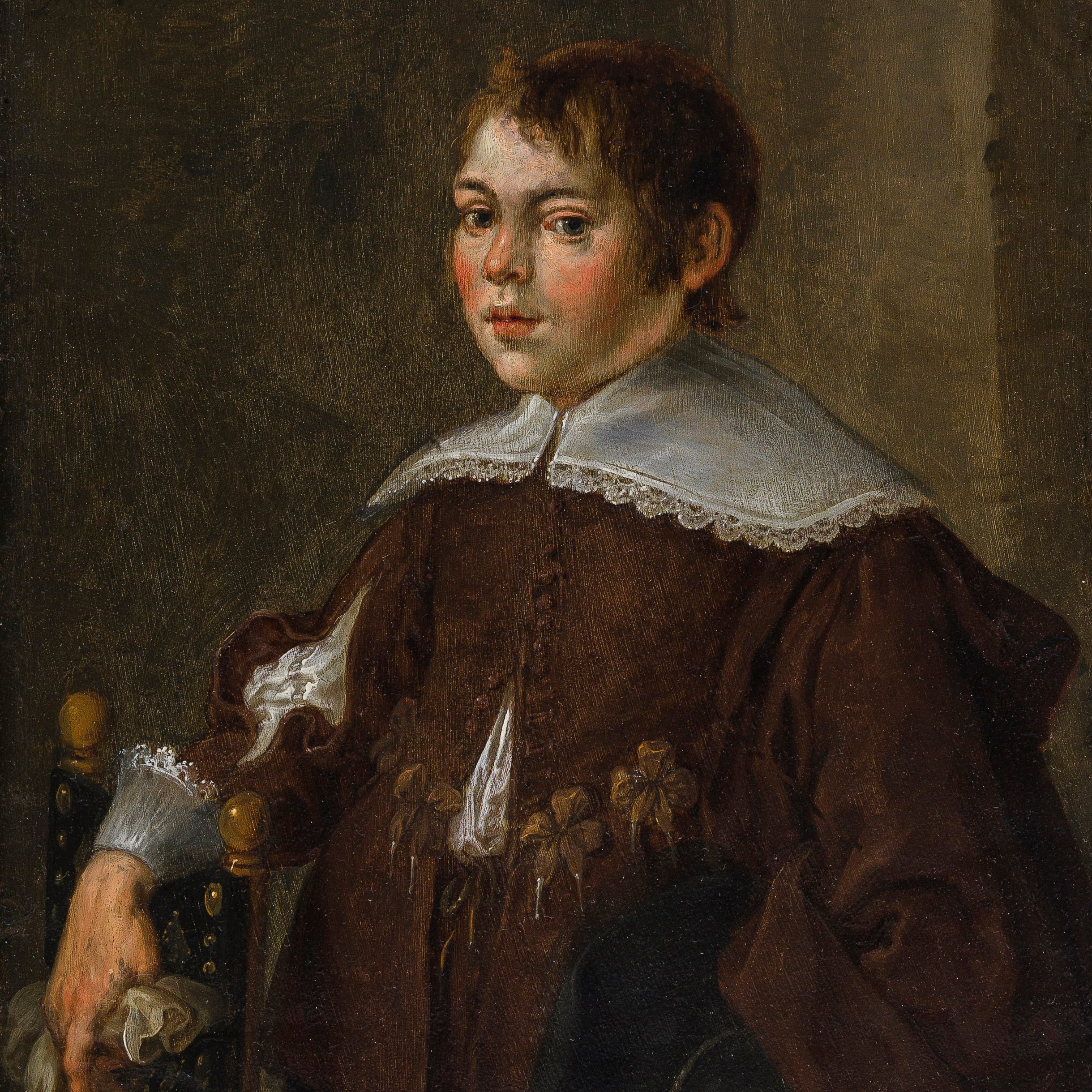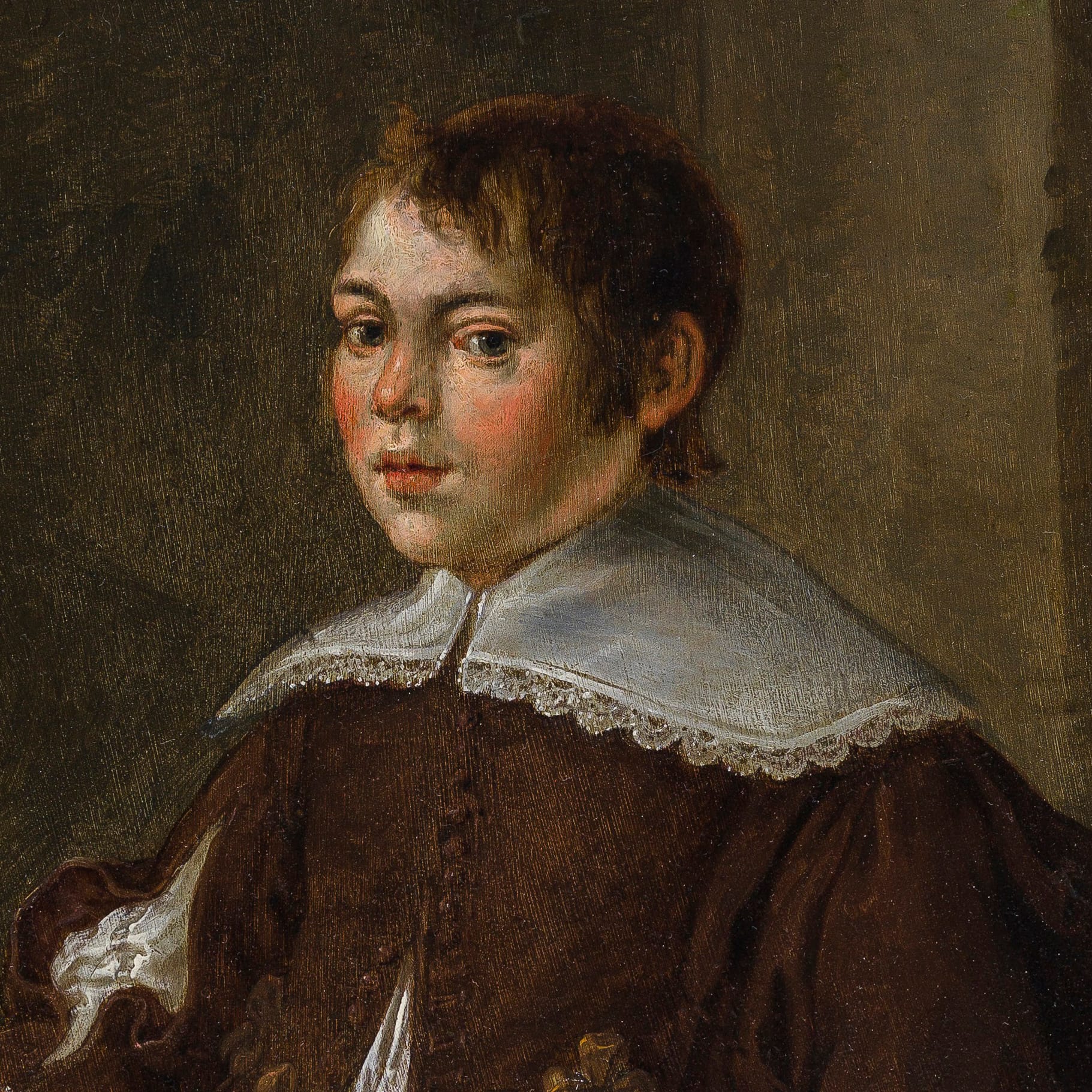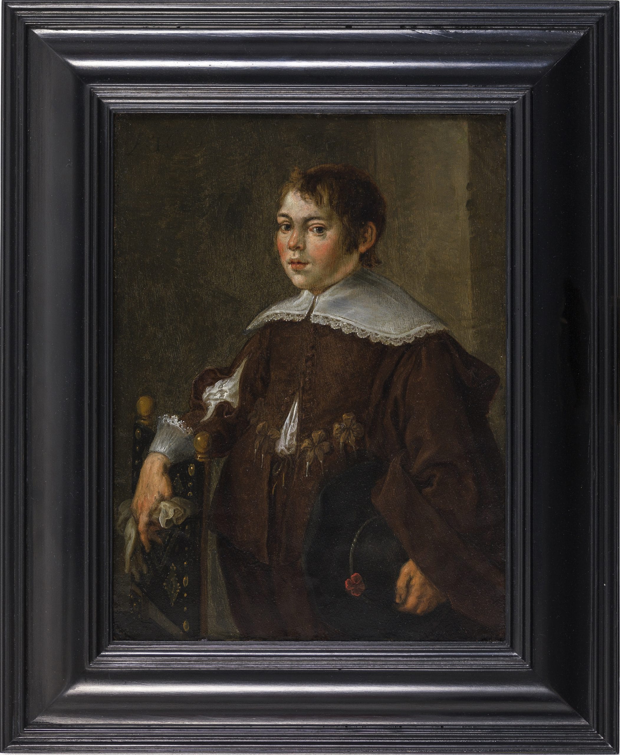 This charming and mysterious portrait shows a boy standing, his hand loosely holding a pair of gloves, casually leaning on a Dutch Renaissance chair upholstered with gilded leather. Despite the three-quarter length representation, showing the wealthy clothing of the boy, the painting is of small size, painted on copper.