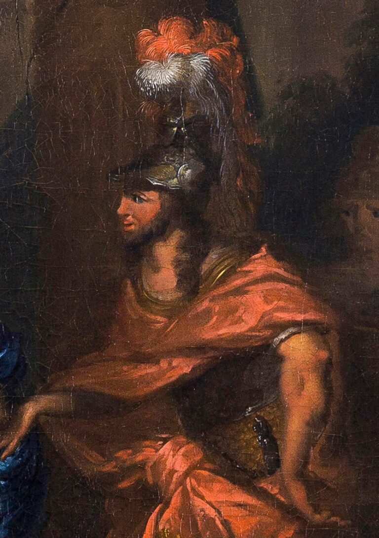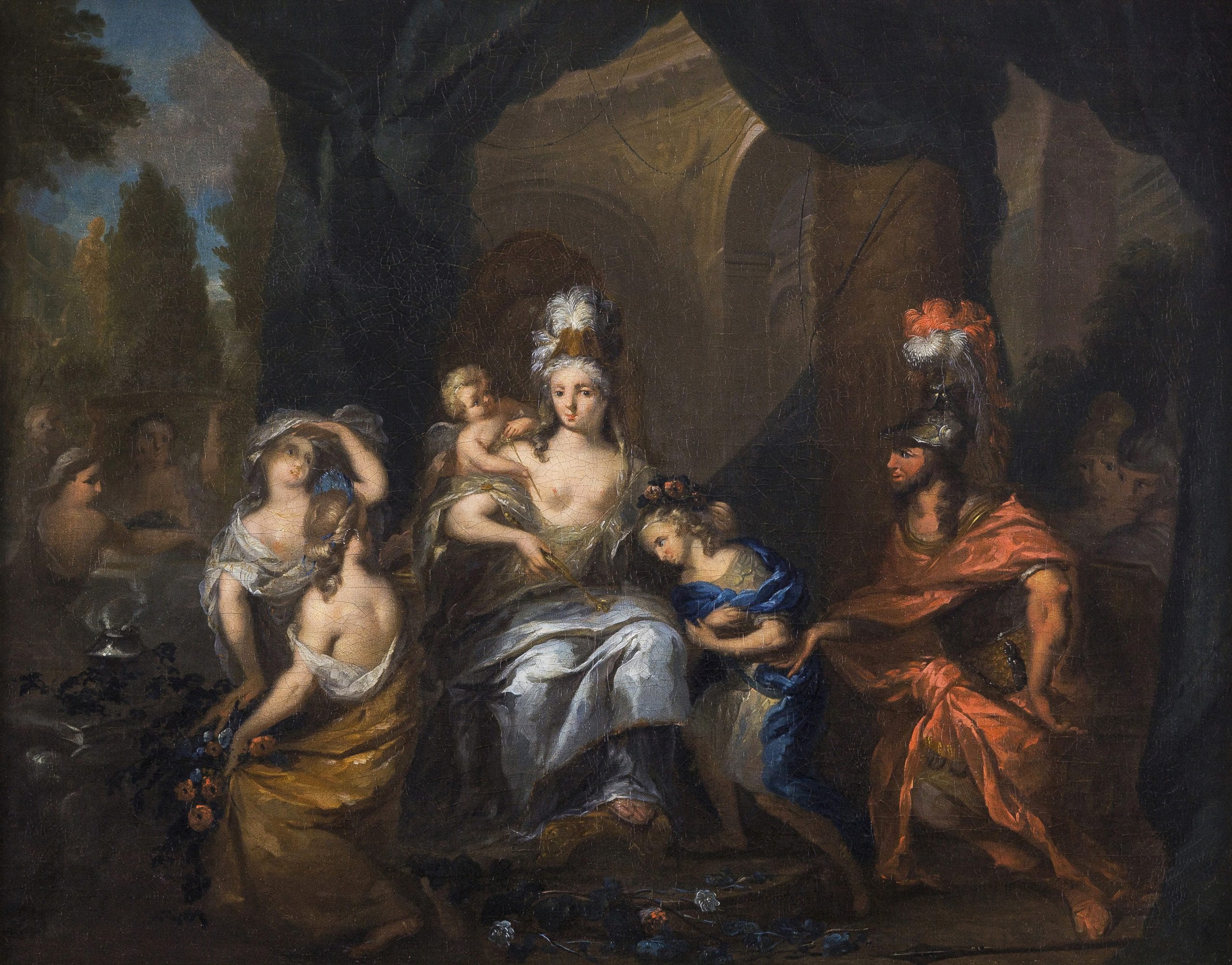 The subject of our well preserved painting is taken from the epic poem Aeneid, by the Roman author Virgil. The Trojan hero Aeneas, son of the Goddess Venus and mythical founder of Rome, is here presented at the court of the Carthaginian Queen Dido, on the North African coast. In order to keep a close eye on proceedings, Venus sent her other son Cupid, disguised him as Aeneas’s son Ascanius, who then made Dido and Aeneas fall in love. Elliger is known to have depicted scenes from the Aeneid on several other occasions.