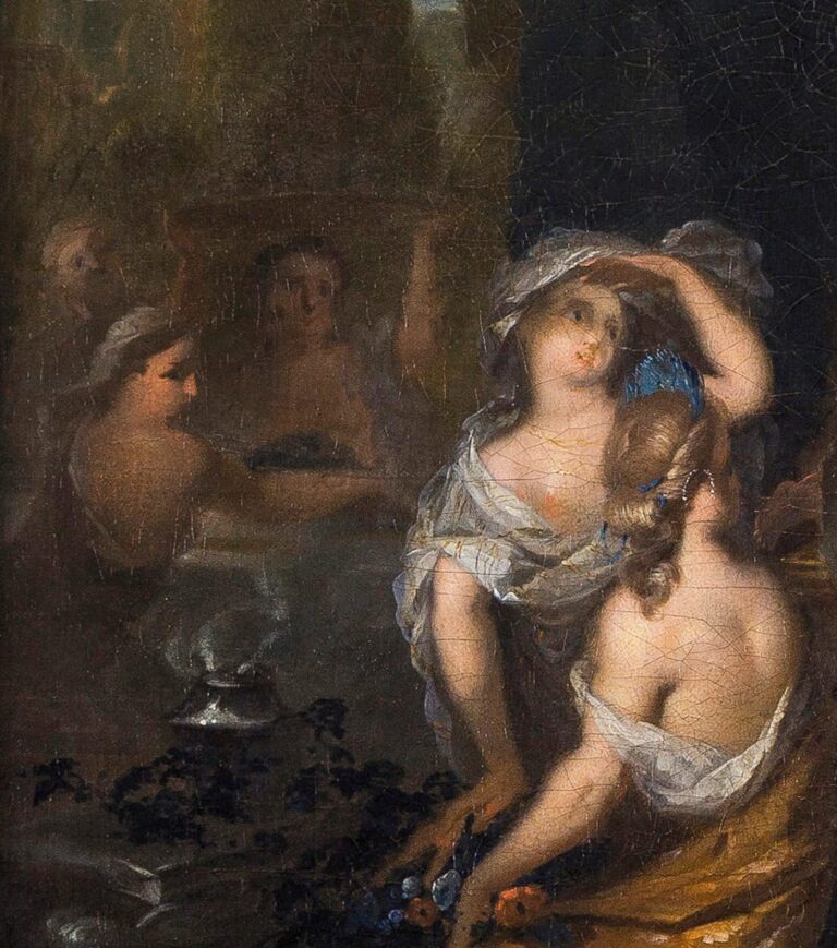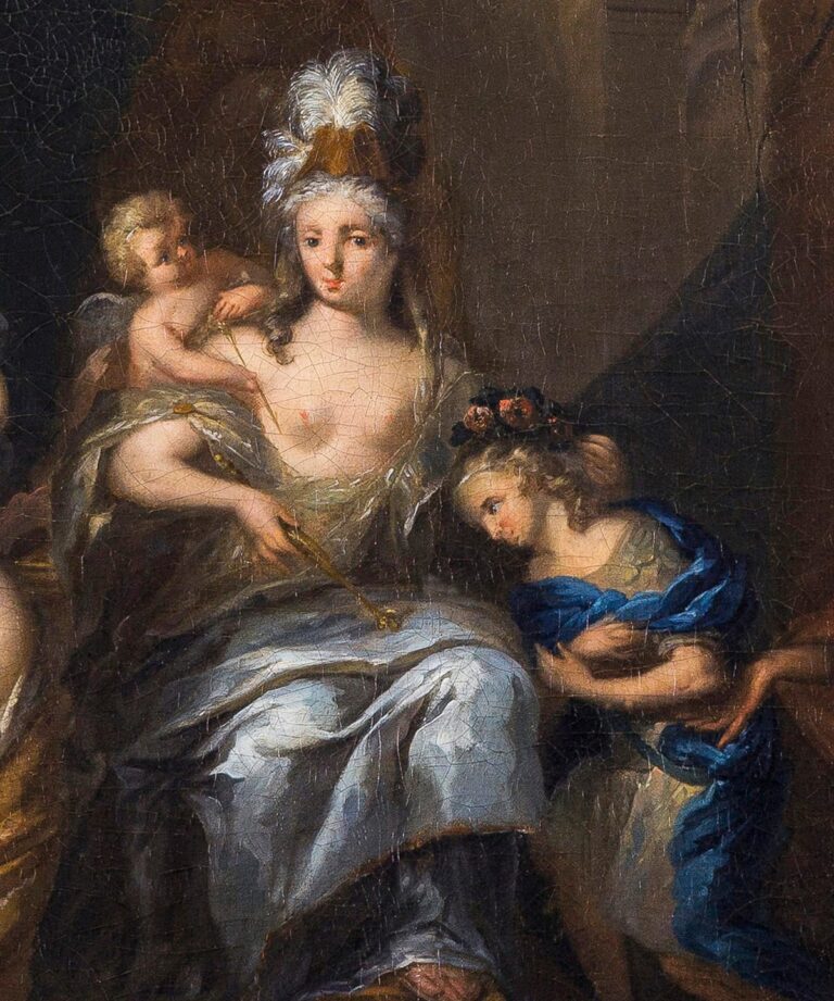 Although they were influenced by those of De Lairesse, the paintings by Ottomar Elliger have an entirely personal character, sweeter and more colourful than Lairesse. Elliger’s figures and faces are very characteristic, and handled the brush in a loose and spontaneous manner, more so than Lairesse’s clean Classicism. Elliger’s refined and elegant style proved highly popular. In 1716 he was attracted by Lothar Franz von Schönborn, Archbishop-Elector of Mainz and one of the leading princes of the German states, to work as his court painter. Dutch painters were especially valued at the princely courts of Germany, as they were considered the finest painters in the world.