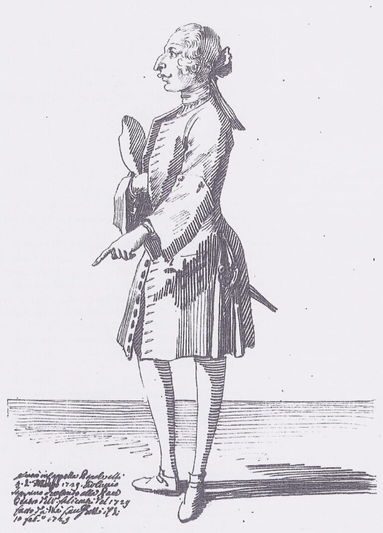 Born in Santa Vittoria in the Marche, Carlo Discreti was appointed soprano to the Cappella Giulia of St Peter’s in Rome on 1st September 1716, where he remained until April 1719.4 He then entered the Cappella Pontificia, patronised by Cardinal Ottoboni. Known as ‘Carluccio’, he also performed in female roles in the secular operas of Caldara and Scarlatti, as women were not permitted on stage in Rome. He died on 31st May 1760. Another caricature of Discreti by Ghezzi is known, dated 10th February 1729, in the Vatican Library (fig.).5 The Vatican sheet shows Discreti in male clothing.