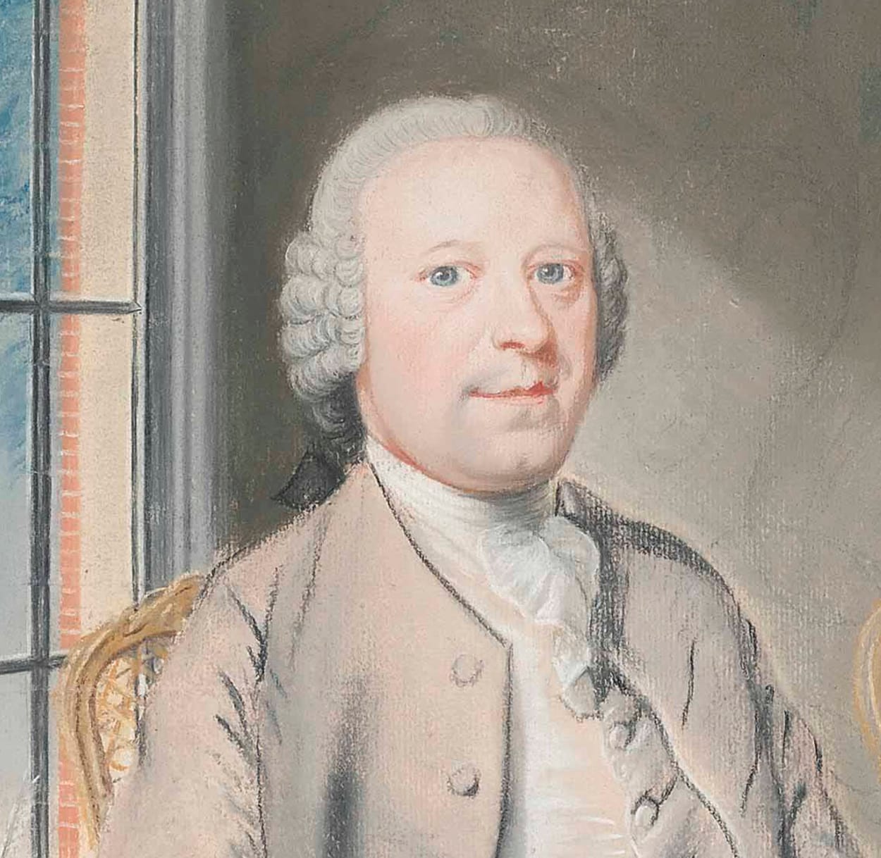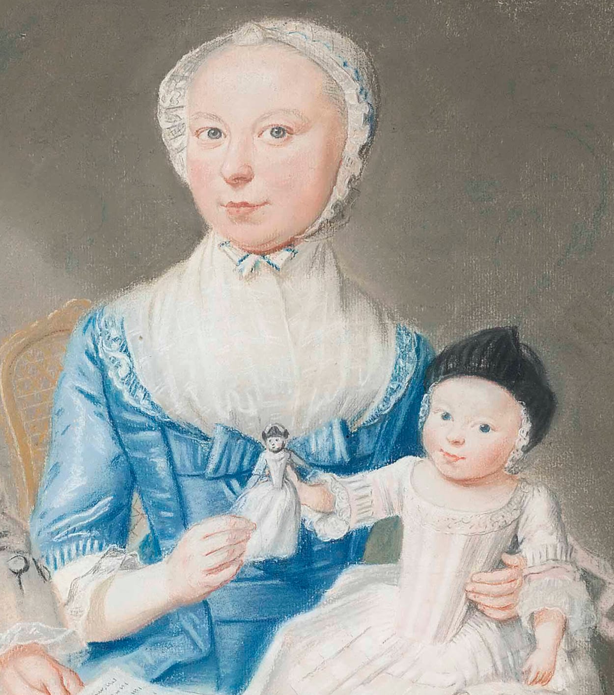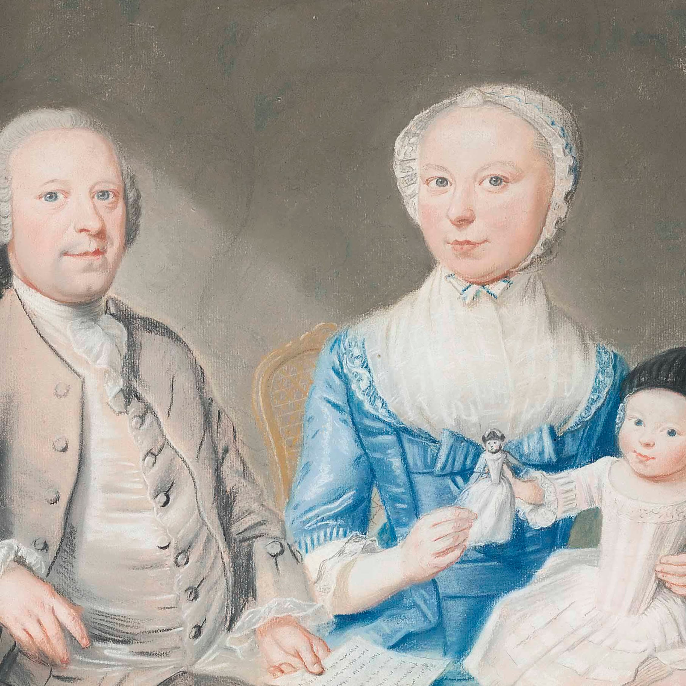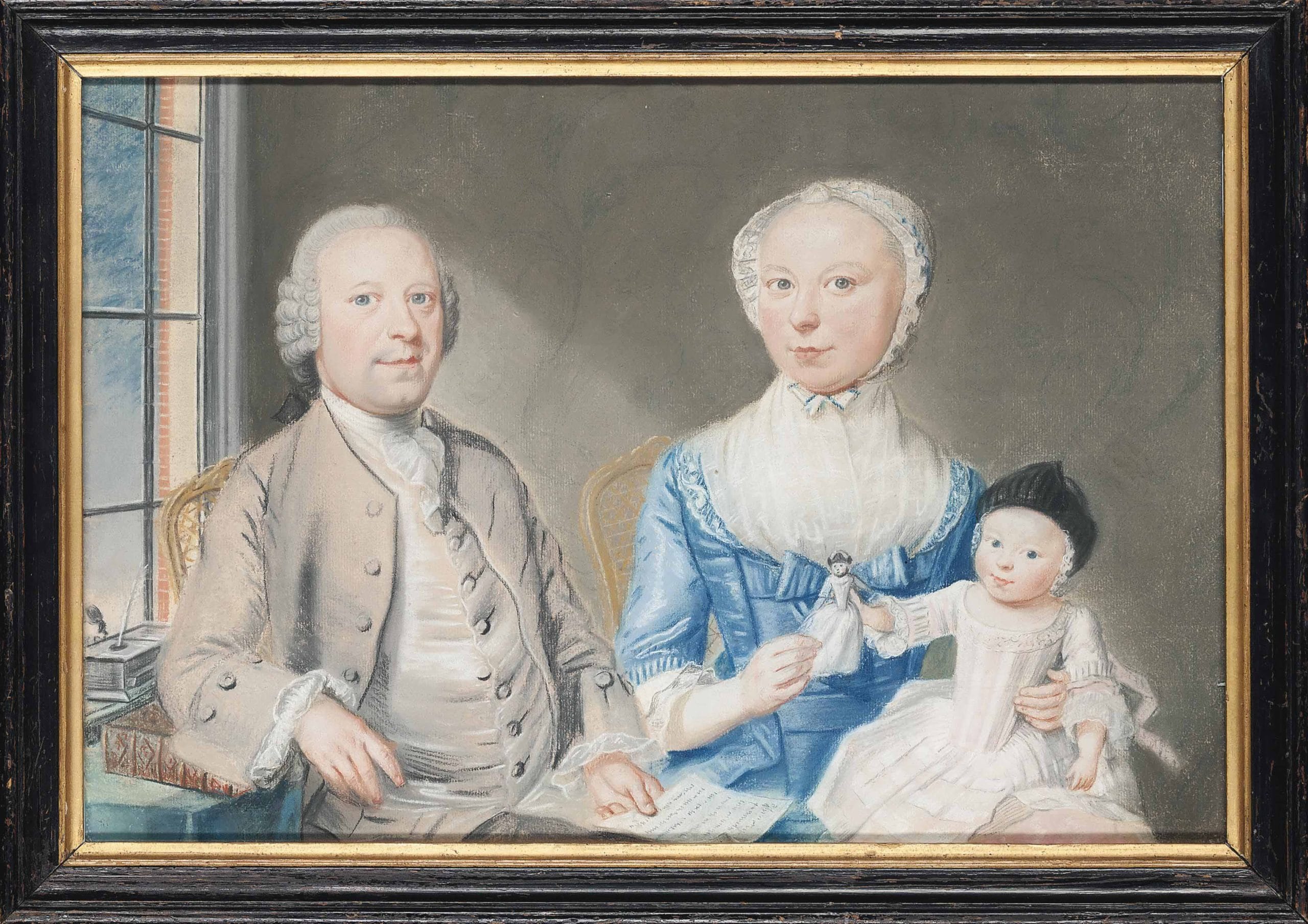 This enchanting pastel depicts the Johan Hendrik de Vlieger (1724–1806) and his wife, Anna Catharina née van Royen (1736–1783), together with their infant daughter Maria Cornelia de Vlieger (1767–1779), being handed a doll by her mother. Husband and wife are seated on chairs of Louis XV style against a background of wallpaper or fabric hangings decorated with a simple floral pattern. Johan Hendrik is seated near the window, with elegant narrow glazing bars – the red bricks are well observed, as is the ink stand with the feather quill and the letter in his hand.