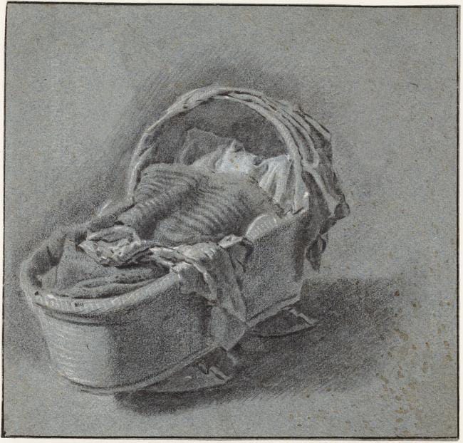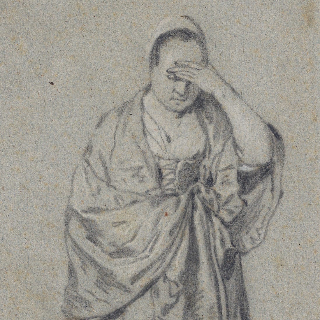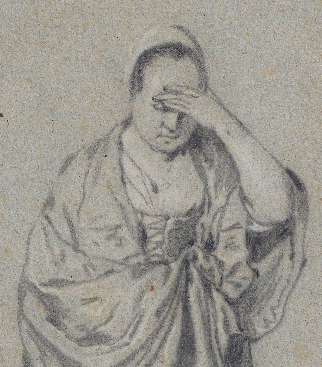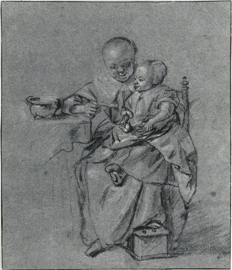As a draughtsman Van Slingelandt is perhaps best known for his carefully finished portrait drawings, sometimes on vellum, such as the portraits of an unknown husband and wife in the Rijksprentenkabinet, Amsterdam.3 In addition, a small group of studies in black and white chalk on blue paper is known, which includes the present intimate sheet. The art historian Dr Cornelis Hofstede de Groot, the former owner of our drawing, observed that they are similar to studies by Jacob Backer and Govert Flinck, whose work may have been known to Van Slingelandt. Our drawing can be compared to a Study of a Woman Feeding Porridge to a Child in Frankfurt (fig.),4 and also to a Study of a Cradle from the Van Regteren Altena collection, now in the Fondation Custodia, Paris (fig.).5 The attribution to Slingelandt was first proposed by Hofstede de Groot, who noted the familiarity to figures in kitchen pieces by Slingelandt.6