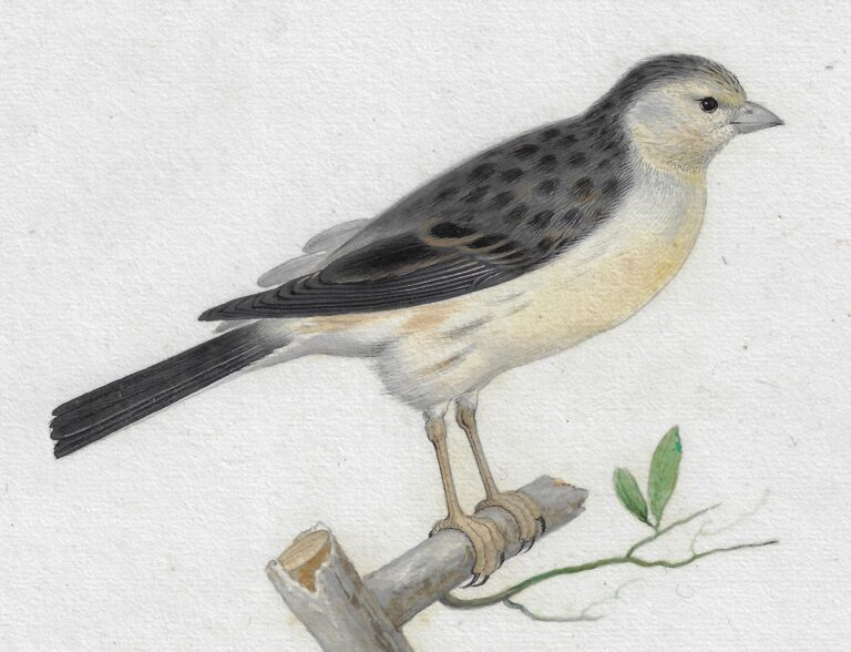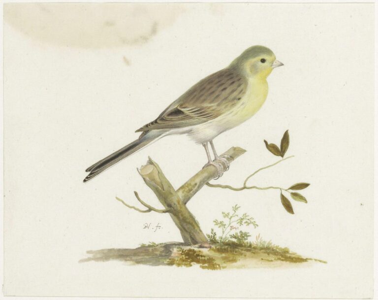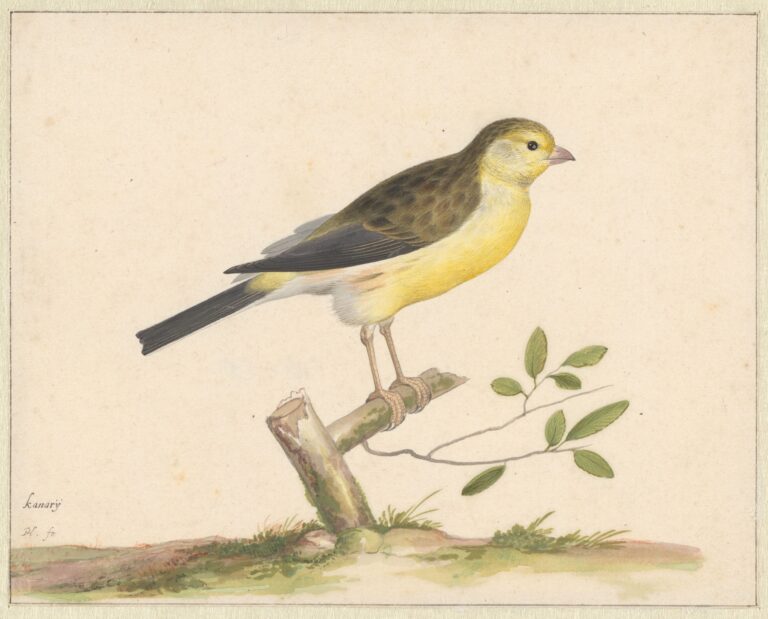 An album with a large group of approximately 150 drawings of birds, reptiles and other animals is preserved in the Noord-Hollands Archief in Haarlem, bequeathed in 1888 by Adriaan Justus Enschedé.2 A nearly identical depiction of a canary bird is part of this collection, also sitting on a branch, thought to have been drawn circa 1656-1667 (fig.).3 Yet another very similar watercolour is preserved in the Rijksprentenkabinet of the Rijksmuseum, thought to depict a wild or island canary bird, originally from the Canary Islands, part of the volière belonging to Prince Maurits of Orange in The Hague, where Holsteyn could have studied it (fig.).4 Although the birds are nearly identical in our drawing and those in the Noord-Hollands Archief and the Rijksprentenkabinet, Holsteyn varied the leaves of the branch and the indication of a natural setting underneath. As with the sheet in Haarlem, drawings like these were probably original made in sets, contained in albums, collected by amateurs of natural history.5