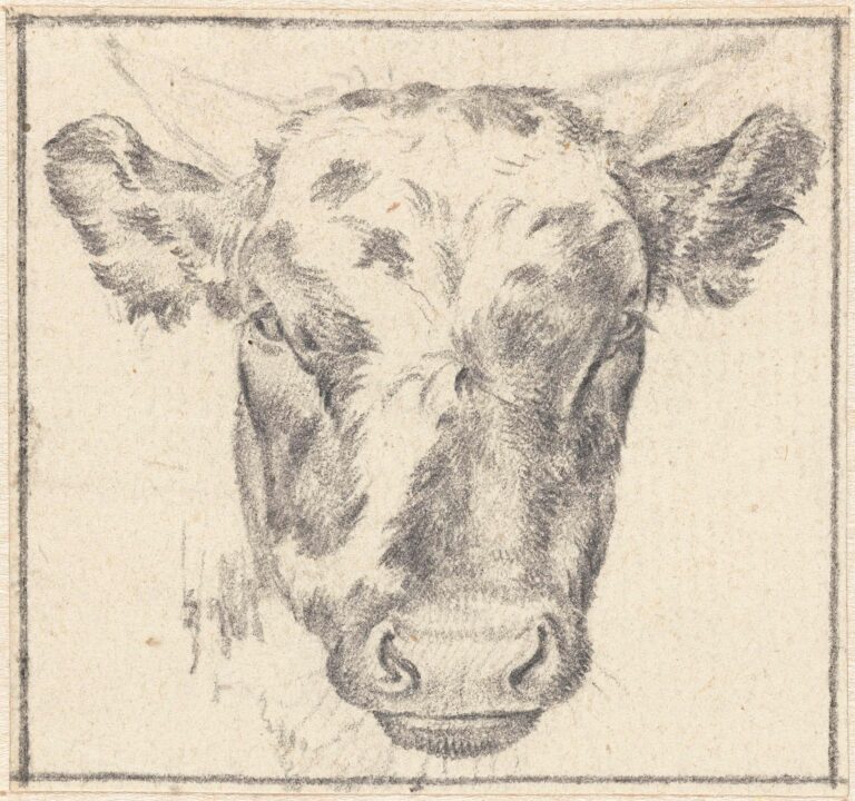 At least two other drawings of dogs by Janson are known from a historic sale catalogue, executed in graphite on vellum.7 Our drawing on blue paper could almost be a study for one of Janson’s most iconic etchings, the Seated Partridge Dog (‘patrijshond’) (fig.).8 A study of a calf’s head in comparable precise technique is preserved in the Rijksprentenkabinet, Amsterdam (fig.).9