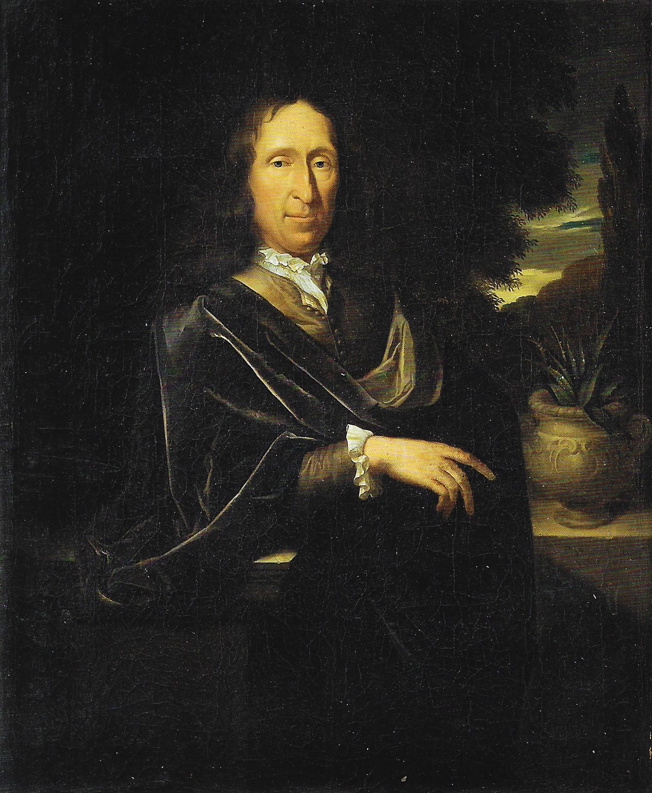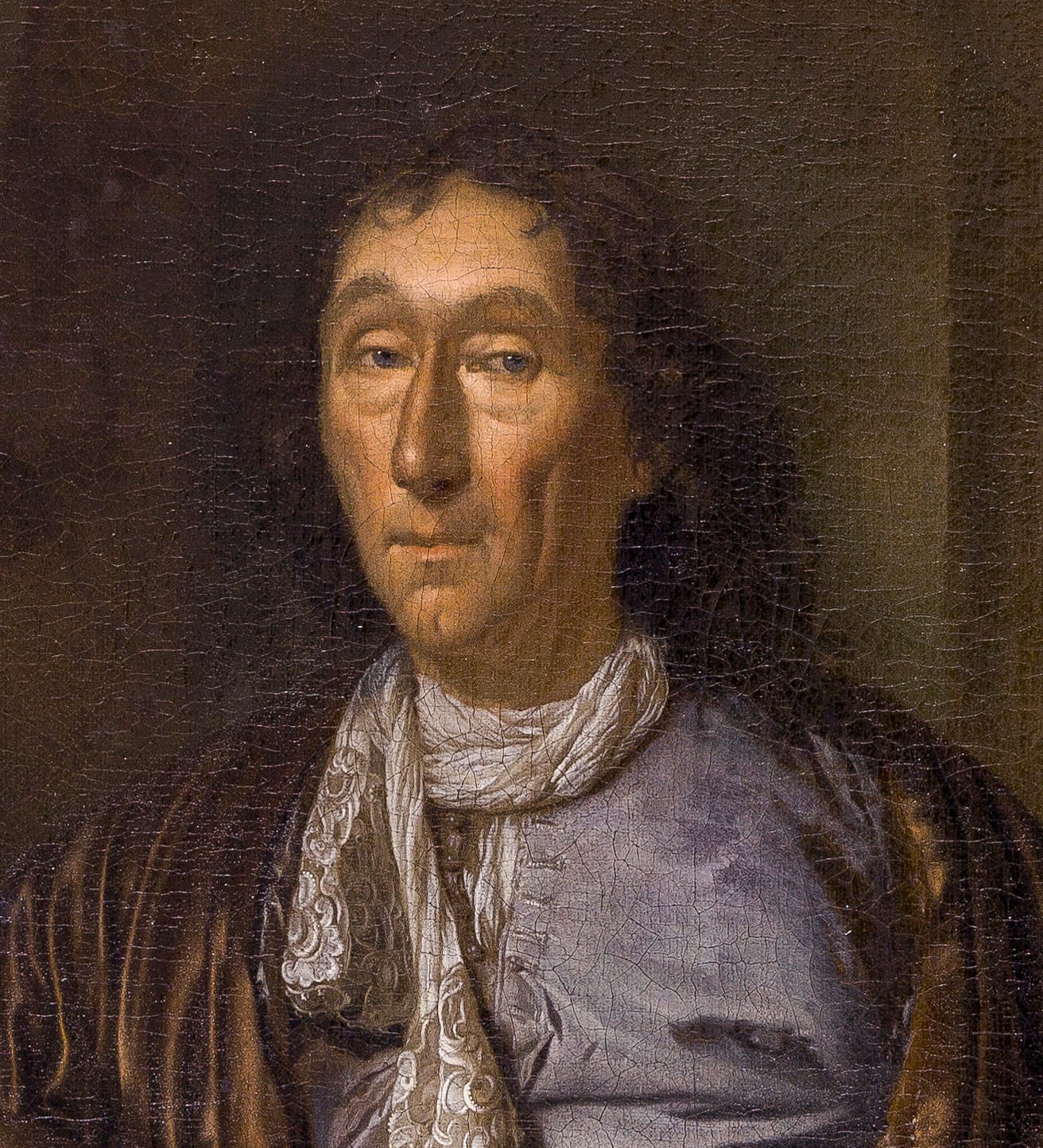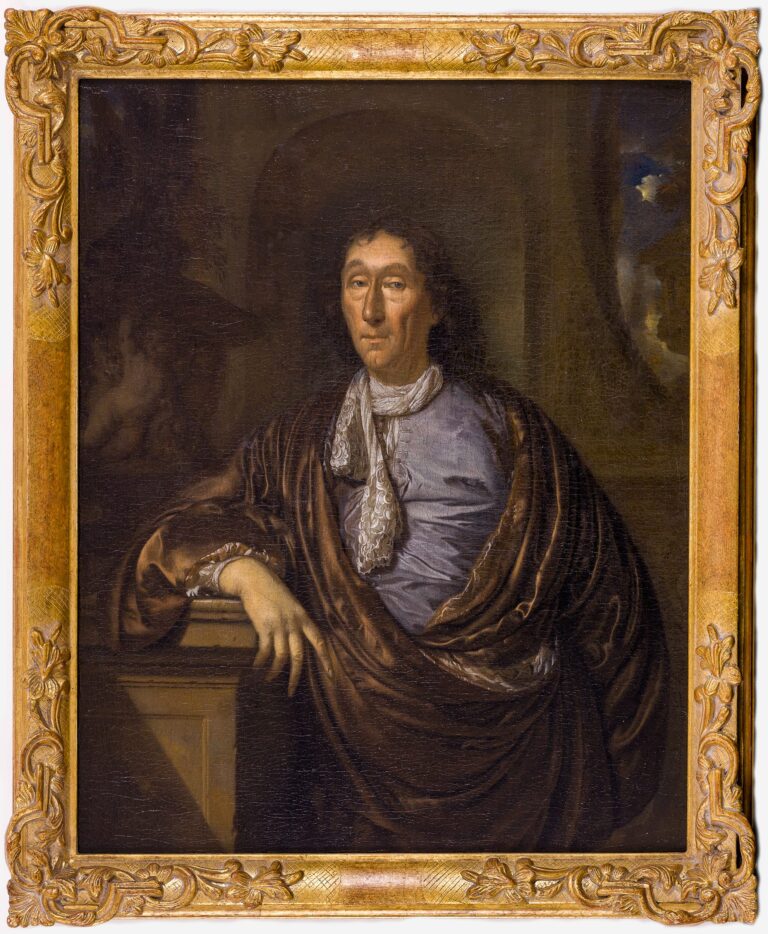 Casually yet elegantly dressed in a loose house coat of expensive material, with a slightly dishevelled white lace neck scarf, a mature gentleman intelligently observes the beholder, a touch of mischief in his eyes. Although his clothes are manufactured from the costliest fabrics, he wears them with nonchalance, and has something of the air of a scholar. The architectural background, arm casually leaning on a stone plinth, places the as yet unidentified sitter in the highest echelons of Dutch society, where Pieter van der Werff found his clients.