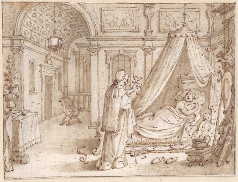 The present drawing is one of a series of at least sixty-five drawings illustrating Virgil’s epic the Aeneid, which were first attributed to Vrancx by Ruth Muthmann and Andrew Robison in 1983, and are fully discussed by Louisa Wood Ruby in 1990.1 In some of the surviving drawings from the series, the image occupies the upper half of the sheet, while below there are some lines of text the scenes illustrate. A cluster of drawings which remained together until 1981 lacked the texts, and it is likely that the present sheet was part of that group. Dr Wood Ruby dates the series c. 1615, and points out not only that they constitute the most extensive series of Aeneid illustrations since Sebastian Brandt’s series of 1502, but also that the rhymed Dutch paraphrasing of Virgil’s text which appears below some of the images does not correspond with any published translation of the original, and may indeed represent Vrancx’s own attempt at a new translation. Vrancx’s lively interest in classical literature is not only evidenced by the existence of the Aeneid series, but also by his membership of ‘Die Violieren’, one of the Chambers of Rhetoric in Antwerp.
